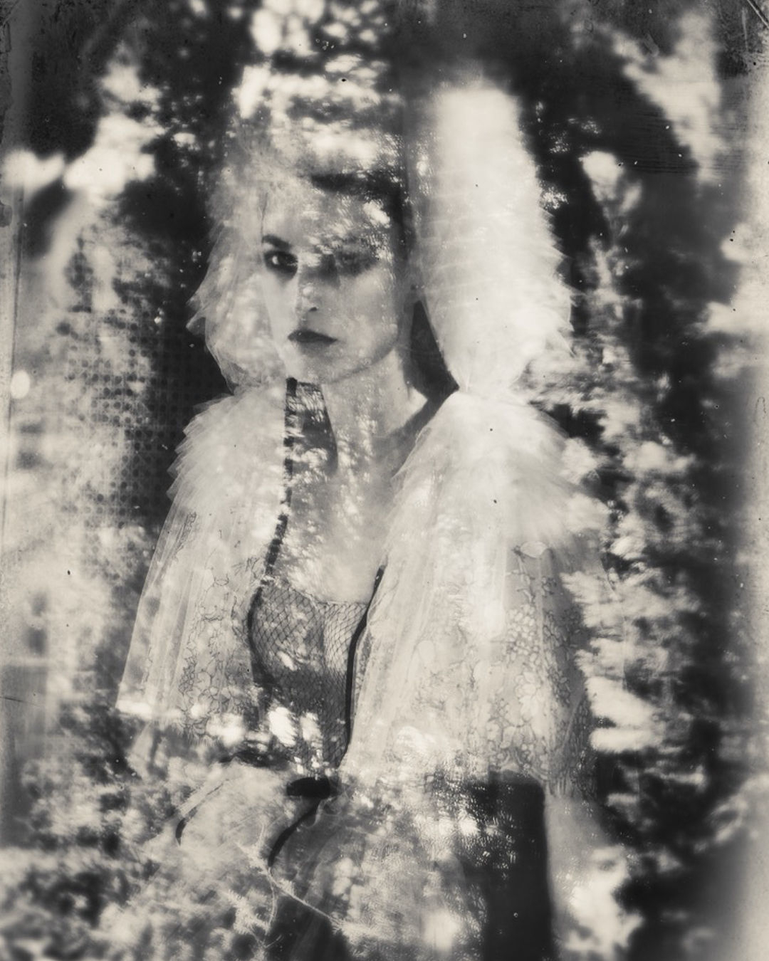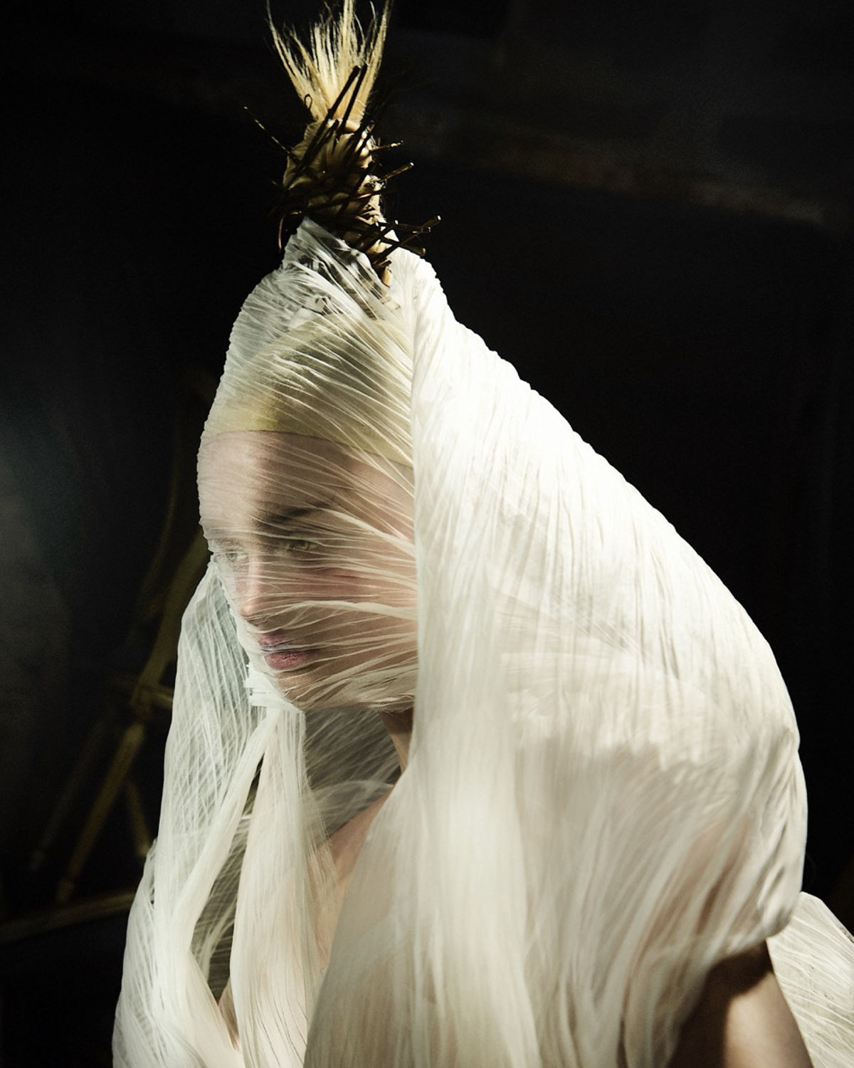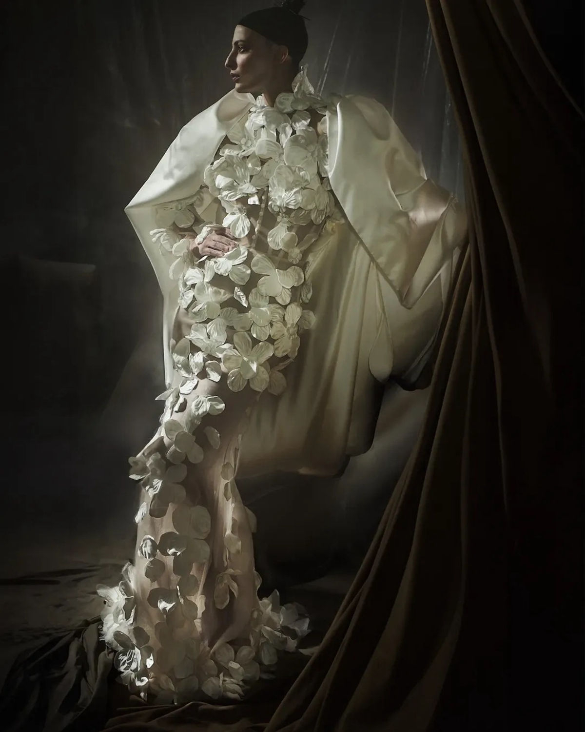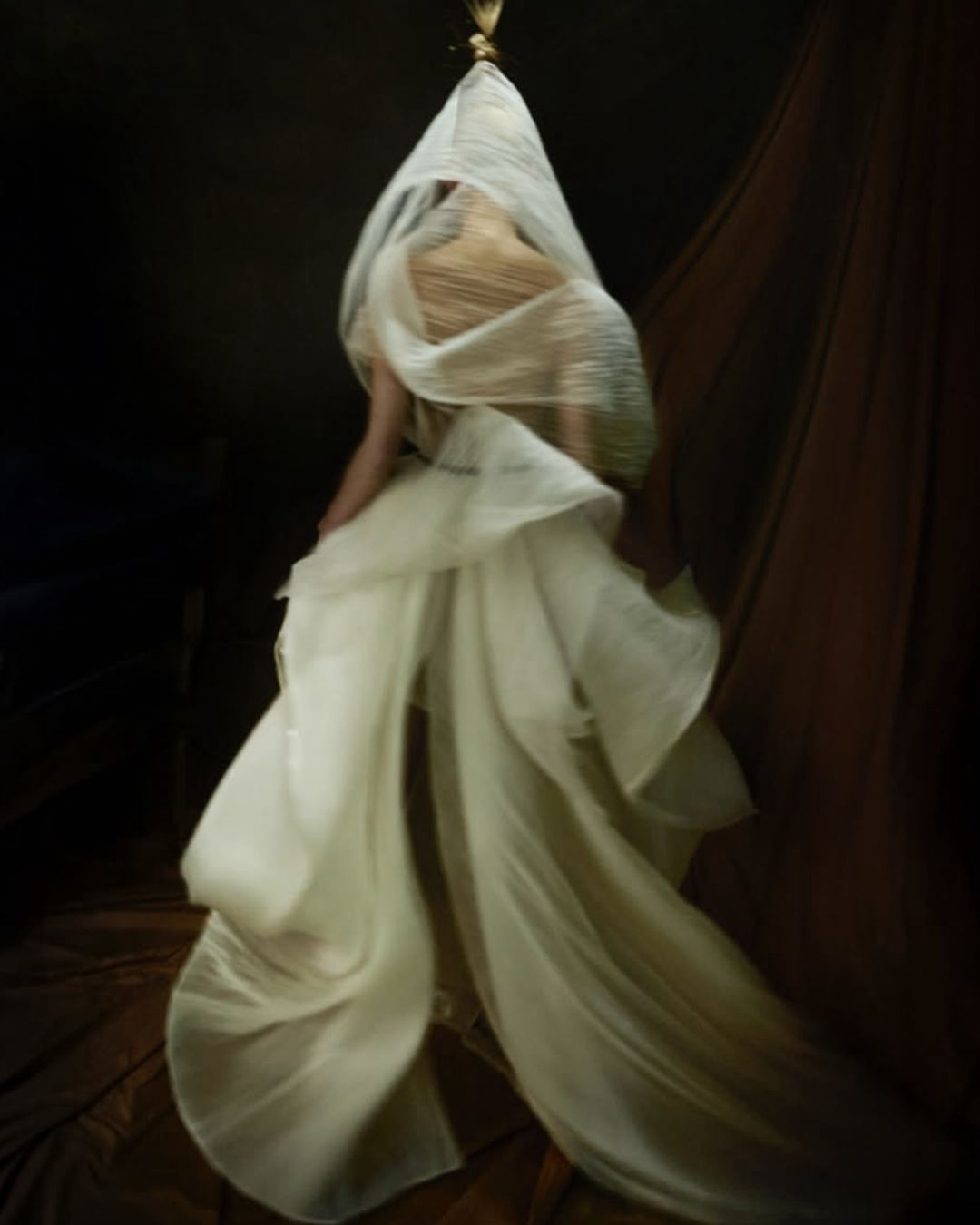 Like a wildflower blooming in forgotten corners, the bride appears not in the spotlight, but in shadows, reflections, and flickers of movement—her presence subtle, but the garments unmistakable. In this moody, cinematic light, each piece is allowed to speak for itself: the sculptural pleats, the sheer veils, the textural layers that shift and shimmer with every step. The styling doesn’t demand attention—it draws you in.