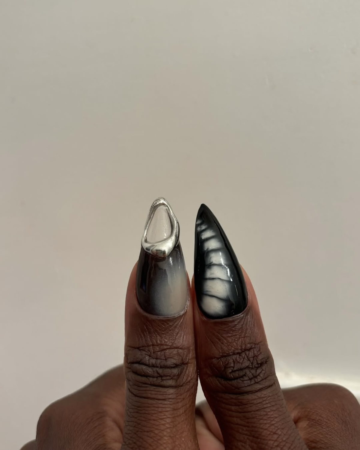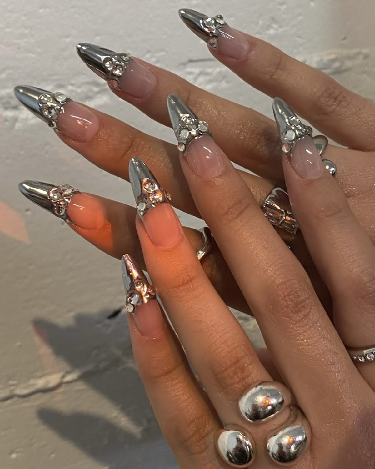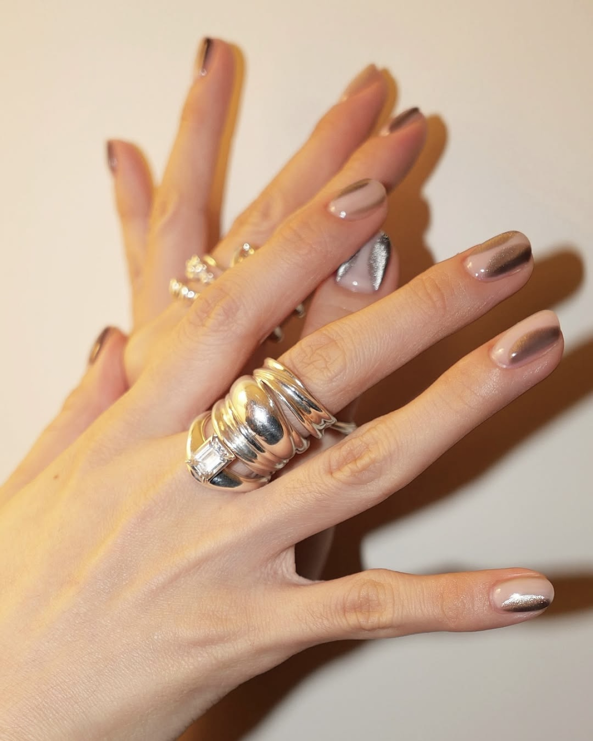 From polished silver tips and subtle metallic lines to gleaming foil and chrome effects, these accents bring a bold yet elegant vibe. Silver details are incredibly versatile, offering a cool, futuristic shine to both minimalist nudes and striking bold shades. Elegant and lustrous, silver elements elevate nails with a touch of understated glamour – an ideal way to ring in 2026 with style.