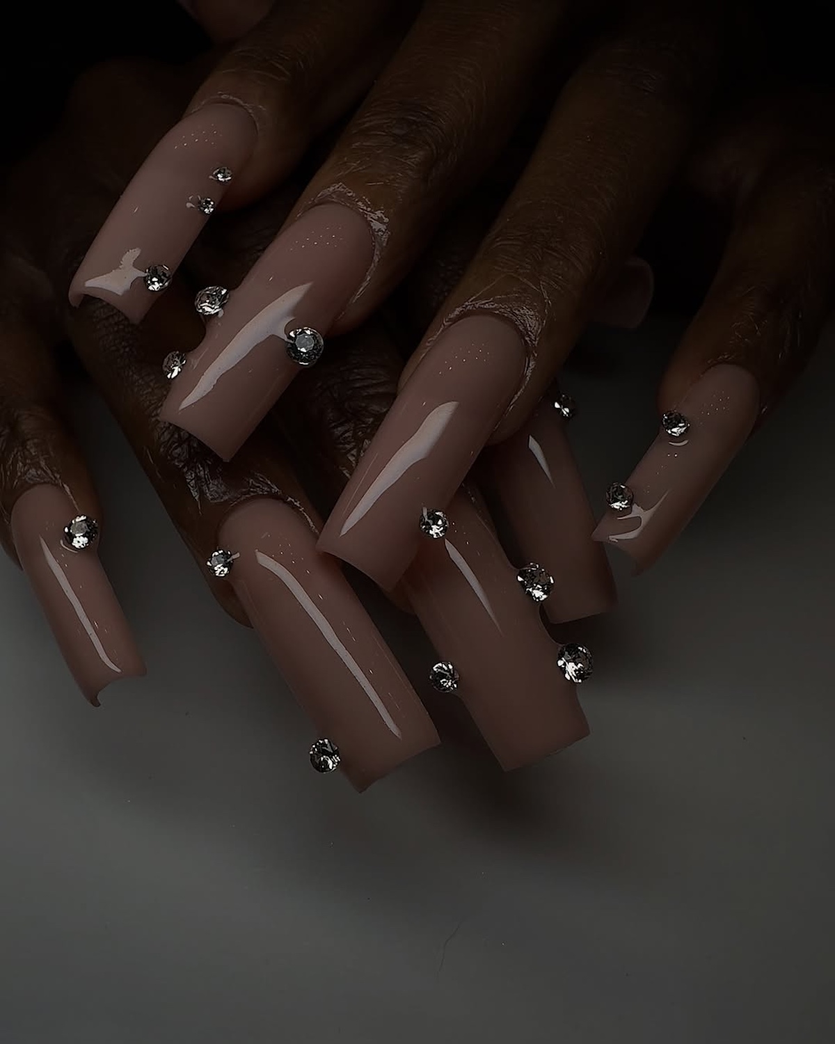 Whether you prefer neutral tones, soft pastels, or monochromatic color schemes, minimalistic nail designs are versatile and timeless, making them a perfect choice for celebrating. Opt for a single color manicure in a muted shade to achieve a minimalist look. Whether you choose a soft gray, dusty rose, or muted lavender, a monochromatic color scheme creates a sleek and polished appearance that complements a wide range of New Year's Eve outfits. Explore minimalist nail art featuring clean and geometric shapes, stones and chains. This can include simple triangles, squares, or clean lines to create an artistic look that conveys a sense of modern elegance and sophistication, making it an ideal choice for celebrating the new year with a stylish and chic manicure.