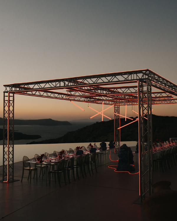 Envisioned and brought to life by the talented planner and stylist Gigi & Roses, this extraordinary shoot at the stunning Grecian estate of Erosantorini showcases a visionary fusion of modernity and romance. At the heart of the avant-garde concept sits a large-scale, structural LED installation that creates an ethereal ambiance, seamlessly transforming the venue’s natural splendor into a dreamscape—futuristic, yet everlastingly captivating.