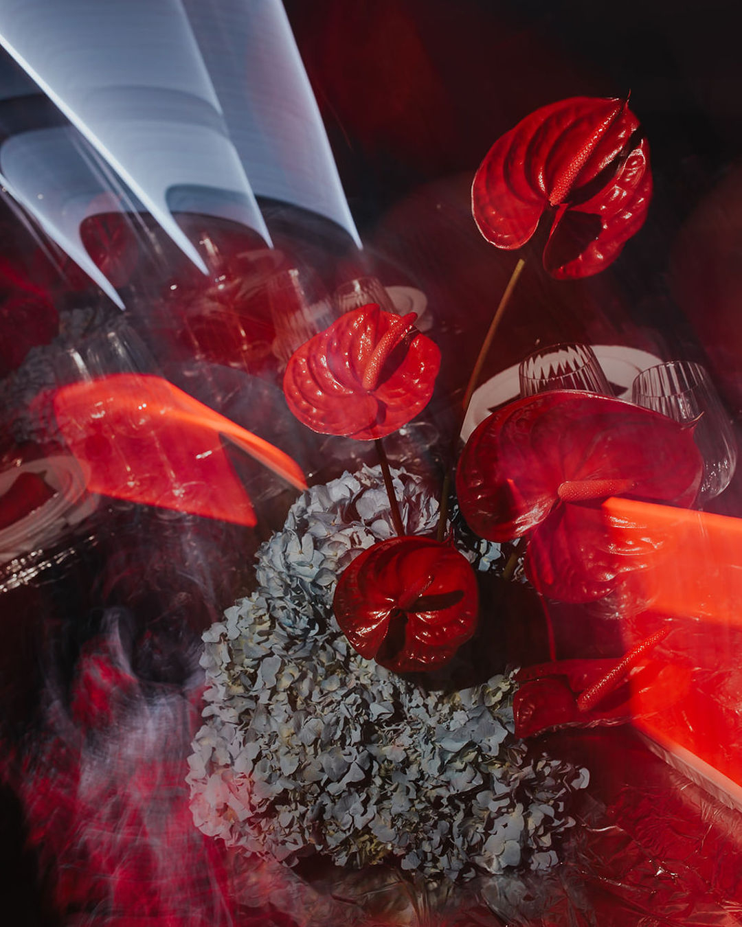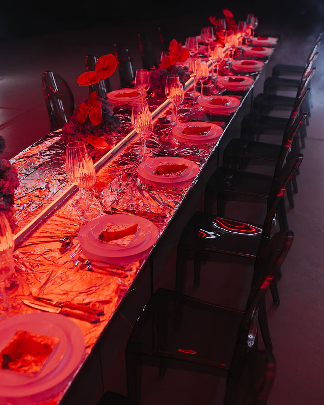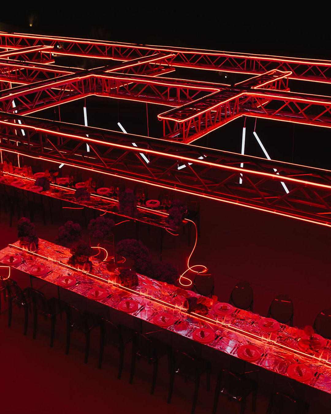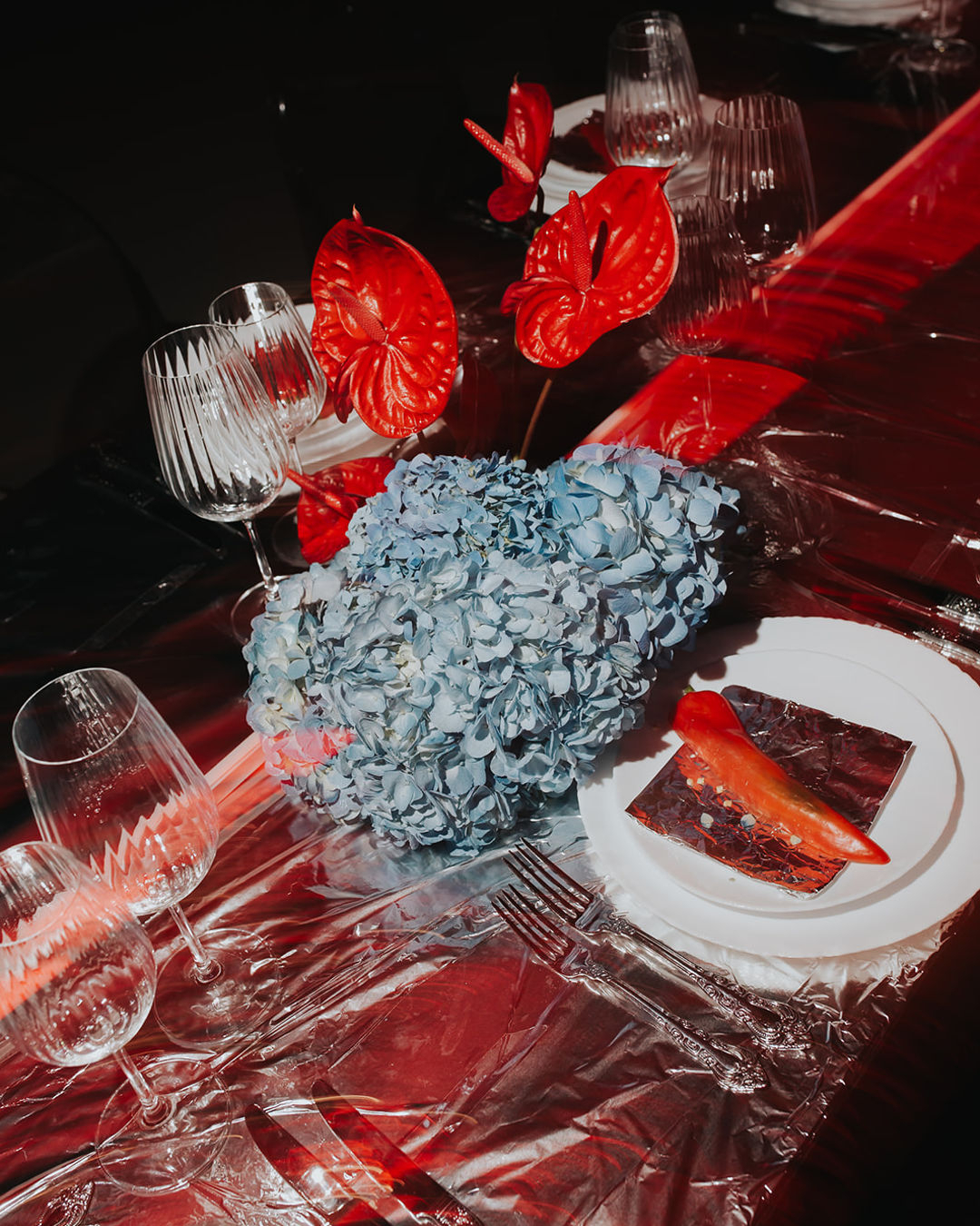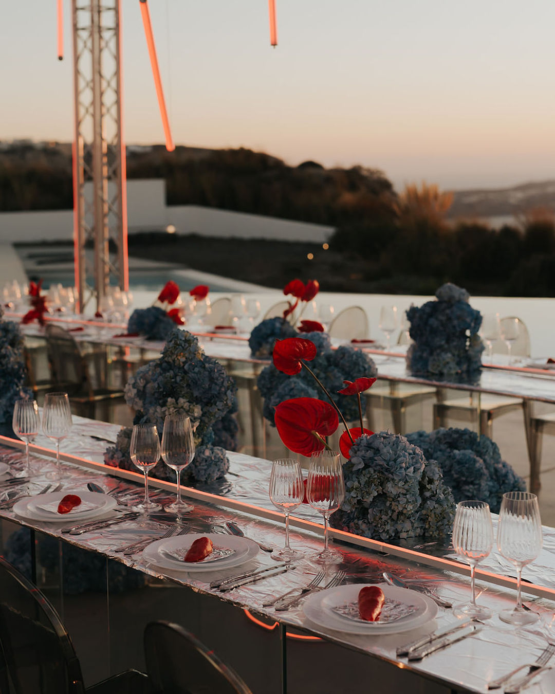 Featuring foil-covered tables and a vibrant palette of red and light blue florals, the styling masterfully intertwines cutting-edge materials with sleek, neon-light compositions. The result is a visual experience that feels both bold, fresh, and romantic. Together, these elements create a dynamic contrast, forging a cohesive and refreshing narrative that reinvents the art of wedding design.