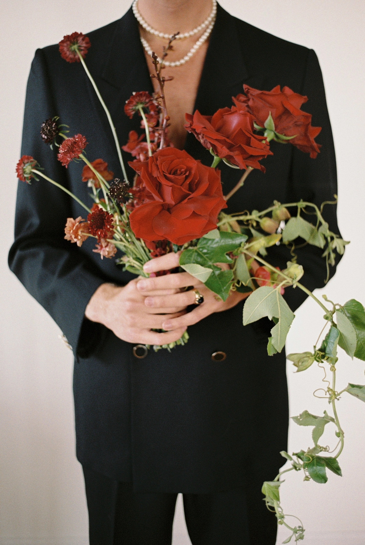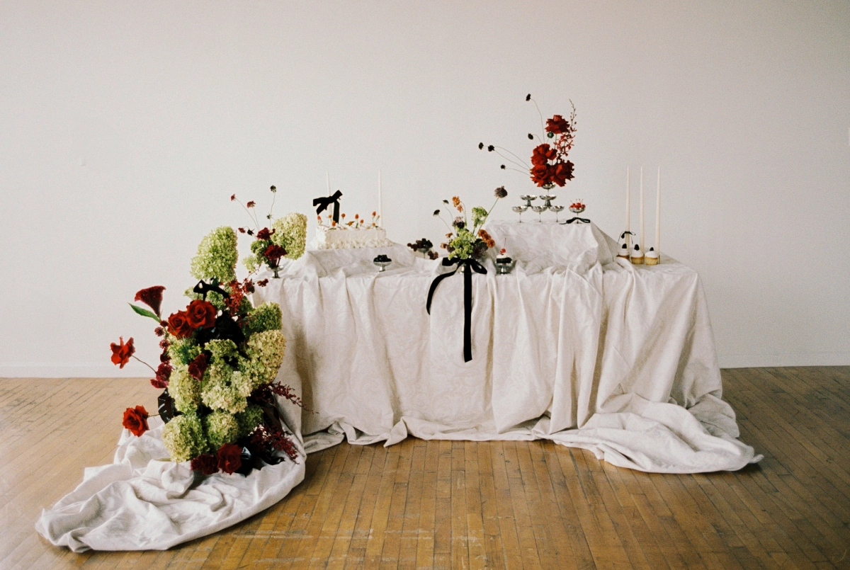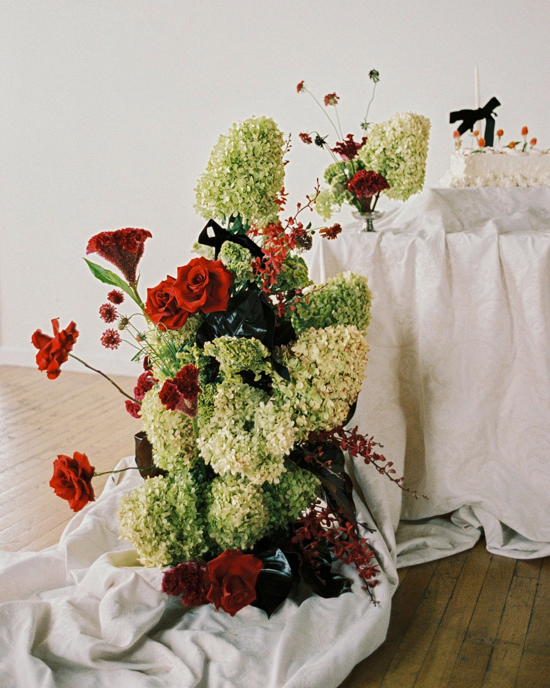 In her most recent styled shoot, THE WED photographer Angelika Dupuis blends French fashion vibes with the vibrant energy of Brooklyn. Dark tones, lots of texture, fashion-forward designs, and outfits are featured. The creative inspiration centers around reintroducing dark colors — different shades of red and green, while also using white and texturized linen from France to evoke a Marie Antoinette aesthetic. For this shoot, Angelika collaborated with a team of talented creatives who shared the same vision as her. Together, they wanted to speak to fashion-forward, bold, and elegant New Yorkers and give them a French touch.