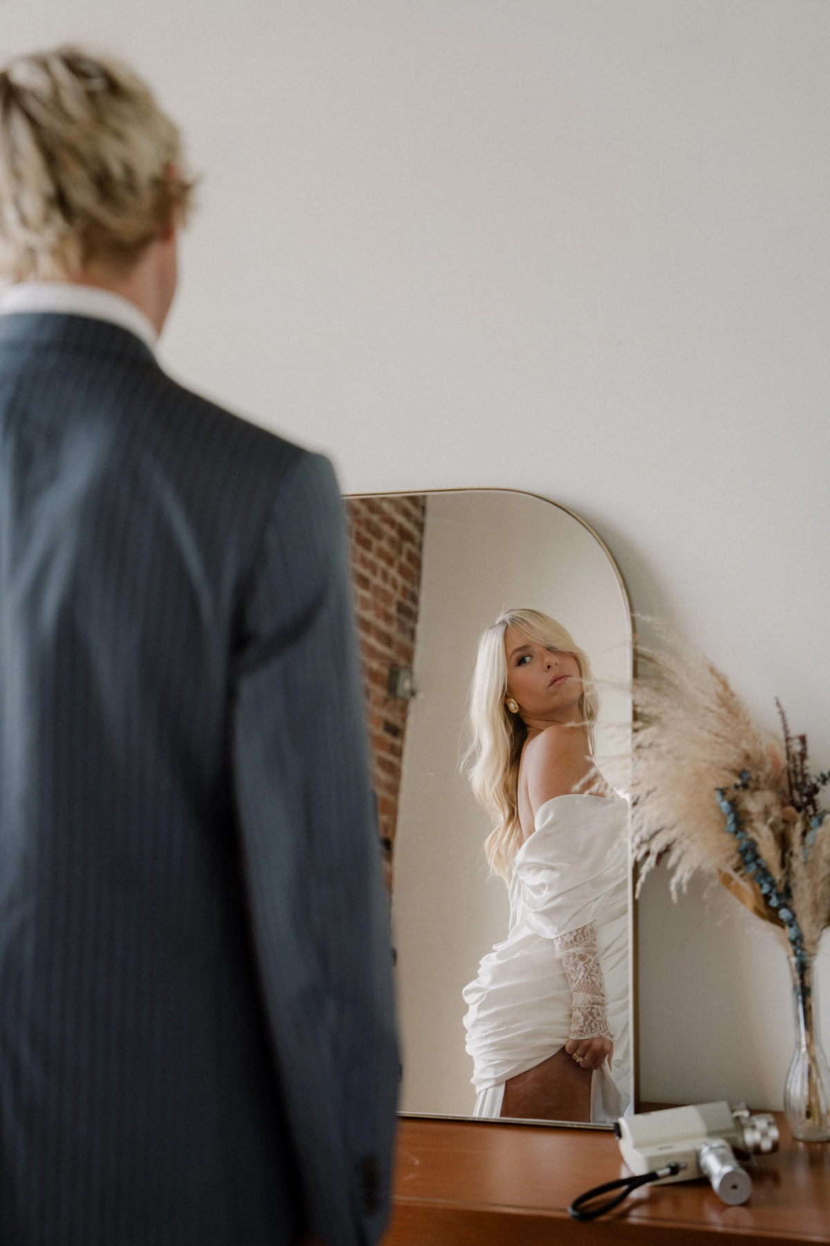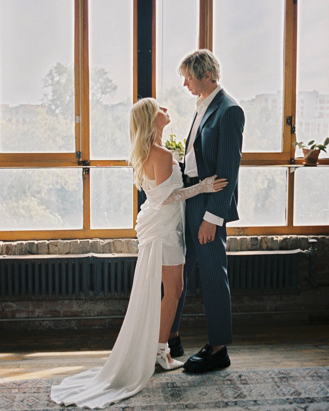 Fashion played a significant part in the shoot. Brody, the groom, personally worked on his outfits, as a brand designer. The bride, Kennedy, who is also part of the fashion scene, opted for two stunning dresses. The Yves Saint Laurent dress, featuring a black flower, seamlessly created a link to the table and the overall design vibe. The second dress, a Jacquemus piece paired with oversized sleeves, was a perfect match for capturing shots in the Casino and on the lively streets of NYC.