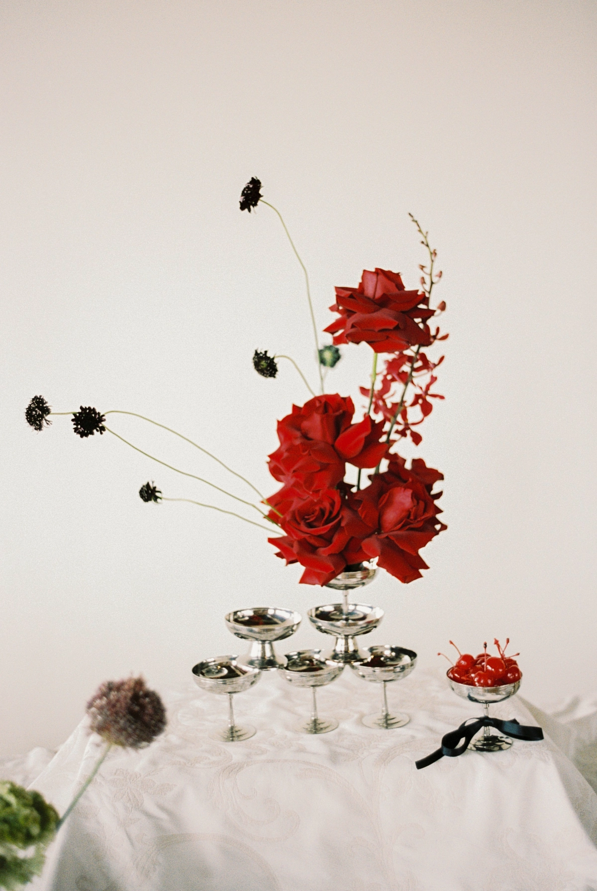 Angelika and the team made floral designs the focal point of the overall aesthetic, paying meticulous attention to every small detail to highlight the colors of the flowers and to bring them alive. They also brought ice cream scoops from France to create the sensation of texture and height. Red cherries, flowers, and black ribbons were also incorporated to further enrich the table design with contrasting elements.