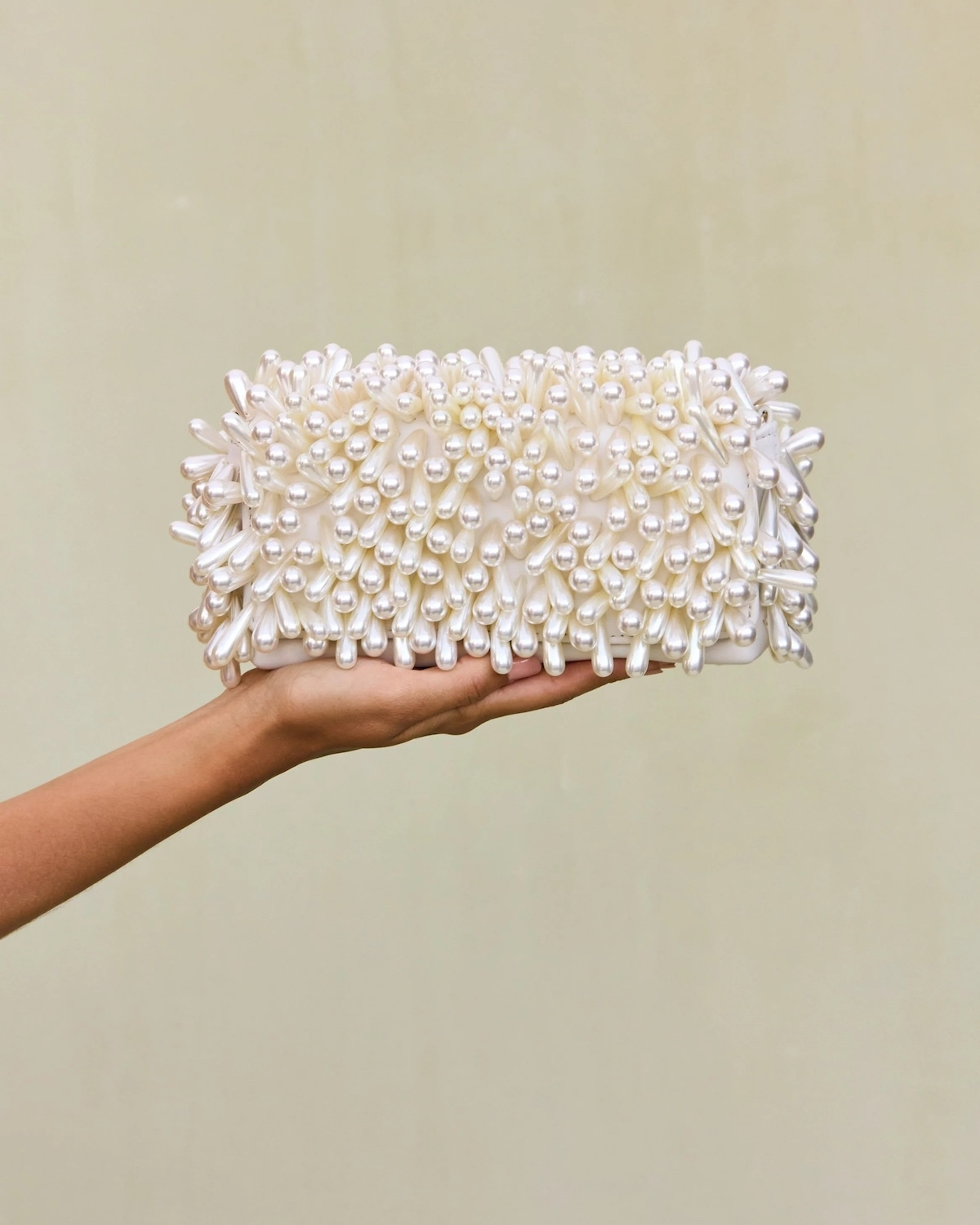 Less sparkle, more shimmer—these sculptural bags call to mind mermaid tails and sunlit shells with their lumiscent detailing. Made from mother-of-pearl, resin, or pearlescent embellishments, they catch the light with every step. Whether slung over the shoulder or tucked under your arm, they offer a bridal statement that’s both tactile and tide-inspired.