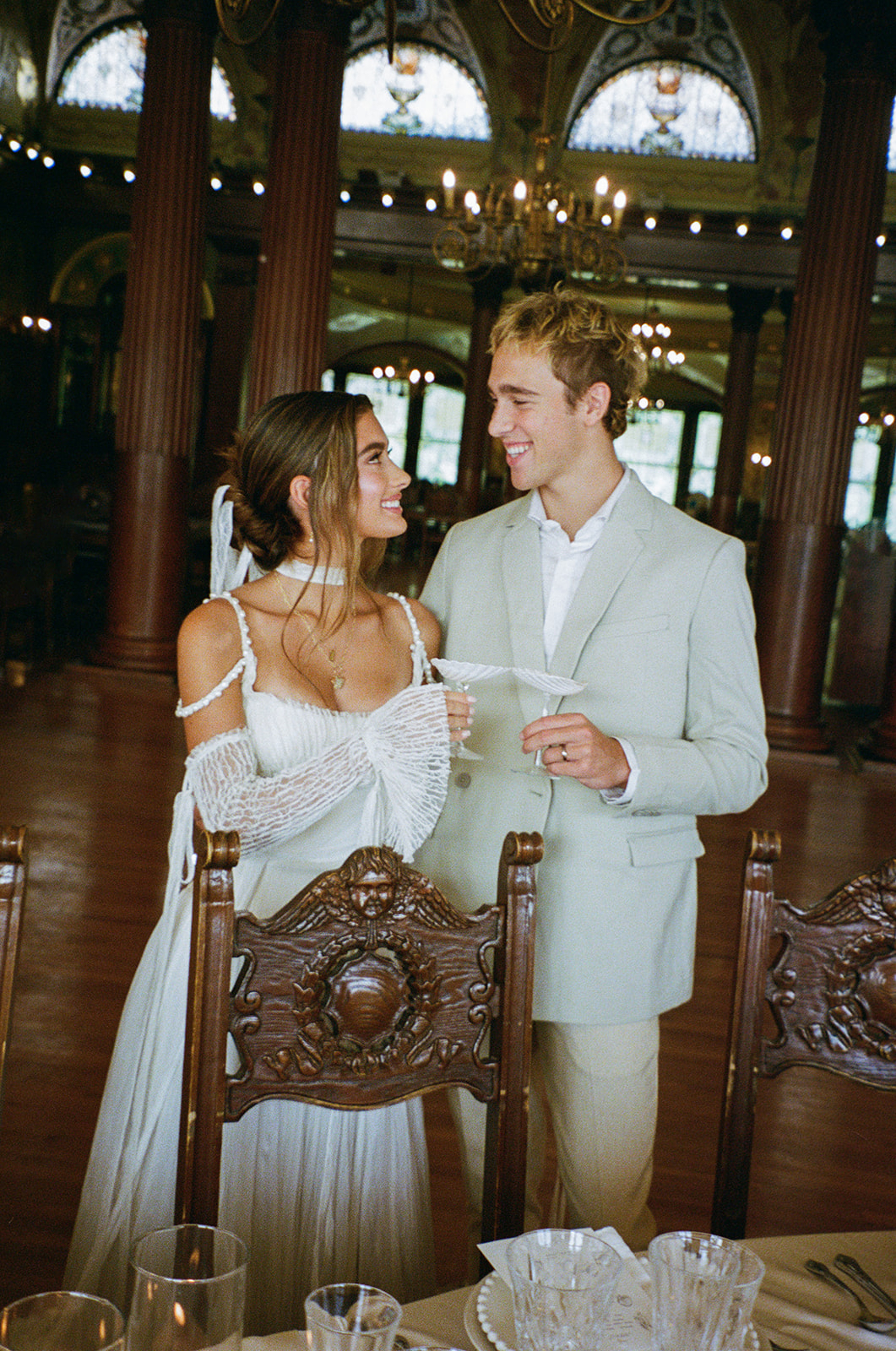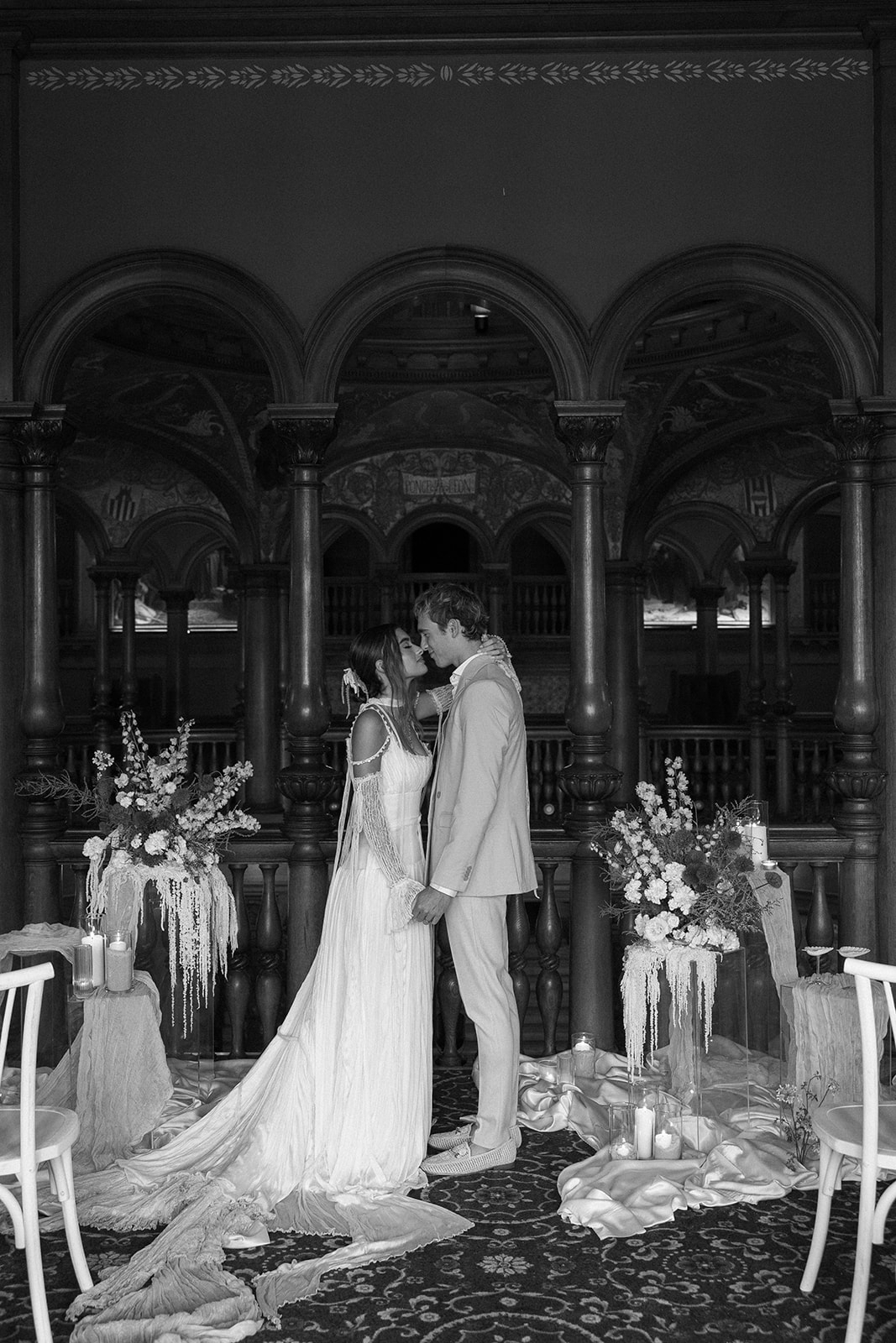 Stefanie Keeler immortalizes an editorial shoot that merges the vast allure of the sea with the vintage charm of Flagler College's Ponce de Leon Hall. Nestled in the heart of the nation's oldest city, this shoot pays homage not only to the coastal allure but also to the historic legacy of a hall that dates back to 1888. As delicate shell motifs emerge, representing symbols of enduring love and strength, they echo the tales of timeless romance that the hall has witnessed over the centuries. The designs, while steeped in antiquity, burst forth with a fresh, modern touch. Unique elements, such as Emily Musgrove's custom line art, amplify the narrative's depth. Further, the choice of vibrant florals, reminiscent of coral reefs, coupled with the bride's elegantly crafted Cinq gown, paints a vivid picture. It's a story of a love as deep, vast, and enduring as the ocean, told against a backdrop that marries historic charm with contemporary elegance.
