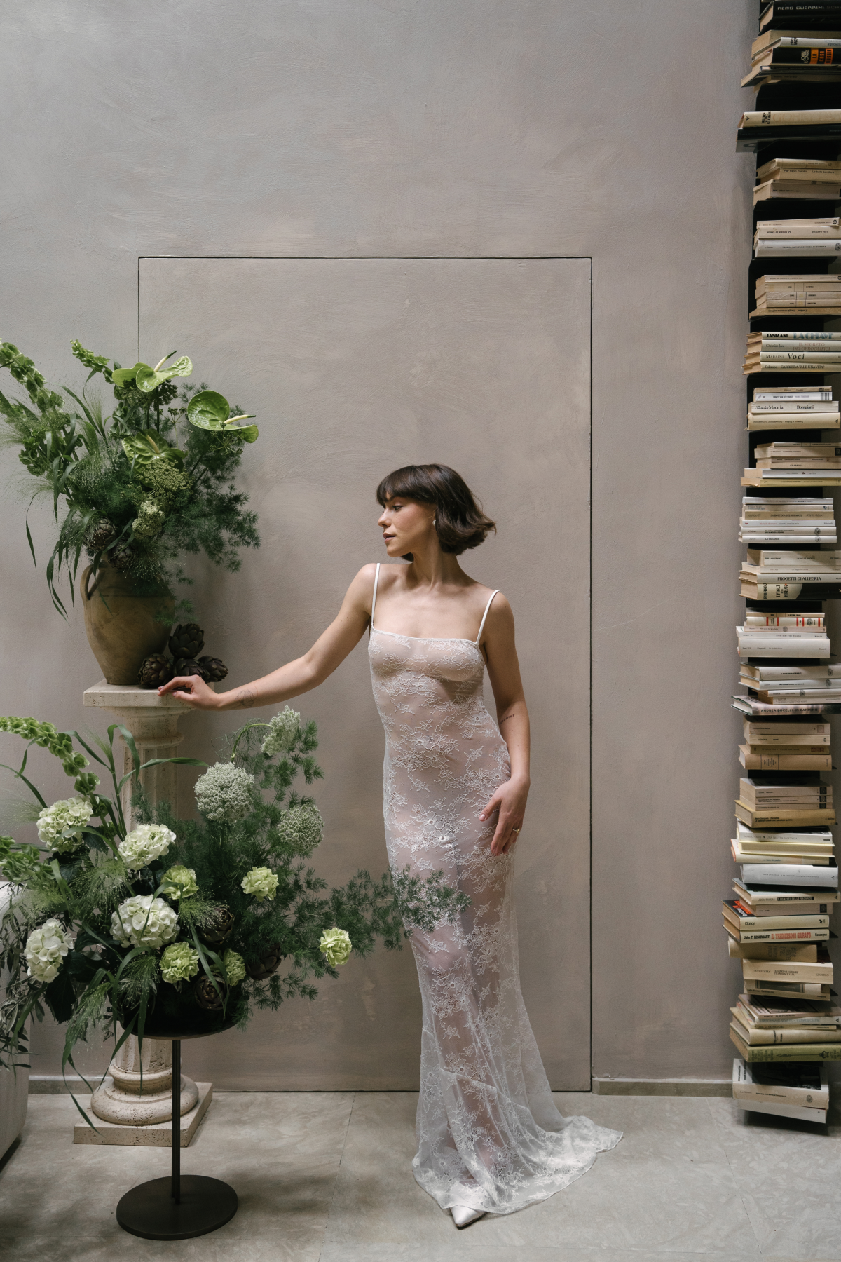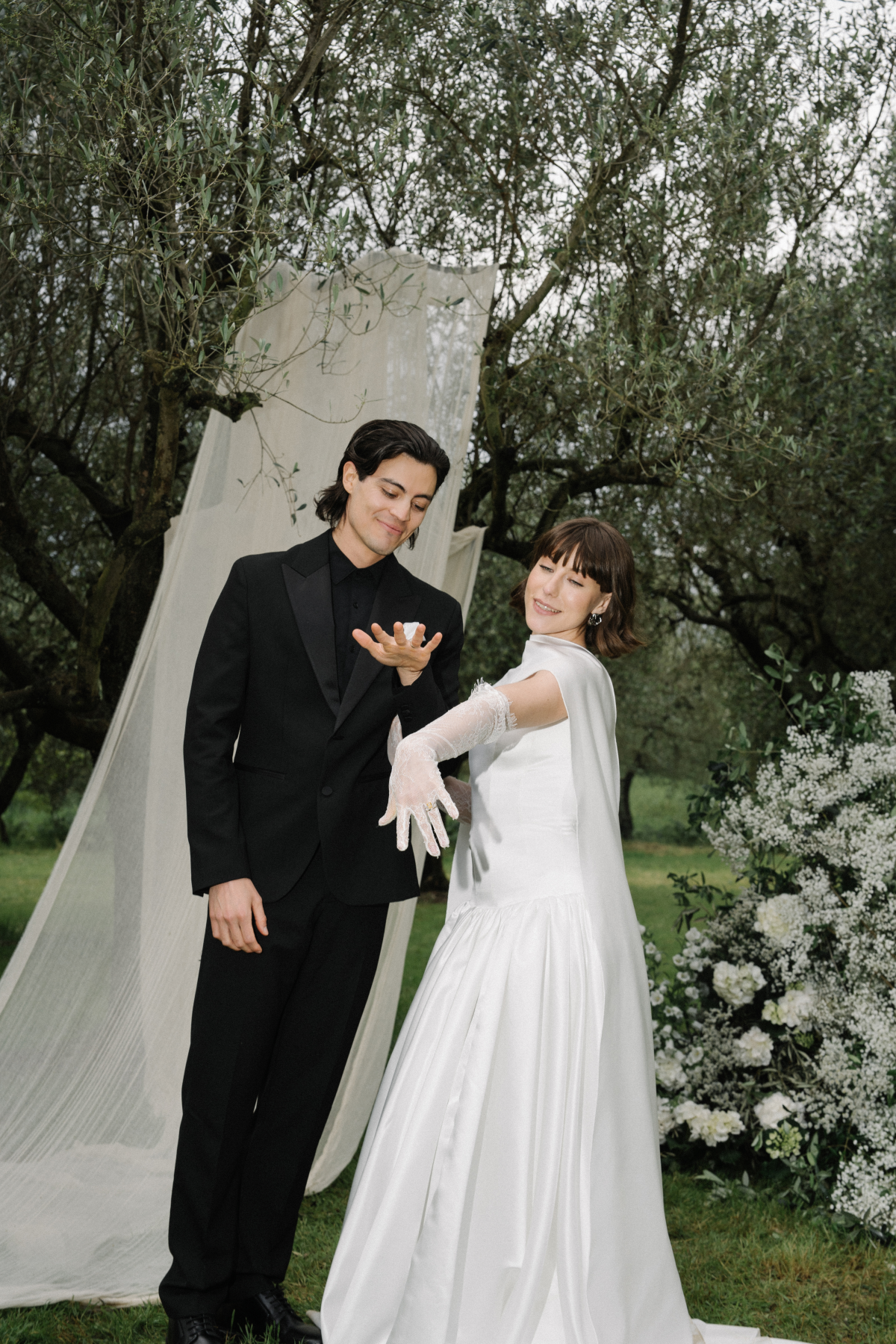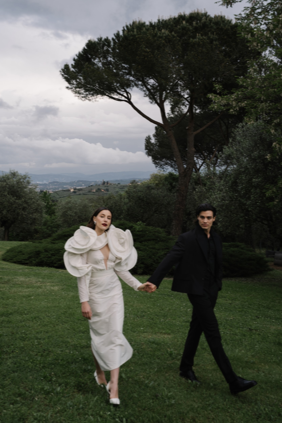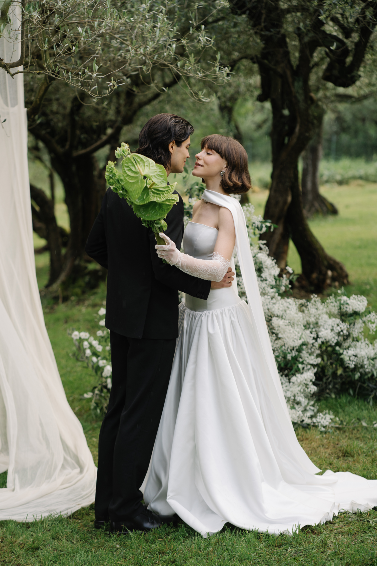 Amongst the luscious, verdant olive groves of O:live Villa Firenze, two lovers share a moment of pure raw intimacy. Our latest editorial captured through the artistic lens of Polina Yarmush, Danilo and Anastasiya posed in a serene, dreamlike setting, elegantly adorned with delicate fabric and subtle floral accents. Every detail as thoughtfully curated as the next, from the bride's contemporary monochromatic bouquet of artichokes, lunaria, and anthuriums, to the poetically styled ceremony and the couple's contrasting looks, a reflection of their modern style and creative spirit. Against Florence's panoramic vistas, the vision continues with an intimate terrace-set reception, culminating in a traditional Italian wedding cake — a warm and welcoming finale to a day filled with romance.
