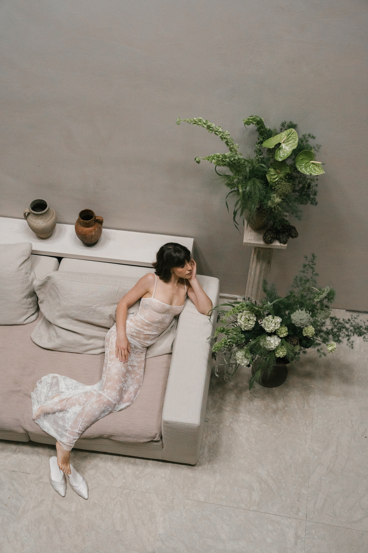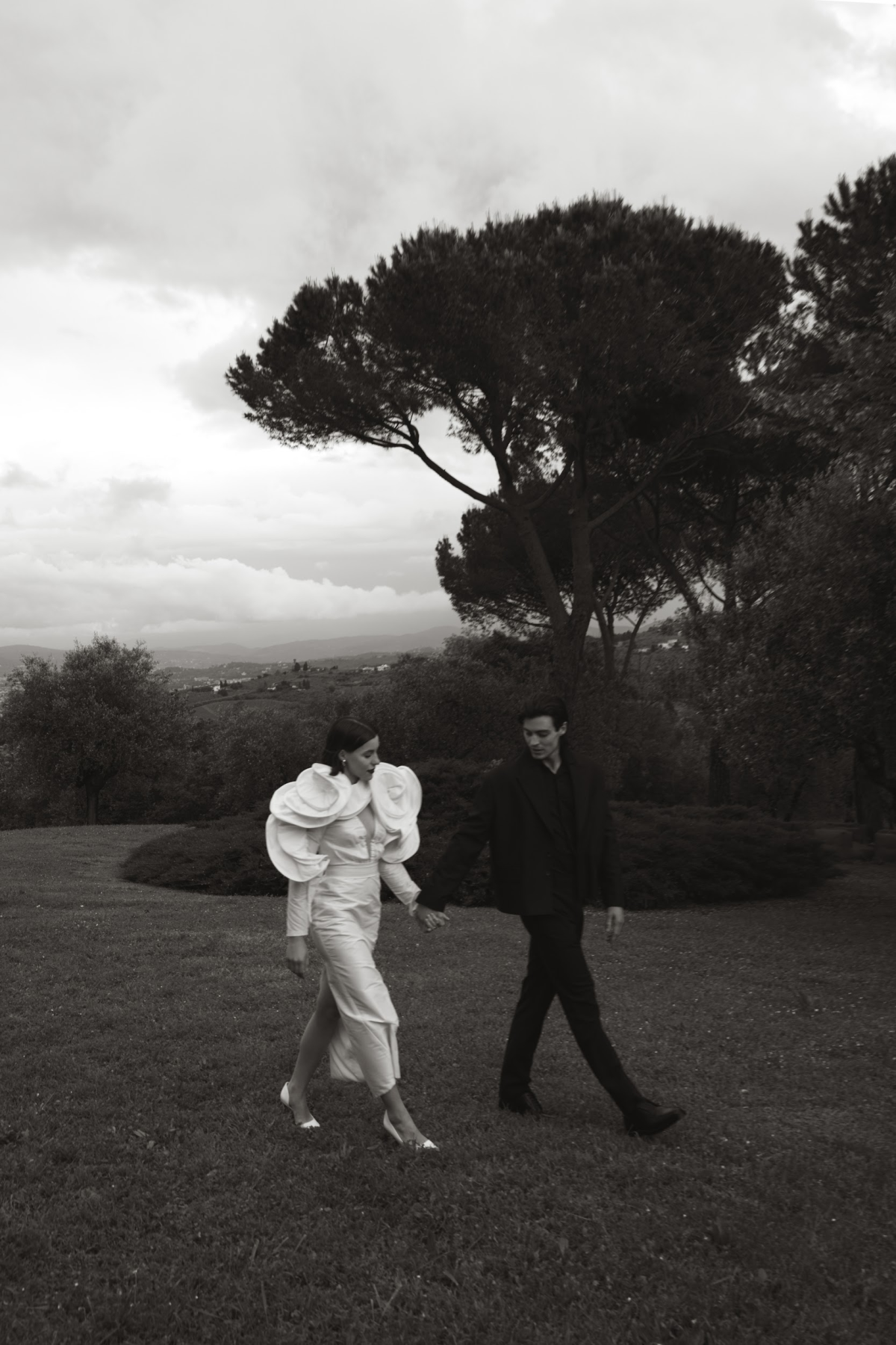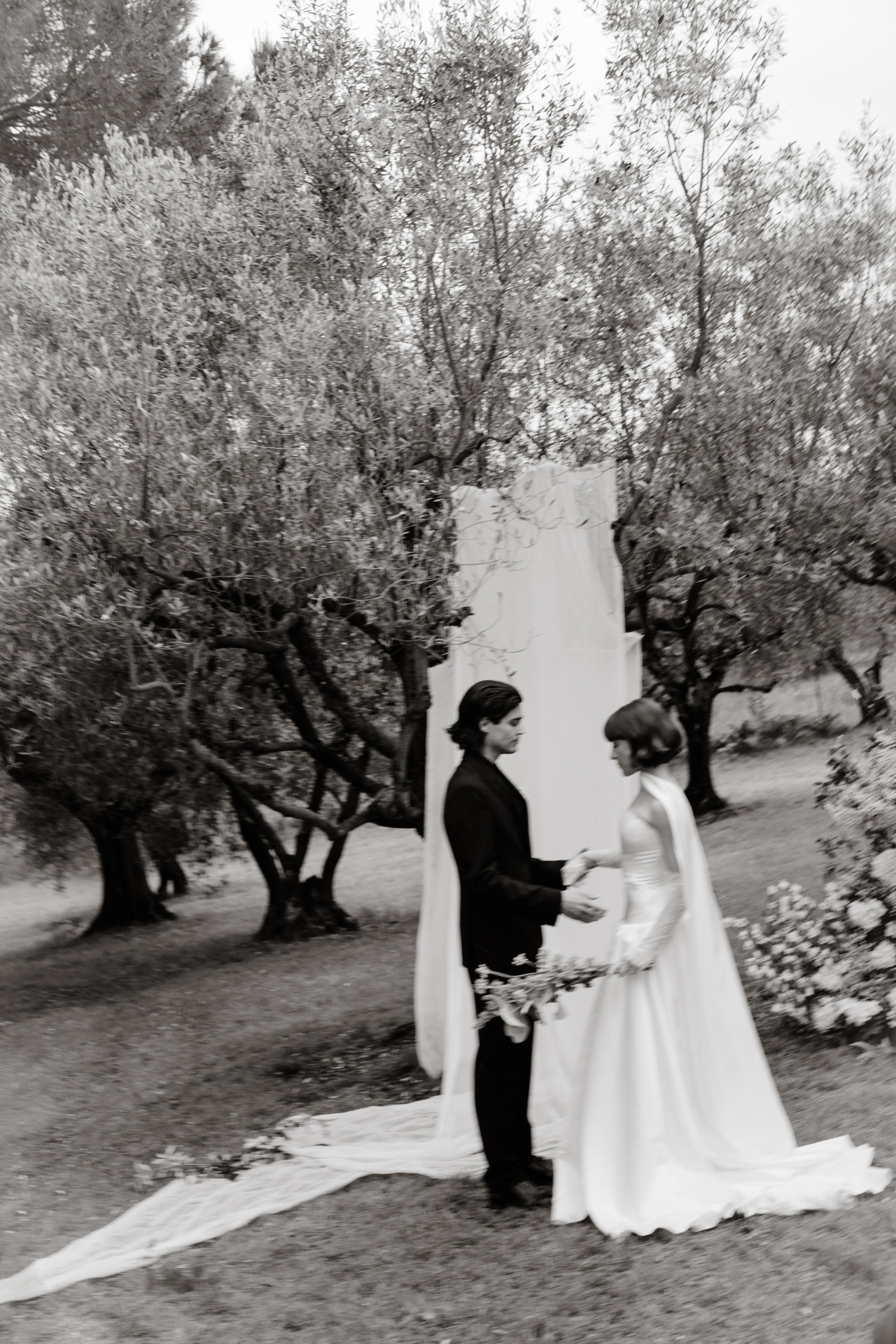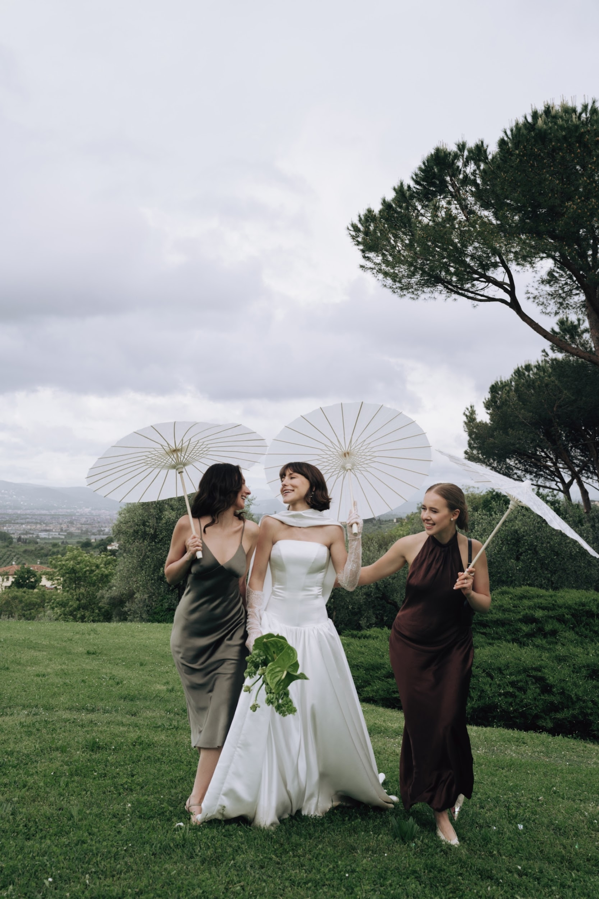 Amongst the luscious, verdant olive groves of O:live Villa Firenze, two lovers share a moment of pure raw intimacy. Our latest editorial captured through the artistic lens of Polina Yarmush, Danilo and Anastasiya posed in a serene, dreamlike setting, elegantly adorned with delicate fabric and subtle floral accents. Every detail as thoughtfully curated as the next, from the bride's contemporary monochromatic bouquet of artichokes, lunaria, and anthuriums, to the poetically styled ceremony and the couple's contrasting looks, a reflection of their modern style and creative spirit. Against Florence's panoramic vistas, the vision continues with an intimate terrace-set reception, culminating in a traditional Italian wedding cake — a warm and welcoming finale to a day filled with romance.