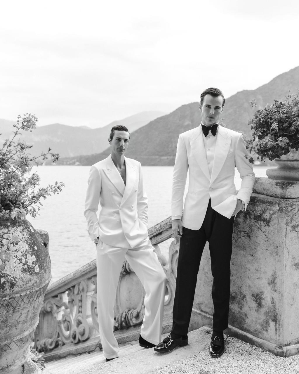 Marketing talent Billy Mitchell and beauty entrepreneur Michael Porter wrapped Lake Como in style, glamor and elegance for their fabulous wedding story. Set at the luxurious Villa del Balbianello, the couple created an enchanting multi-day soiree spilling with the pop culture and classic cinema atmosphere that brought them together. Billy shone in a relaxed ivory double-breasted Giorgio Armani suit, while Michael opted for a classic black and white Tom Ford look. Luxurious and lush flowers combined with a red carpet made the couple's wedding reception even more solemn and lavish, reflecting true elegance and style.