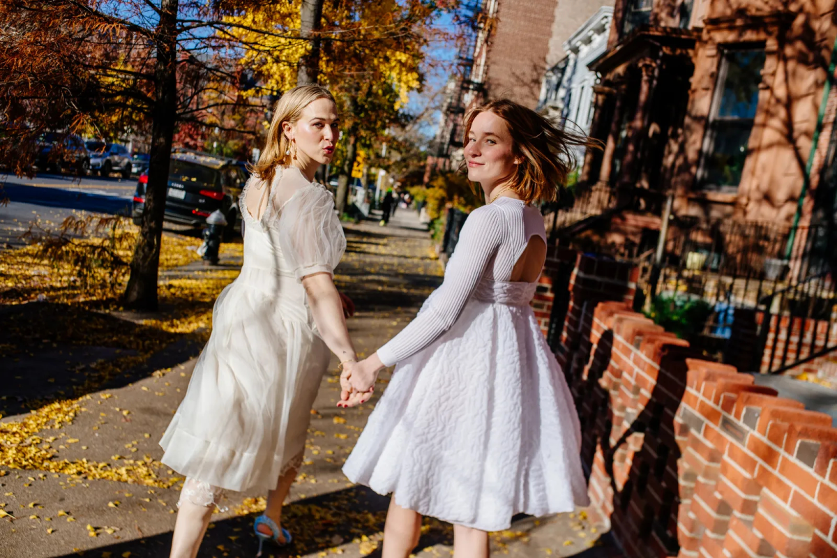 Actress Tommy Dorfman and her now-wife Elise Williams decided that a traditional wedding was not for them, so they opted for a stylish and intimate elopement. Even the brides' dresses did not take long to choose, as their special story is spontaneous, light, playful and bold. After finding the perfect outfits at Dover Street Market, Cecile Bahnsen for Elise and Simone Rocha for Tommy, they were ready. As they were away in Malibu without their wedding dresses, the couple decided to make their marriage official, right there in L.A., secretly, intimately, just for the two of them. The perfect last-minute wedding outfits – two Doen dresses with folklor patterns, Miu Miu boots for Elise and Saint Laurent sandals for Tommy. Later, in Brooklyn, the couple went all out to capture their wedding story in a romantic photoshoot on the streets of the city.