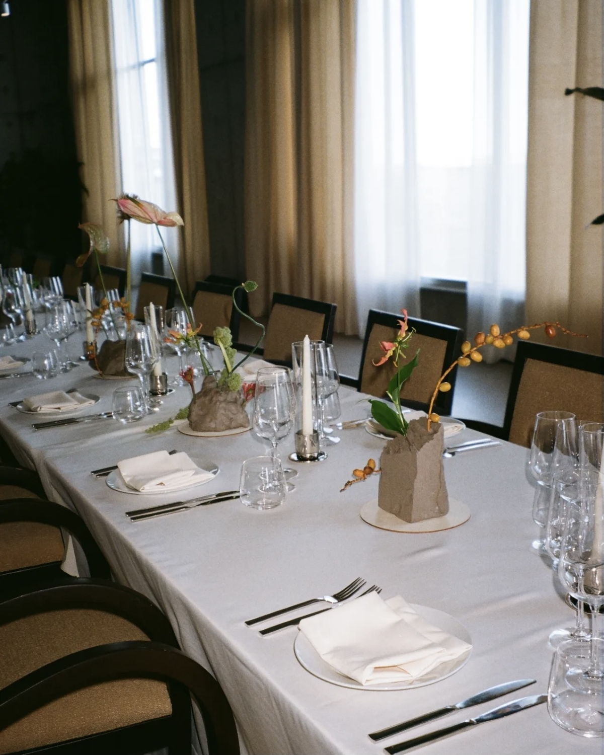 Rachel Scott, designer and founder of fashion brand Diotima, married Chaday Emmanuel Scott at City Hall with two close friends, before celebrating with cocktails at Nine Orchard and dinner at King. Wanting to keep their special day balanced, the couple managed to combine wedding traditions with a new, more modern take on fashion and planning. For the official part of the ceremony at City Hall, Chaday chose a gray striped wool Diotima suit with crochet knit detailing, while the designer wore a white Diotima trench coat with spaghetti fringe and a white crystal fringed skirt. Balancing casual, creative and bridal, the couple were flawless. For the ceremony that followed, the couple changed looks, Chaday wore a gorgeous oversized suit with a white shirt and black knit tie, while the designer wore a stunning white ecru knit strapless gown, both also by Diotima. The décor for the event was minimalist and elegant, with exotic flowers in fresh clay vessels.