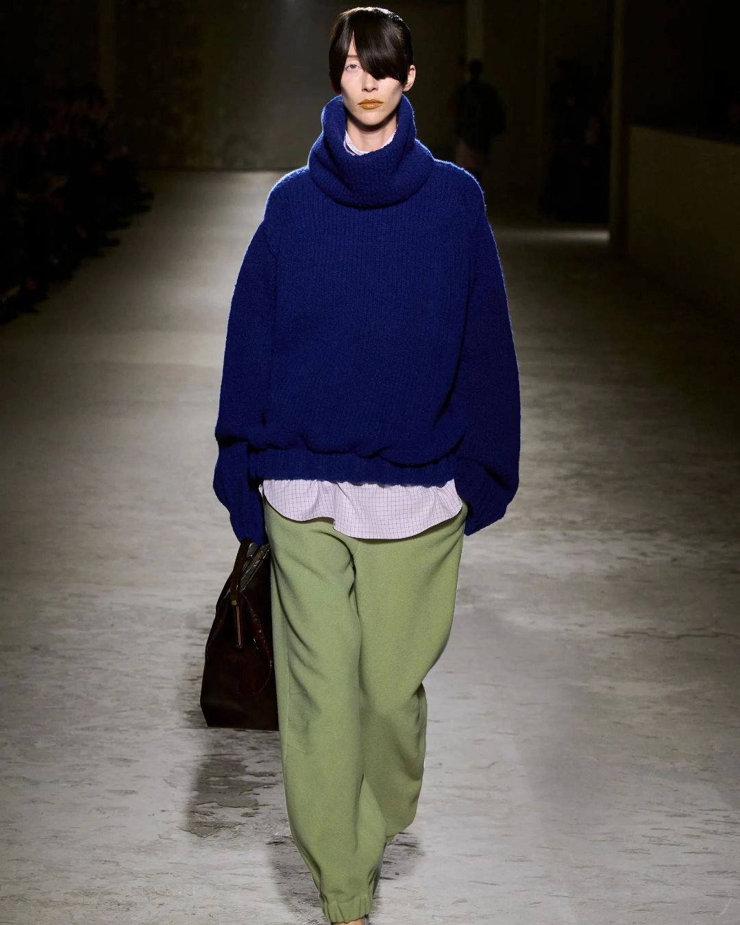 Sweatpants. They are not only the epitome of comfort but also a stylish piece you just can’t go wrong with. For a sporty yet polished look, try matching your favorite sweatsuit with pointy-toe pumps, as seen at the Undercover show. Or take a cue from Dries van Noten and style your lounge bottoms with an oversized turtleneck sweater and chic heels. A fresh approach to sweats brought Brussels-based designer Ester Manas by showcasing them with the same cut and tailoring typically seen in office trousers.