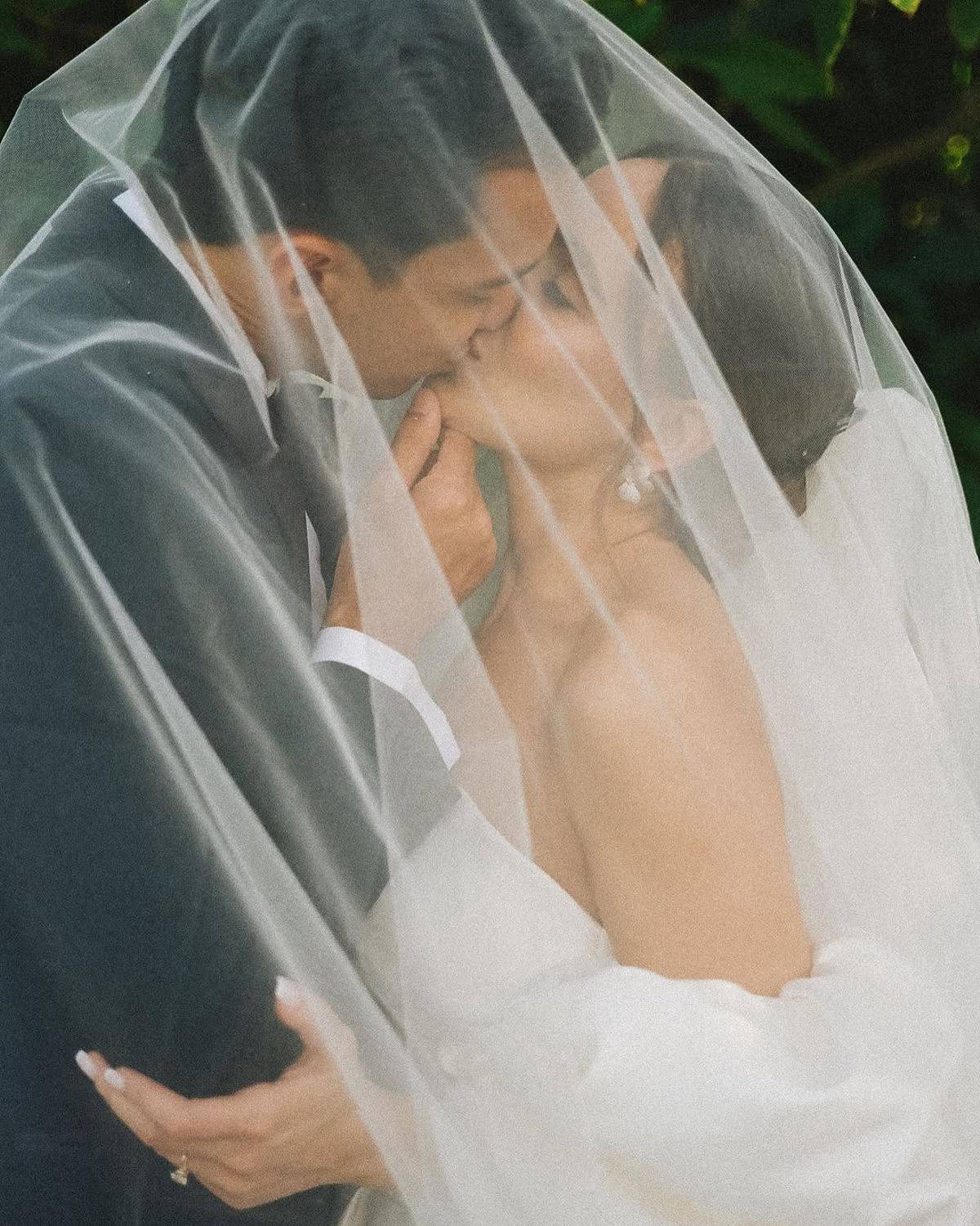 Another wildly romantic favorite is the couple’s kiss under the veil. Soft, intimate, and wrapped in its own little world, the pose captures that heart-skipping, just-us moment. The veil diffuses the light, gently blurs the background, and transforms a simple kiss into pure visual poetry. It’s tender enough to make you forget the camera and fall in love with each other all over again. “I always suggest gentle movement rather than a static kiss,“ says editorial wedding photographer Yana Korn. “Even a slow lean-in or a soft smile before the kiss creates a tender, authentic moment.”