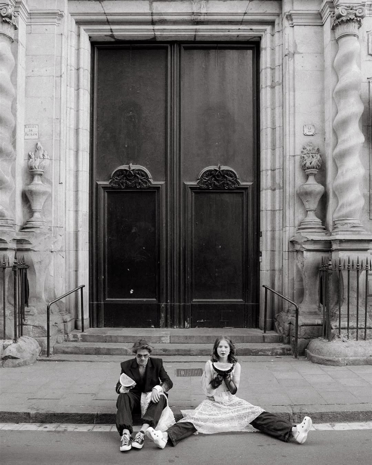 This pose beautifully plays with contrast—soft meets structured, grounded meets elevated, calm meets confident. With one partner seated and the other standing close, the image naturally takes on a layered, almost editorial feel. “The contrast in height creates a beautiful interplay of softness and strength. It works wonderfully outdoors as well as in elegant interiors, where the furniture becomes part of the composition”, explains Yana Korn. “I usually encourage the seated partner to settle into a relaxed and confident position, maybe leaning slightly, crossing the legs, or resting an arm. While the standing partner maintains a confident but gentle presence.”
