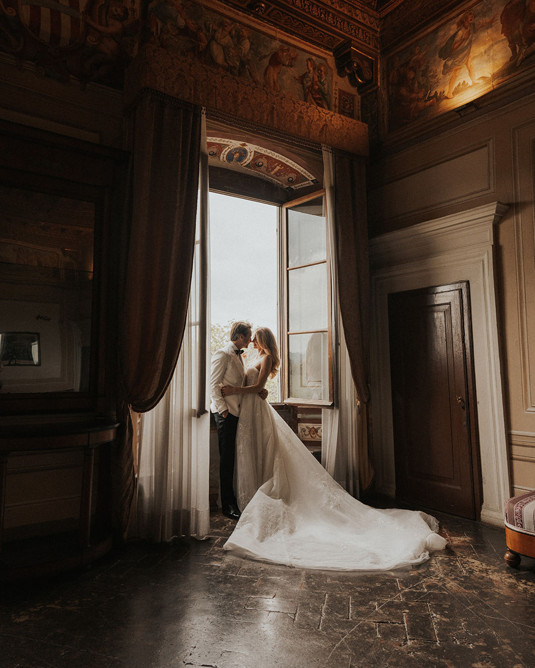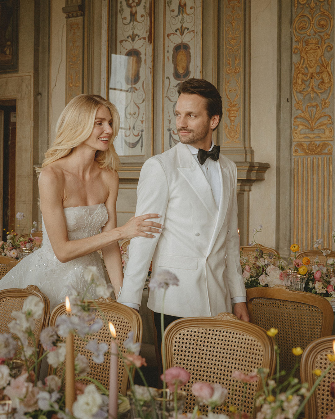Against the backdrop of Villa Corsini's manicured gardens and within its lavish interiors, two lovers take a step into their happily ever after. Bathed in the golden glow of the Tuscan sun, they share their precious moments destined to be engraved in their hearts forever. Captured by Suzy Anderson and brought to life by the team of wedding creatives, this visual story feels grandure yet deeply personal. The delicate floral arrangements and the sophisticated table settings, thoughtfully chosen, echo the villa’s classic elegance, creating a celebration as timeless as the beauty that surrounds it.