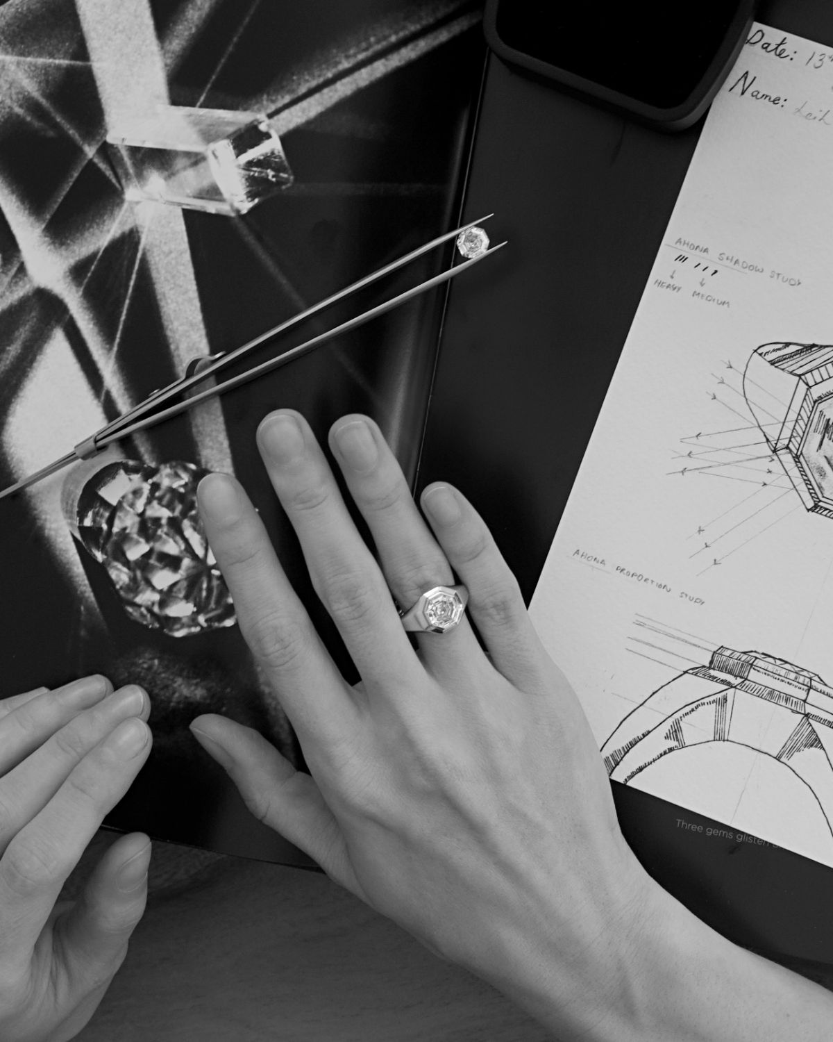 In architecture, form shapes how light moves and how a space is experienced, and I apply the same principle to jewelry. A well-designed ring does more than sparkle; it creates shifting light experiences throughout the day — in morning sun, office lighting, dusk. I structure each piece so gold and stone work in tandem, using stepped planes and measured proportions to direct how light is reflected and refracted beyond the diamond itself. For me, form is never ornamental; it carries identity and meaning, shaping how the ring catches light as you move through your day. When choosing a piece you will wear for life, the focus shifts from size alone to how the ring responds to light, from day to night.