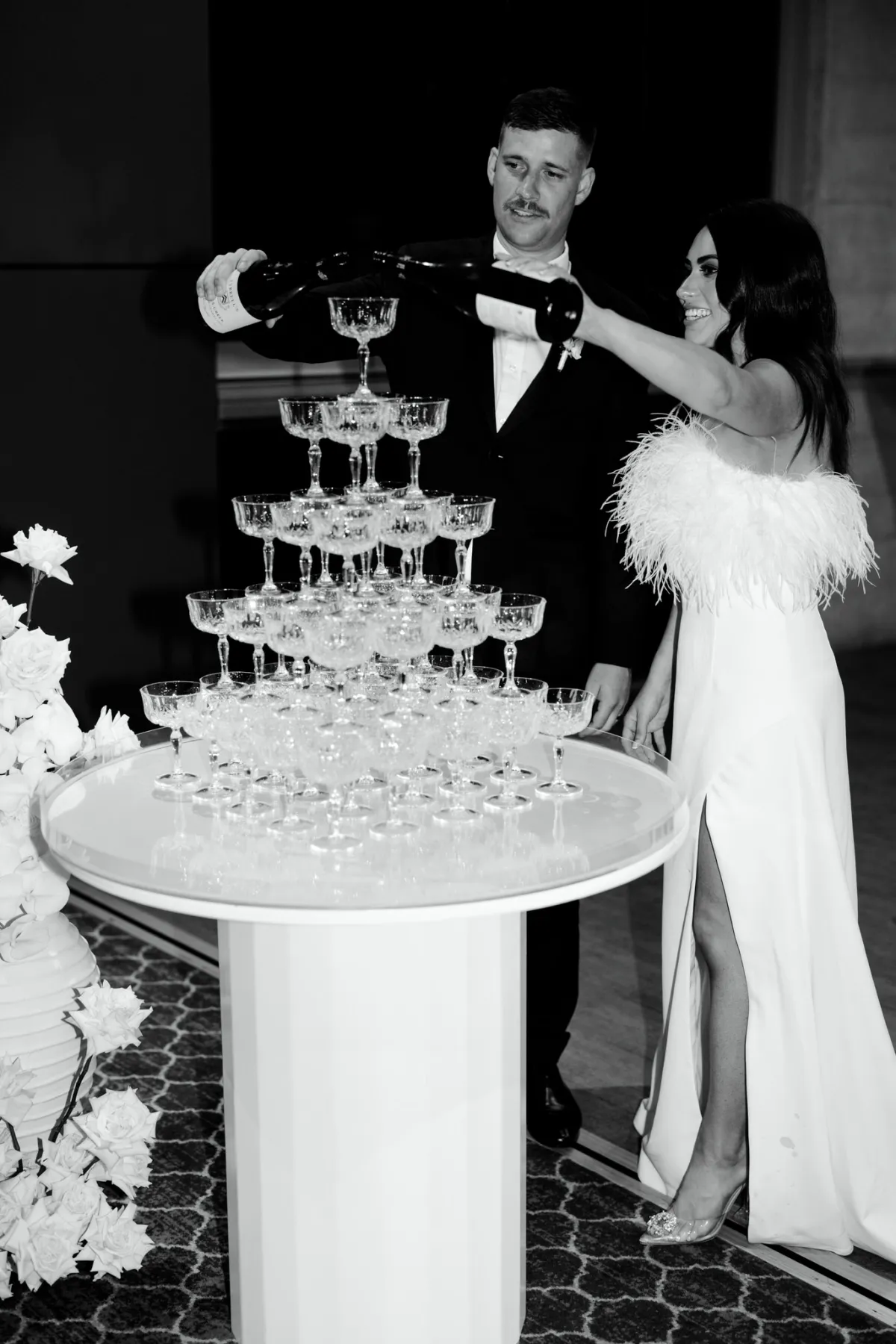 We didn’t have a wedding cake actually, we opted for a champagne tower instead! We already had dessert offered to guests, but we also thought it was so much fun to have a champagne toast. Funnily enough, it got knocked over and the photos of the tower are after this occurred and it had been fixed! It made for a funny story.