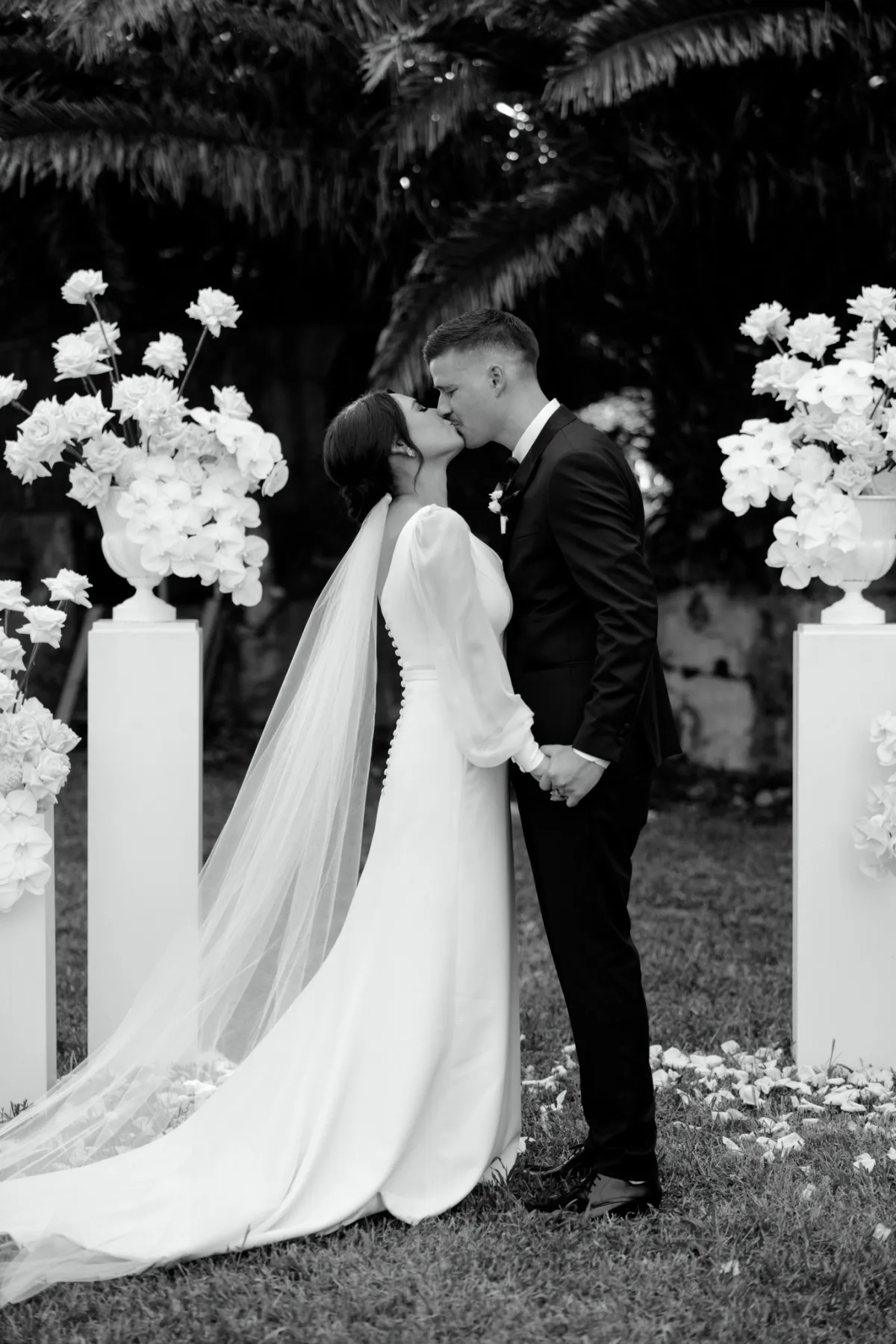 Firstly, if I could wear them every day, I would! For my ceremony dress, I really wanted something classic, timeless and elegant and that’s exactly what Kelly from Atelier Rose designed for me. When I was shopping for wedding dresses it was peak COVID, so I was unable to try on anything or visit boutiques to look and try dresses on. It honestly worked out amazing and led me in finding Kelly! A true blessing in disguise, it was everything I had dreamt of since I was little. My second dress (because why not?!) I had a stunning feather piece from Rachel Gilbert. It truly was the perfect dress for a fun reception vibe! I absolutely am obsessed with feather pieces, so it truly was everything I didn’t know I “needed”!