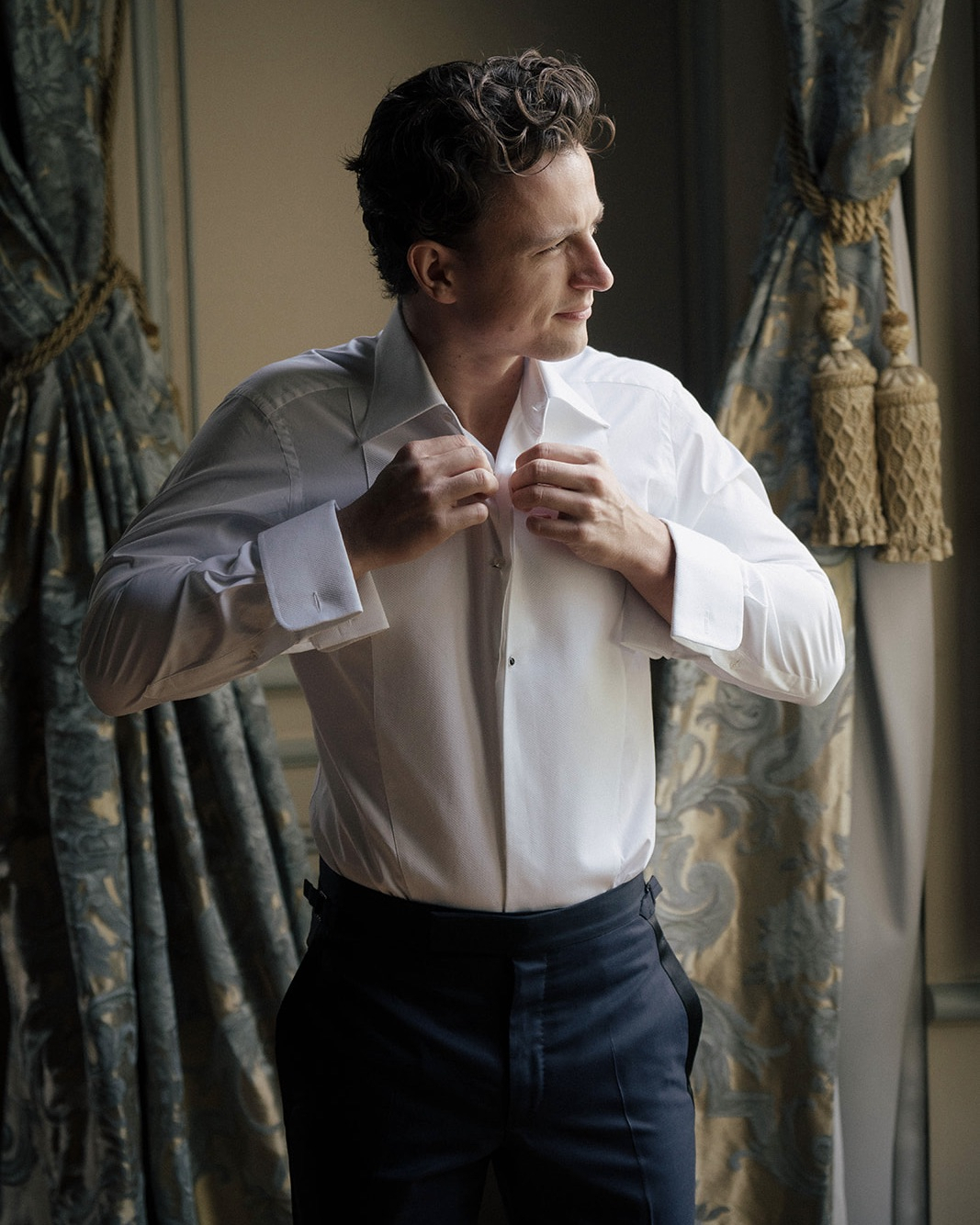 Mike wore a full Tom Ford look — tux, shoes, shirt, and bow tie. He chose to do navy as it was classic yet youthful, with a bold shawl collar.
