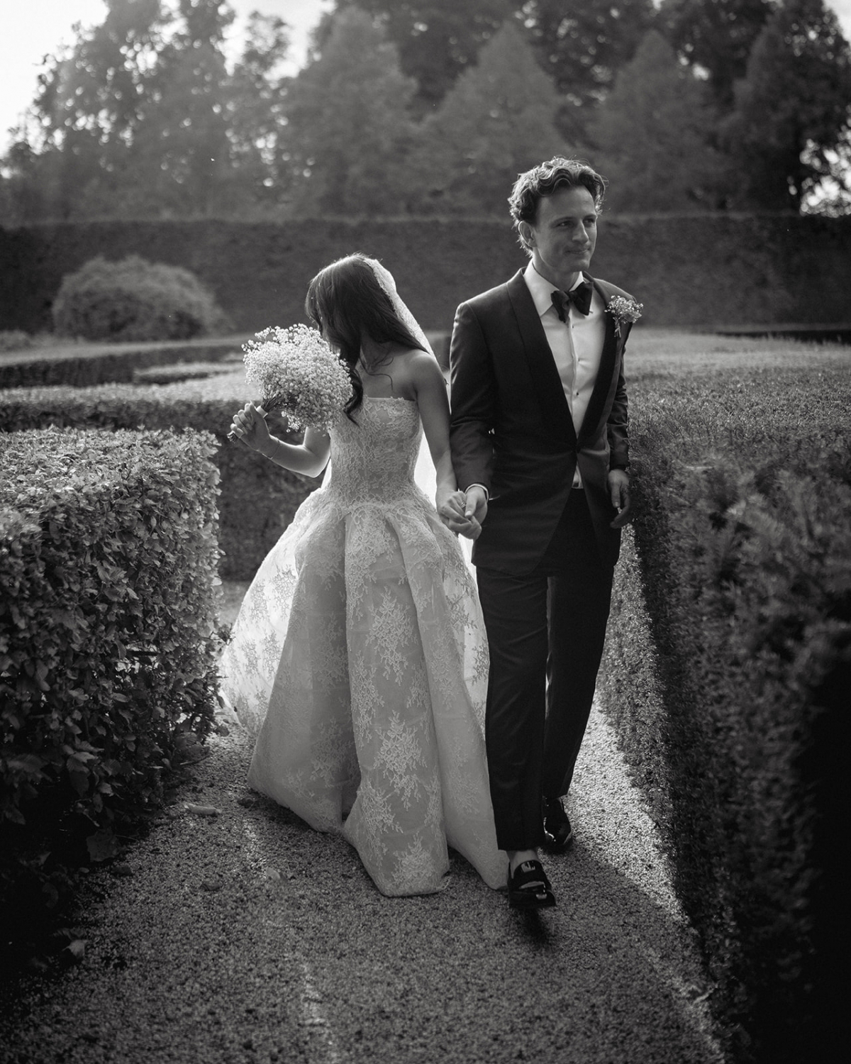 The reception was on the other side of the chateau, in the center of the gardens. I wanted a long table so it would feel like we were hosting an intimate dinner party instead of a wedding. Abundant florals filled the tables, spilling over the sides. I chose gypsophilas — white, clean, and simple, contrasted with black accents — black candles, black chandeliers, and black bows.