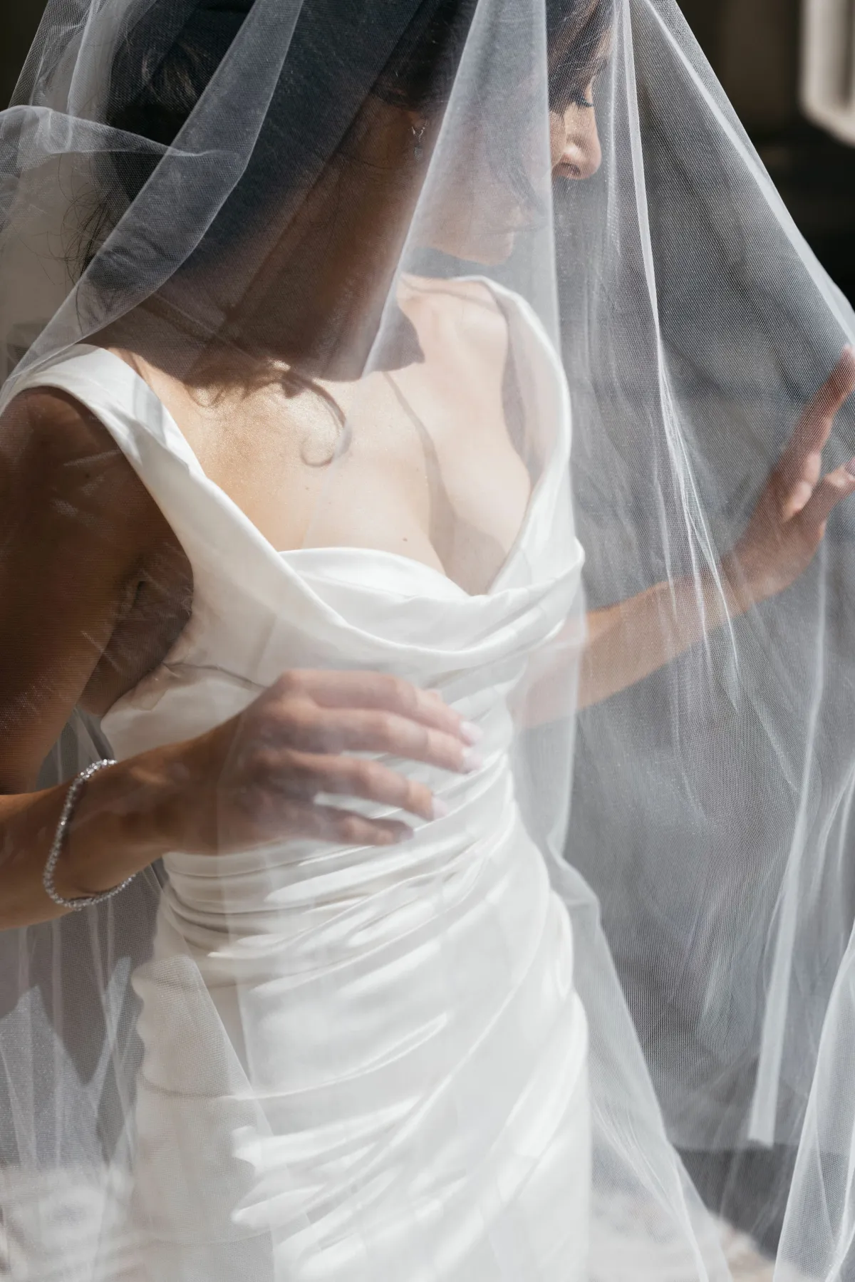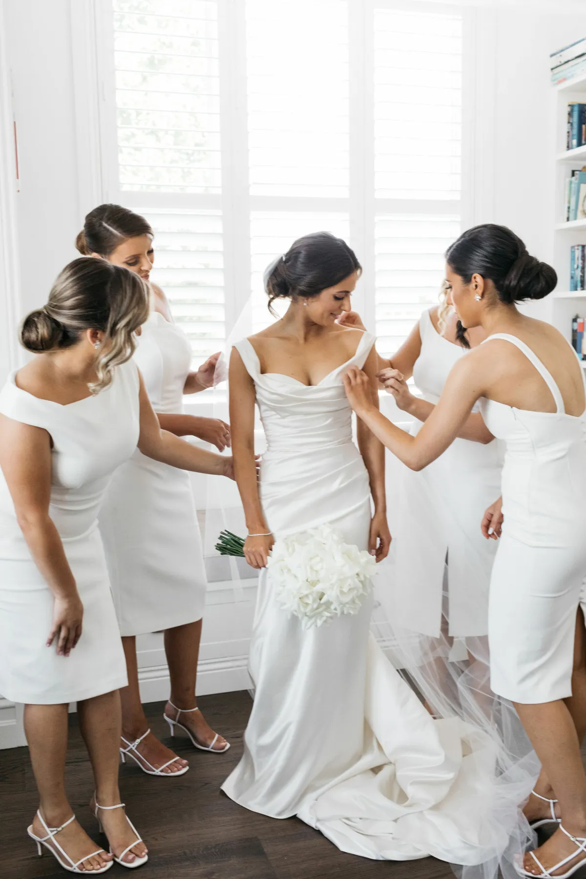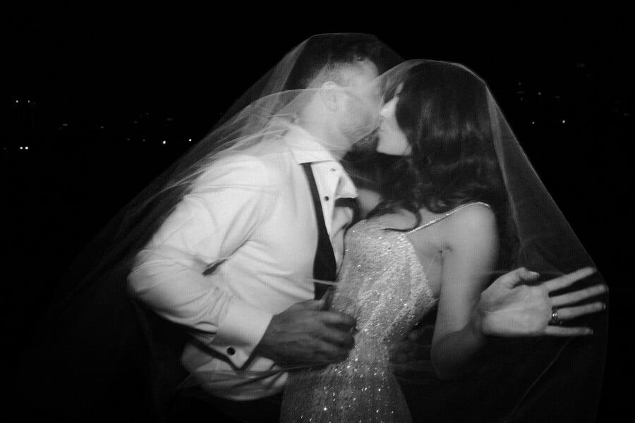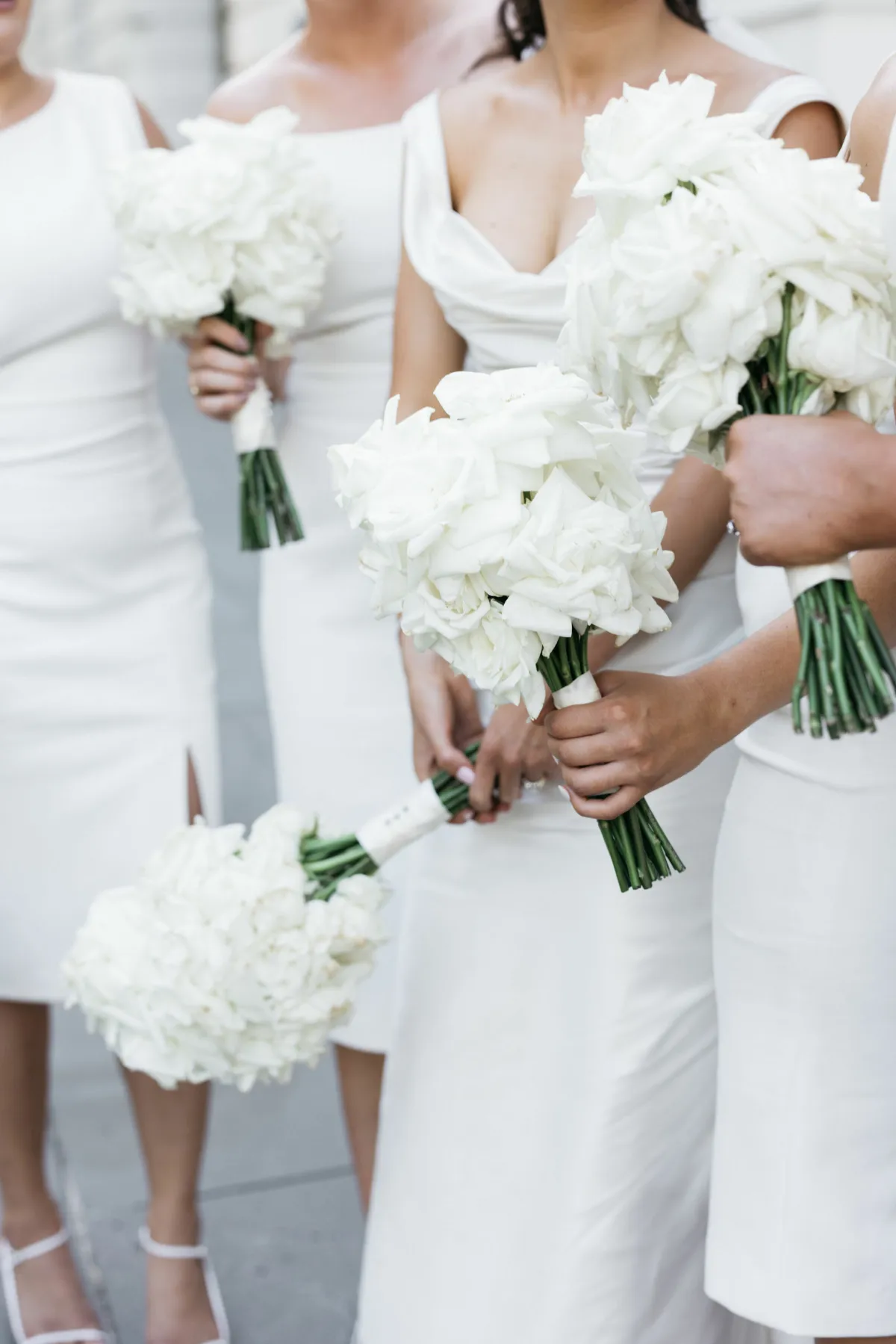 I knew as soon as I got engaged that I wanted two dresses for my special day. I had the most talented and creative dressmaker in Holly Butler. Before I found her, I went to a few other designers, but I didn’t feel that I connected with them as I did with Holly. She was just starting out and made the stressful design process so much fun! Her studio was in this gorgeous apartment in the city that gave me NYC vibes and made me so happy to be there. I had two very different dress designs, and she nailed them both! My first dress was Christina Aguilera “Burlesque” inspired and my second dress was just full of sparkle! The gents all had classic and timeless black tuxedos from YSG Tailors and my beautiful birdesmaids all wore different white dresses from Friend of Audrey to match me.