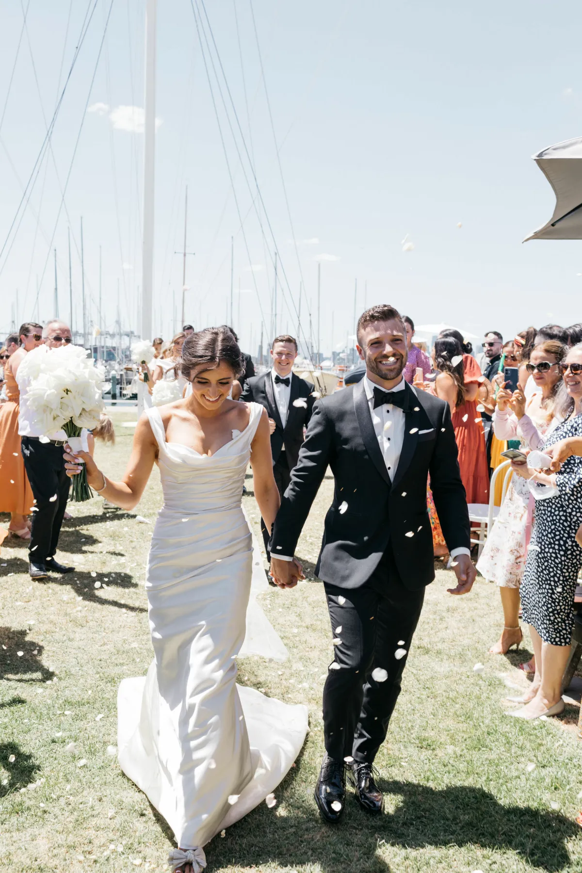 Ally and Andrew wanted a grand wedding with 300 of their very best friends and loved ones. For an event of this magnitude, finding a suitable venue is not easy. The couple decided to take a non-traditional path: they held their ceremony at a yacht club. They served gelato and bespoke cocktails, and after that, they had a reception with beautiful views of Melbourne. We reached out to Ally to find out how she arranged her amazing wedding, as well as her love story with Andrew.