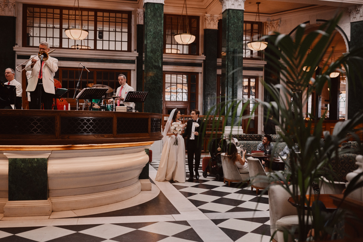 Both our wedding ceremony and reception took place at The Ned, London. The Ned is a breathtakingly beautiful hotel located in the former Midlands Bank HQ and managed by Soho House. The hotel is situated in Bank, an area of the city known for its skyscrapers and suits, busier on weekdays than it is on weekends. Bank junction is one of my favorite views in London, and as Lewis works in The City, it was here where we would part ways every morning, so I could continue my commute to West London. For the event, we hired the entire sixth floor. The ceremony and party took place in The Saloon, and we hosted dinner in The Tapestry Room. We also had the use of two roof terraces with the most spectacular views of The City, where we hosted drinks after the ceremony. Lewis and I both stayed (separately) at The Ned the night before, as did many of our guests. It was so comforting to wake up there and settle in before the wedding. While Lewis had breakfast with his groomsmen at Duck and Waffle, I ordered room service to The Bridal Suite with my bridesmaids. The night of the wedding, Lewis and I slept in the Terrace Suite, which was by far the most beautiful room I have ever slept in. I felt like a princess! The next morning, we ate breakfast in our robes on our private roof terrace overlooking The City. We truly didn’t want to leave and decided to stay a third night after dining in one of the hotel's restaurants, Kaia. On our final day, we spent the morning at the spa then headed to the rooftop for an outdoor swim.
