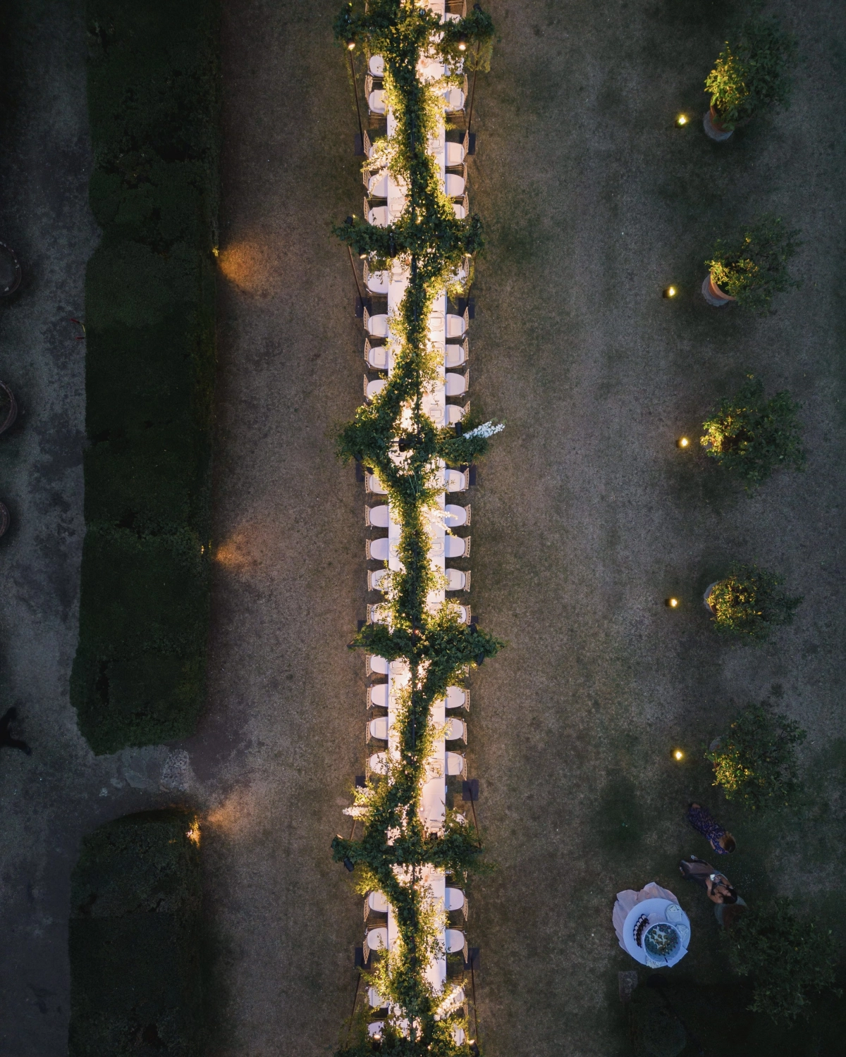 The day was filled with unforgettable moments, from my grandfather walking me down the aisle, to the heartfelt speeches delivered by our mums and friends, and the breathtaking sunset that brought everyone together on the terrace. Yet, one of the absolute highlights was our entrance to dinner, when we saw the table for the first time. Candles, music, flowers cascading from the sky, and of course our friends and families around a single table, it was absolutely magical! As we made our way around the table to greet each guest, they welcomed us swirling napkins in the air, in keeping with the joyful tradition of Italian weddings.
