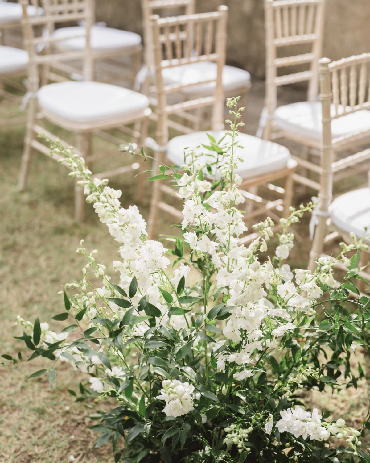 The villa was our biggest source of inspiration. To highlight its natural beauty, we chose a single-flower theme for the entire wedding, focusing exclusively on white delphiniums. A somewhat unusual choice, but certainly with character. For the setup of the ceremony area, we created a spontaneous delphinium garden. We aimed for a floral arrangement that looked natural, as if those flowers had always lived and grown there. Instead of a traditional floral arch, we decorated the Dionysus Nymphaeum with cascading delphiniums, creating a splendid backdrop for the wedding vows.
