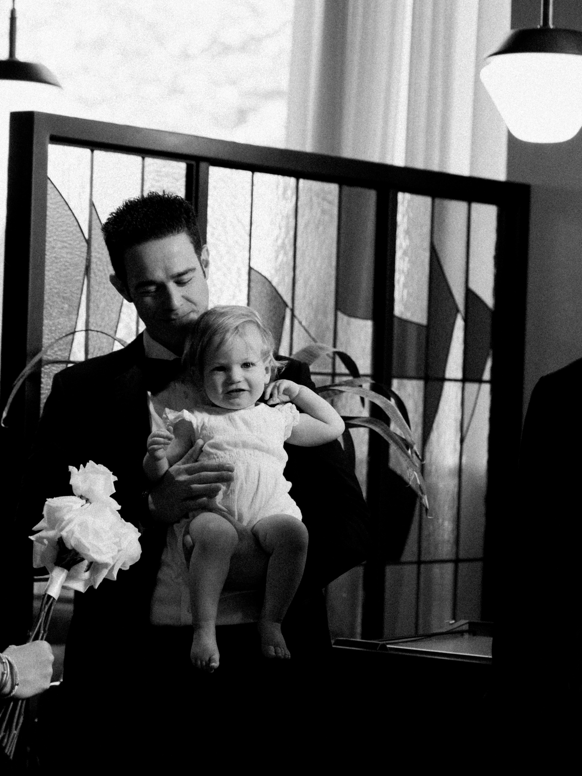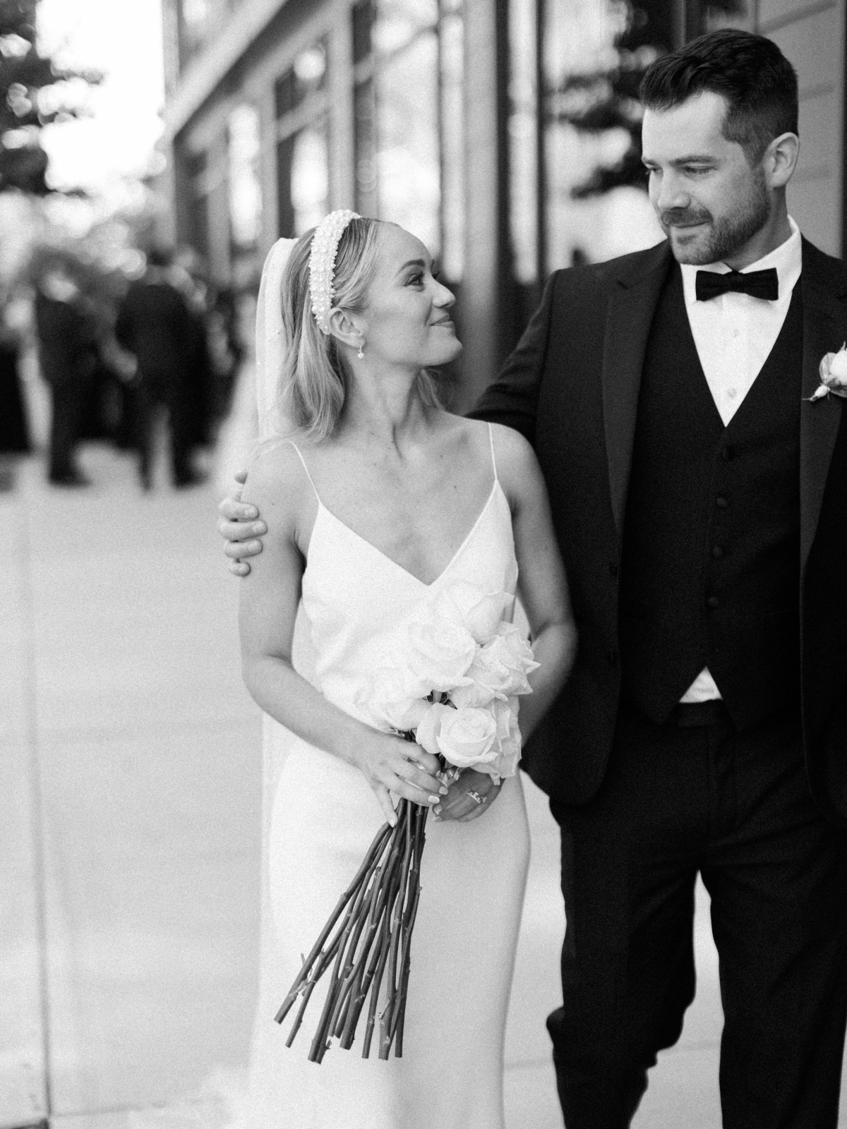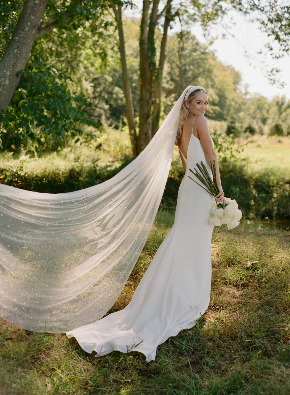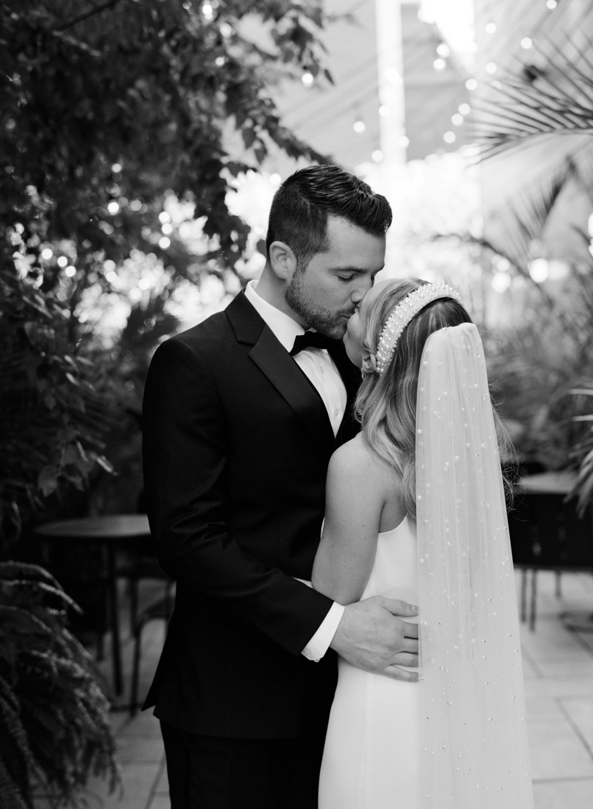 I wore a very, very simple silk crepe gown from Alexandra Grecco and accessorized with a pearl headband and veil. My husband wore a black tuxedo and bowtie.