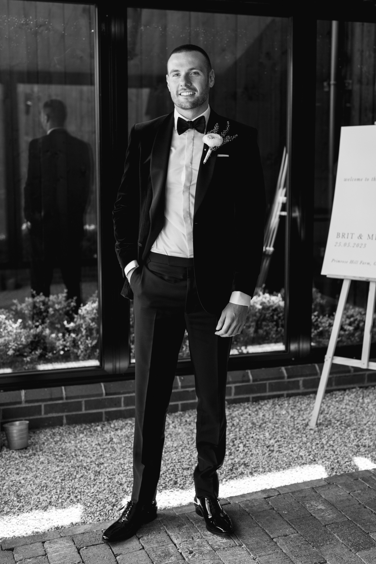Mike and the groomsmen donned black-tie attire to make the day even more special for them. Mike's suit was made to measure by Richard James on Savile Row. The process was fantastic, and the suit looked truly unique with its ink blue velvet jacket that transformed in different lighting conditions.