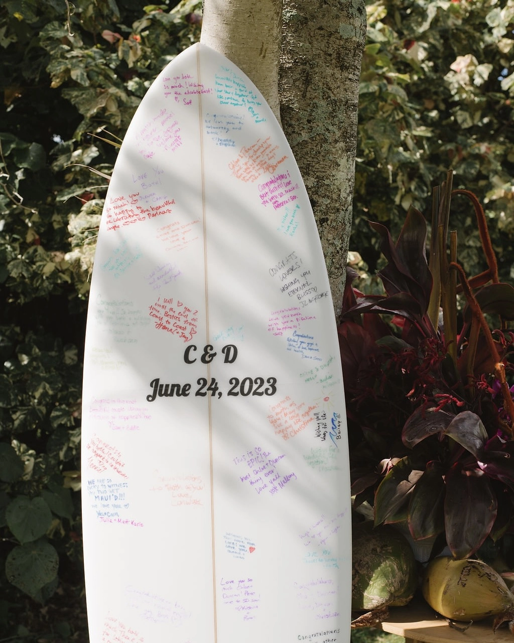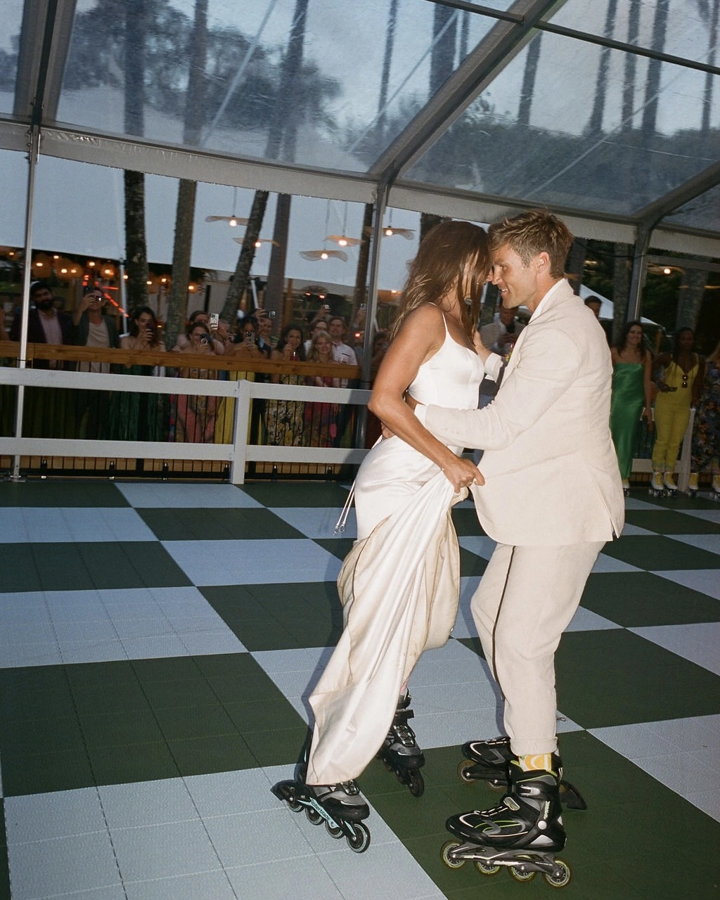 Oh, did we ever! The morning of our wedding, we organized a big surf session at Launiopoko in Lahaina. Many of our friends and family members joined. My camp director Dustin from Maui Surfer Girls brought extra boards, and we all got to ride waves together. Some of us even wore costumes. It was the happiest, coolest way to start our wedding day. And now, given all that Lahaina and its people have lost in the devastating fires, Duncan and I are even more grateful that we could share that beautiful part of Maui with our loved ones. Also, it goes without saying that our custom built skate rink was the absolute highlight of our wedding. It worked as an ice breaker, serving as a way to cruise and take a break from the dance floor, but also was where everyone wanted to gather and laugh! Roller Skating kind of just unites people, you know?