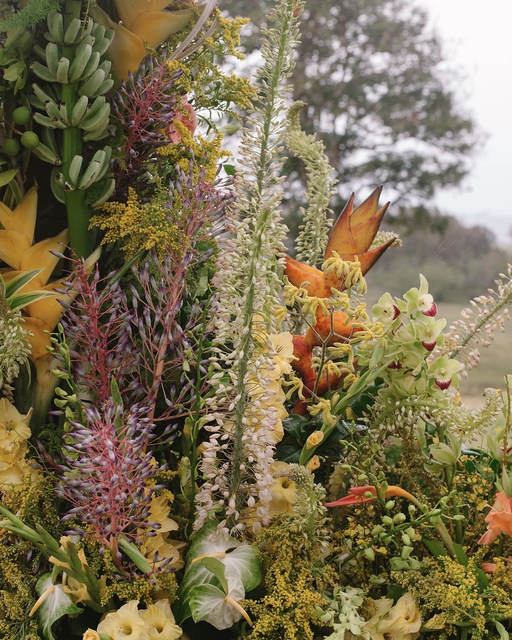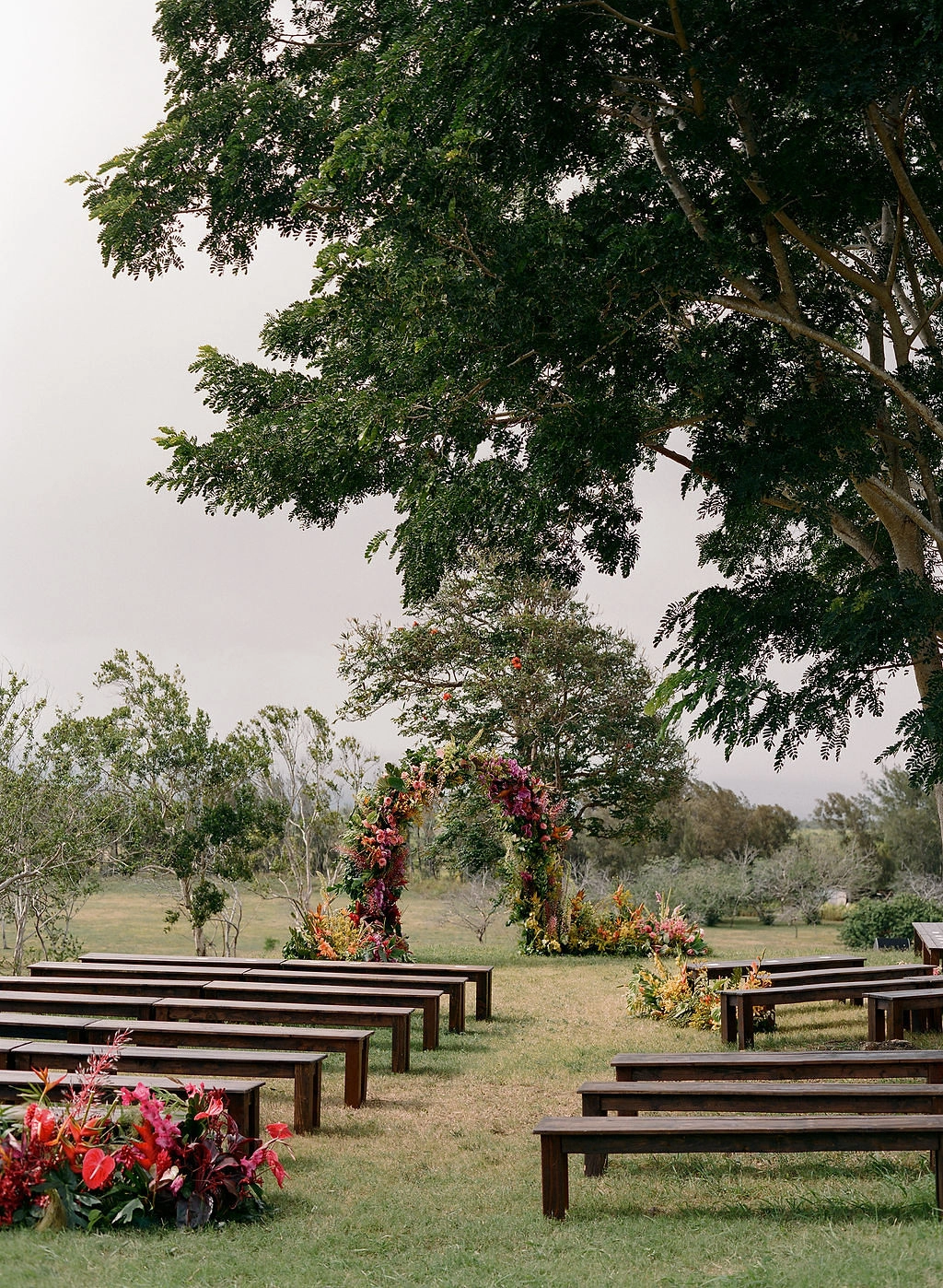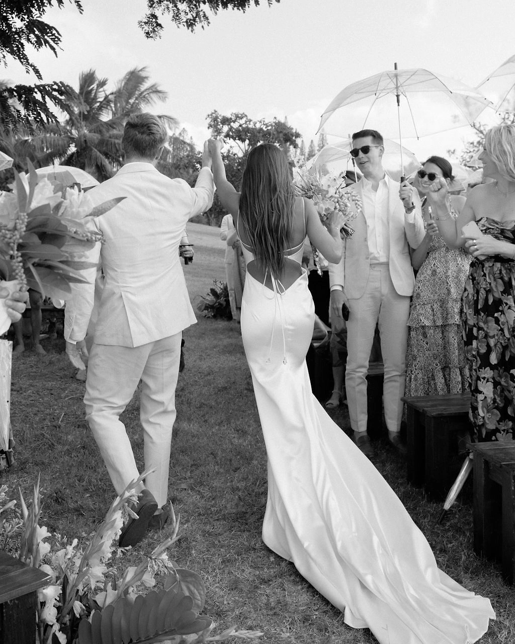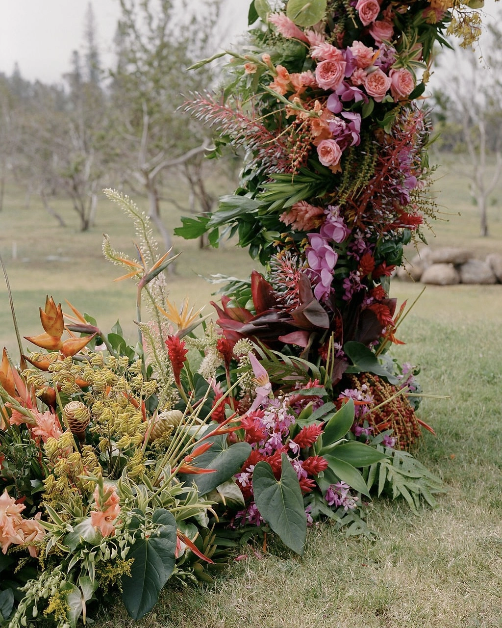 Maui is a very special and sacred place to both of us. Duncan’s first job out of college was at Maui Prep, a school in Maui. He lived on the island for about a year, where he fell even more in love with surfing. I grew up going to an amazing all girls surf camp on Maui, called Maui Surfer Girls. My Maui surf camp friends became my family, and I've gone back to Maui every year since I was a kid. The island has an incredible energy — and being on Maui, with its local people, feels like a big hug. Our venue was a private plot of land in Haiku, a cooler and more lush side of the island, that our planner, Jolene of Laurel & Rose, discovered through her network. Our venue was full of native trees and plants, so it felt like a jungle playground, and we could feel the ocean breeze from the top of our ceremony site.