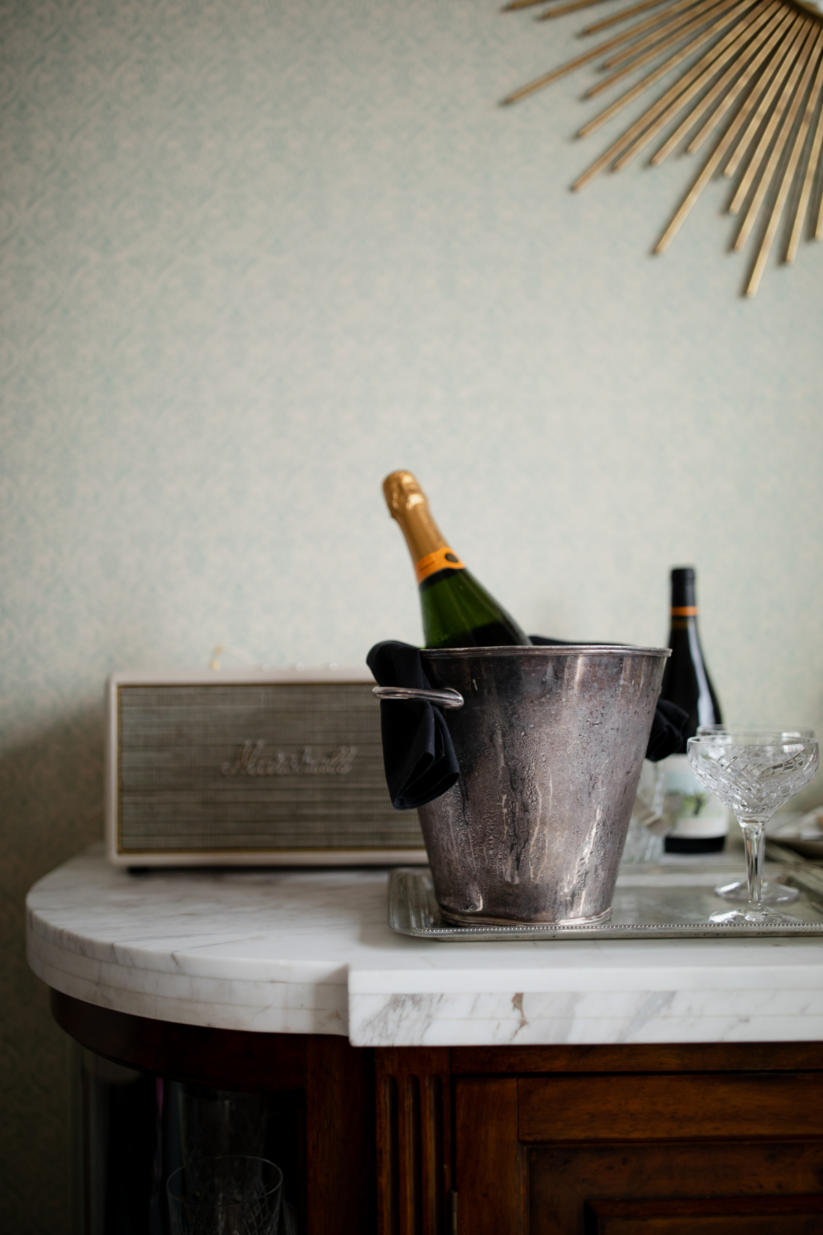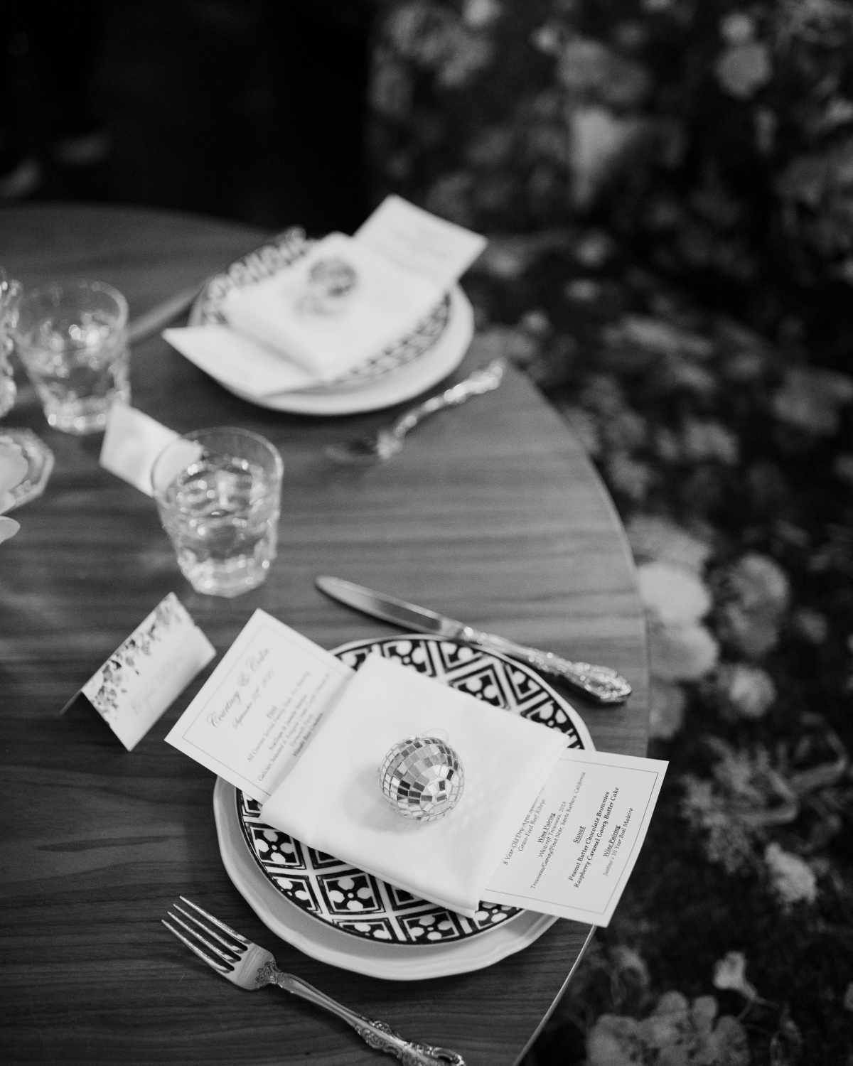 Our wedding hopped around the city to a few different venues. We decided to stay at Soho House as an ode to where we first met, and to give us the feel of a "staycation" with the ability to be fully free of distractions. Our micro ceremony was at Beatnik on the River. We exchanged our vows in a tiny private room within the restaurant that is called the "jewelry room." It is in fact just that, a 1913 Nashville jewelry shop reassembled piece by piece in the middle of the restaurant. Mirrored walls, original crystal chandeliers, and glass-fronted cabinets that once housed precious jewels. That evening we had dinner at Botánico. It exudes a Hollywood regency vibe, with floral velvet couches and dim lighting. We served a family style Spanish menu featuring home recipes from Chef Marco's himself, all accompanied by wine pairings selected by Colin. We capped off the night at DISCO, a dance space influenced by the legacy of 1970s NYC, Paris & Rome. A nightlife sanctuary featuring wall-to-wall LED dance floor, custom retro wall coverings, mirrored ceilings, and lucite furnishings.