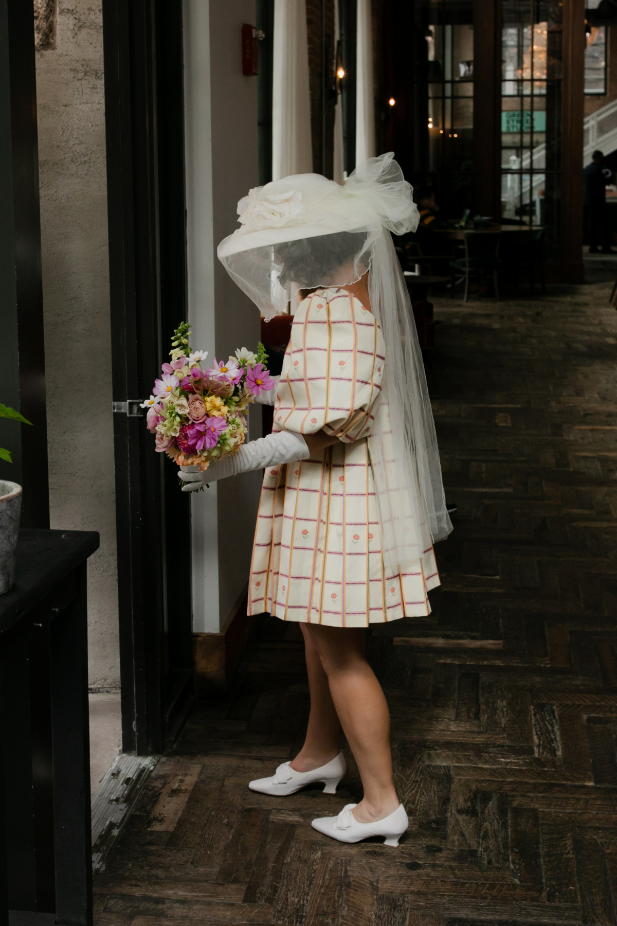 I wore two outfits. My baby doll dress was custom-made by a small designer. It was produced from a cream vintage fabric with a windowpane and floral print. I paired it with cream-colored bow court shoes, elbow length gloves from my grandmother, and blue heart beaded earrings from local designer Cities In Dust. Colin wore a 3-piece, hounds-tooth, navy suit from suit supply, with a pocket square panel from the fabric of Courtney's dress. For the evening, we shifted into our disco inspired attire. I wore a set from independent designer - Rezek studio that featured high-waisted "hustle pants" and a "foxy" shimmery top with ostrich cuff details, and a gold snake cuff from my other grandmother. The shoes were 4 inch blue platforms decked out in beads, and Colin wore a vintage disco button down.
