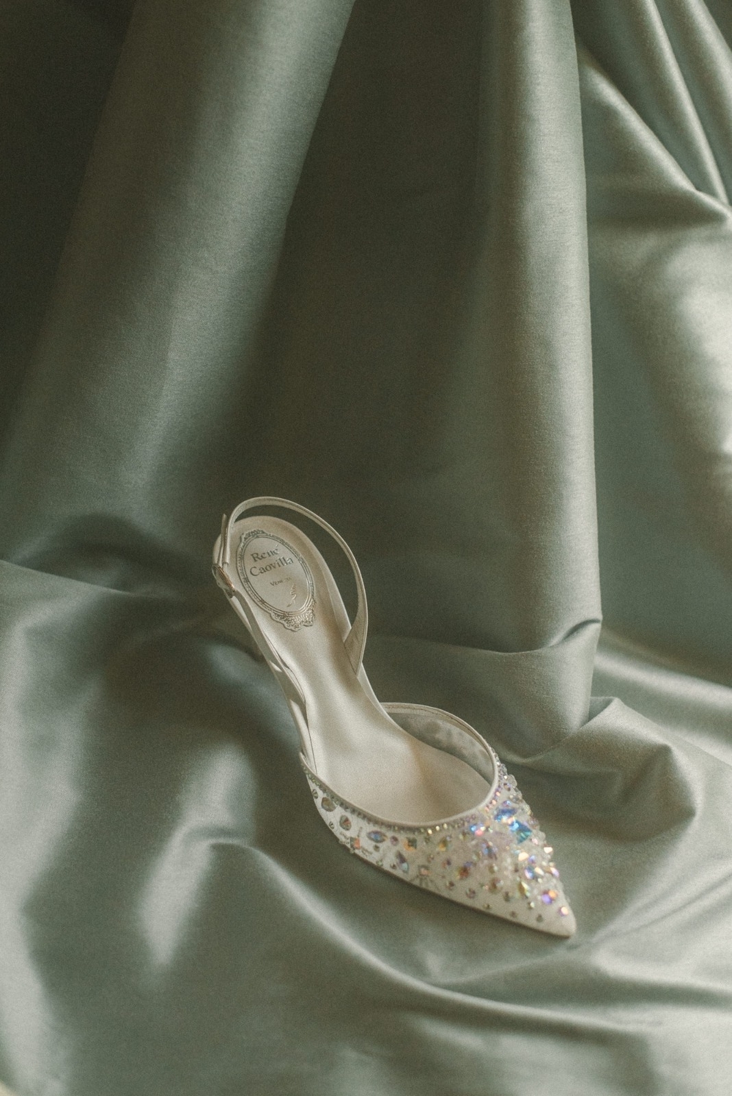 Davide wore a navy blue and grey English classic suit from Eral55, with a light cream double breasted gilet and a same color tie. He also wore a vintage 5140J Patek Philippe, combined with a pair of gold shirt cufflinks from the same brand. I wore a white pearl taffeta wedding dress, combined with a pair of white silk gloves, matching with “Bellis L'Eau” freshwater pearl earrings, from Sophie Bille Brahe. As for the shoes, I chose a pair of white slingbacks from René Caovilla Maison, embroidered by hand on tulle with thousands of gems, inspired by the iconic Cinderella crystal shoe.