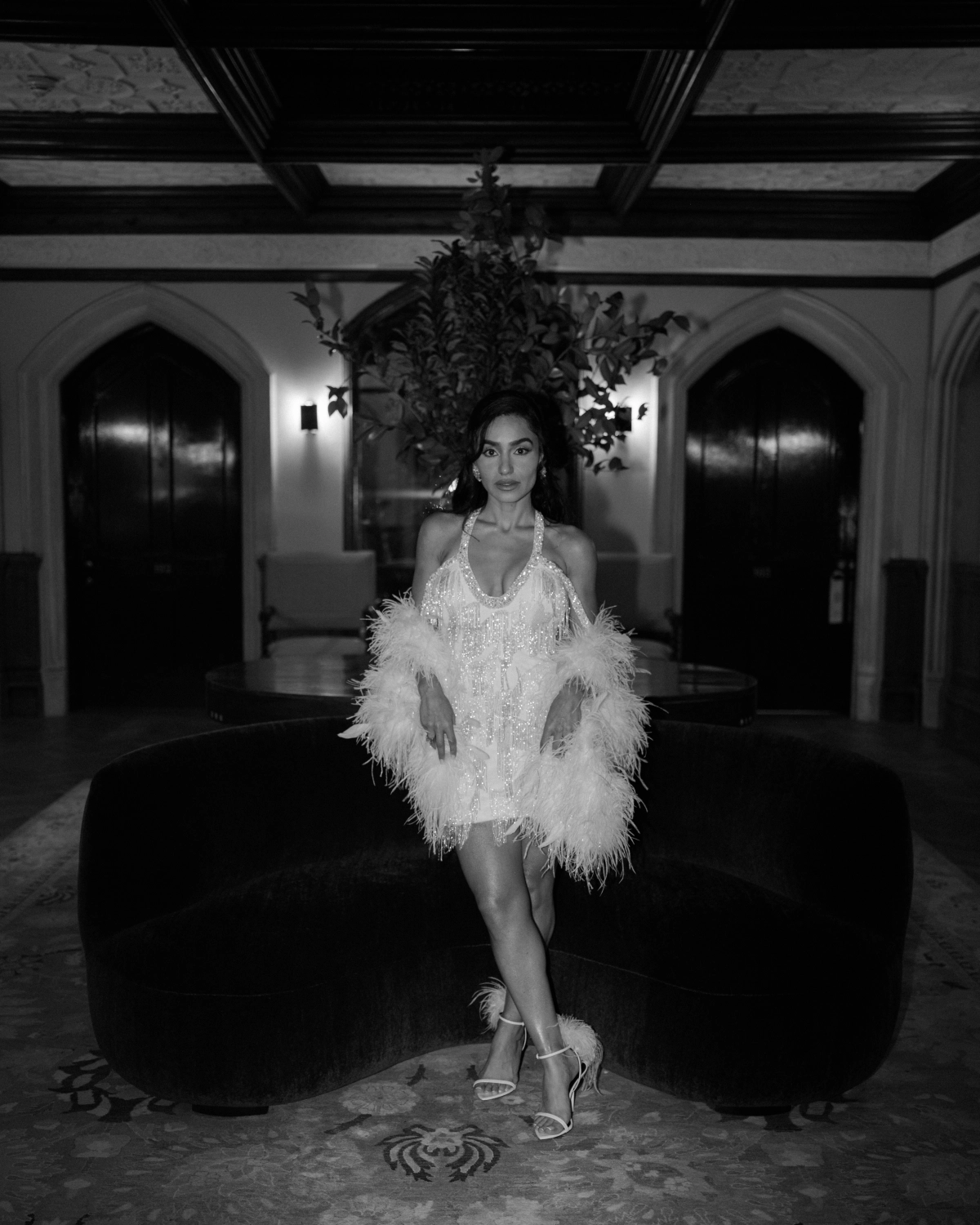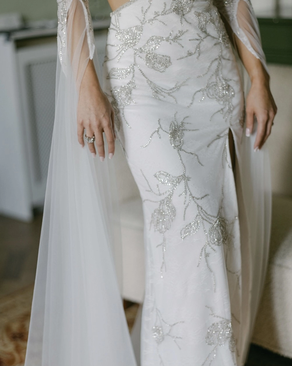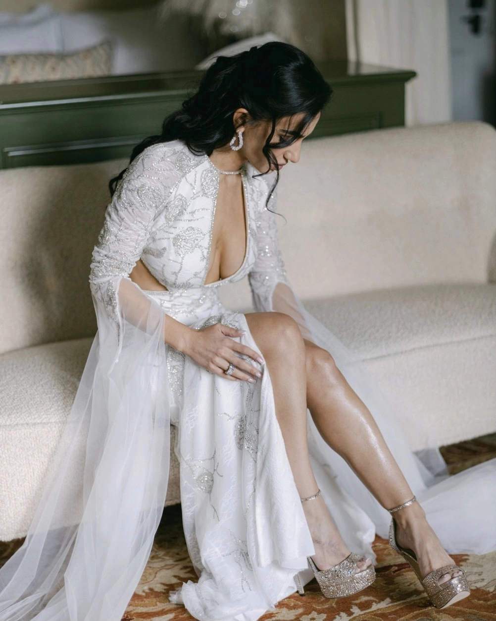 My top three main focuses about the wedding were the flowers, the photography, and most importantly the fashion, which led me to going on what I call the world tour of bridal outfit searches. For the ceremony, I lived out my princess, fairytale ball gown dreams. I fell in love with my gown and the sequin and pearl beading, ostrich feather detailing throughout the skirt, and the sweeping train. It was the perfect combination of the elegance and romance I wanted. I also had a custom Tony Ward cathedral length veil and beaded headpiece that were absolutely exquisite. For the reception, I wanted a gown that was glamorous, silhouette hugging, elegant, and sexy, something I would more typically wear and be drawn to. My gown had crystal beading throughout, a plunging neckline, and full, floor length tulle sleeves.