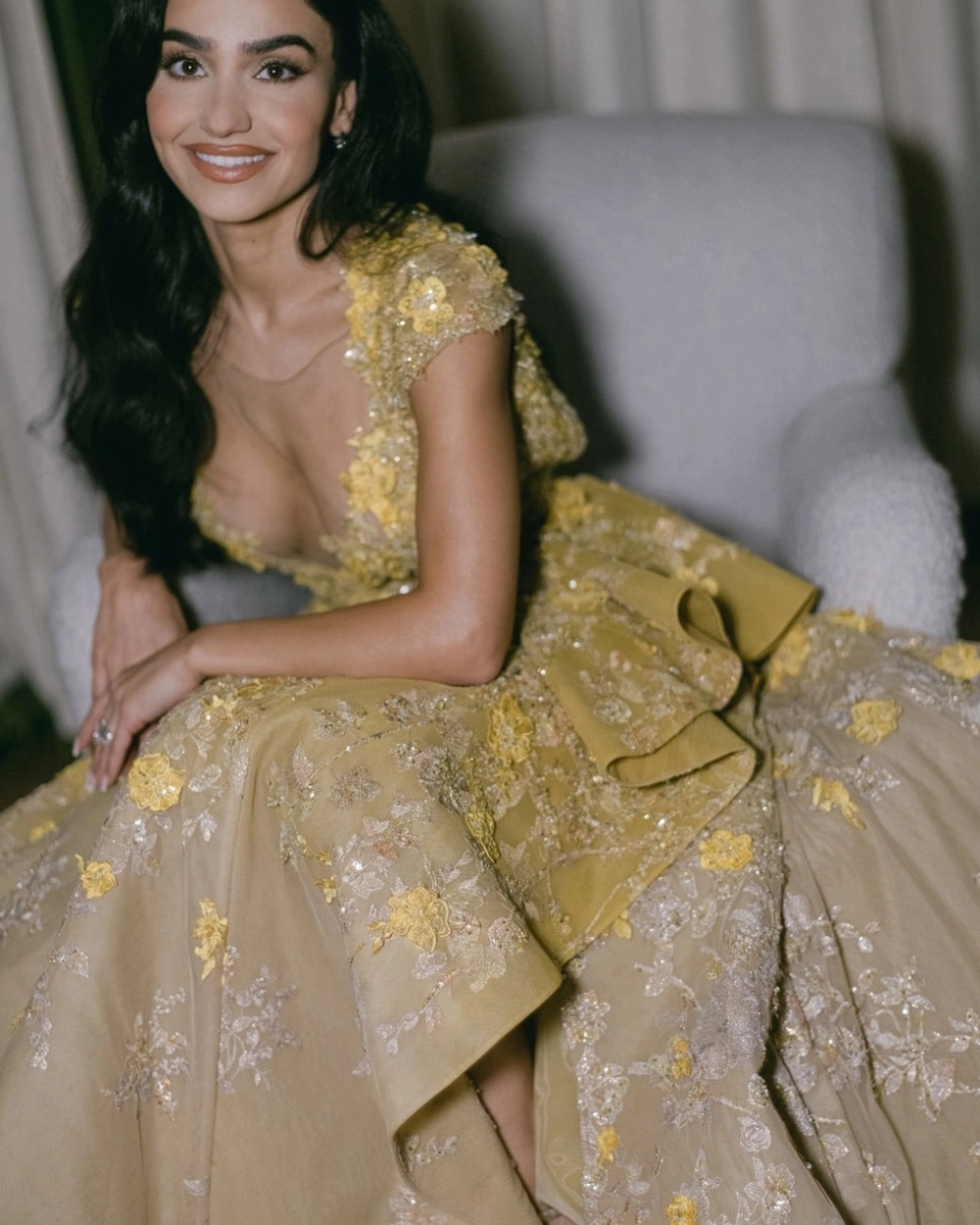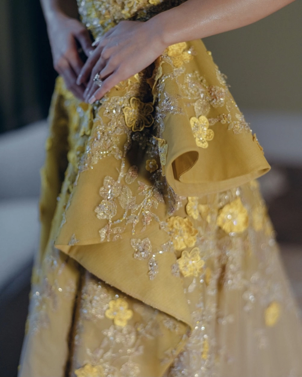 The big question mark for me was the welcome night look. I was stuck on what direction to take until our lovely photographer, Katie Julia, who has amazing style by the way, suggested I go away from classic bridal white and do something more bold and colourful as our theme was ‘English Garden Party’. I did a golden yellow Tony Ward gown with a plunging neckline, beading with floral appliqué, and painted lilac detailing. It was great advice and ended up being one of my favourite looks. Not to be outshone, David had his four outfit changes as well. Our guests all dazzled with vibrant colours, floral gowns, and unique prints for our welcome night, looking ever so iconic at our welcome garden party. Our wedding day was black tie and our guests were the picture of romance and elegance with beautiful gowns and tuxedos.
