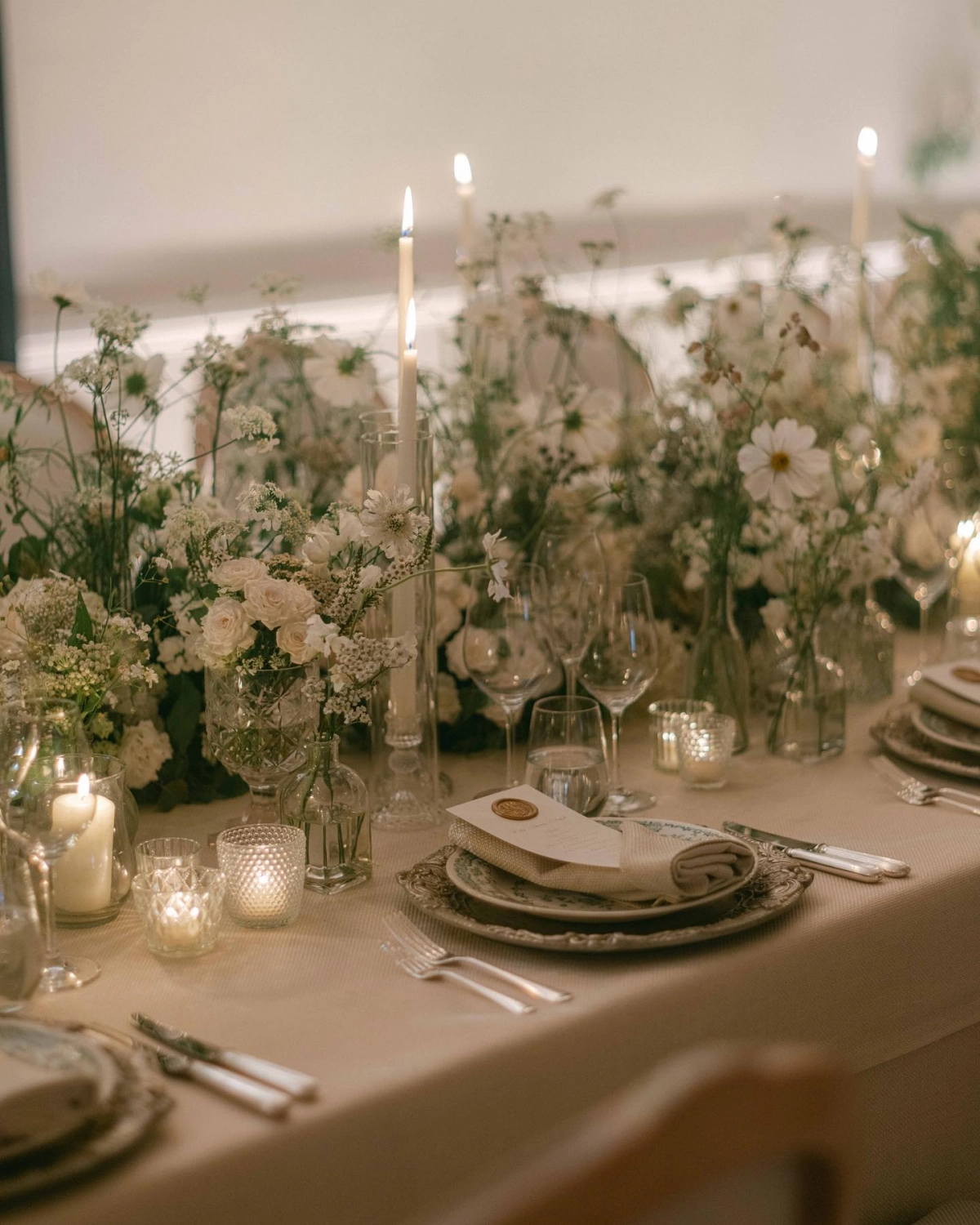 We wanted an English castle wedding with a cool party vibe, the overall guest experience was really important to us. We chose to take inspiration from our surroundings for the design, enhancing the idyllic countryside setting. To make sure each part of the day would suit its exact surroundings, we decided to split the wedding day into three. The ceremony was inspired by the River Thames, which was the backdrop. The concept here was for us to ‘walk on water’. We had a bespoke waterfall structure built at the top of the aisle. This was paired with a mirrored aisle with water troughs on either side. The reception concept was an English secret garden. We wanted to pull some inspiration from Dior and their ‘secret gardens’ for our design.