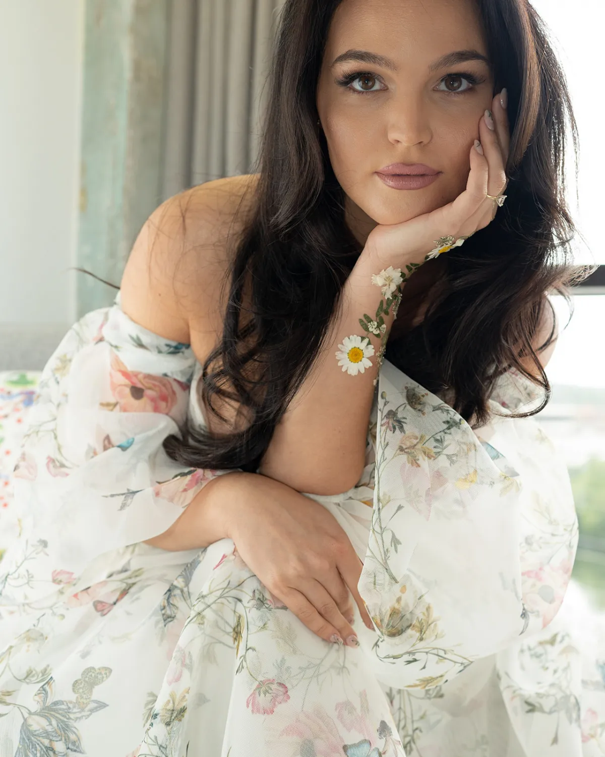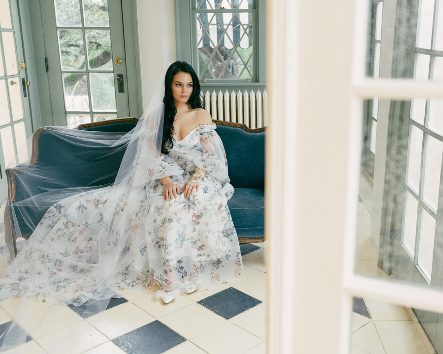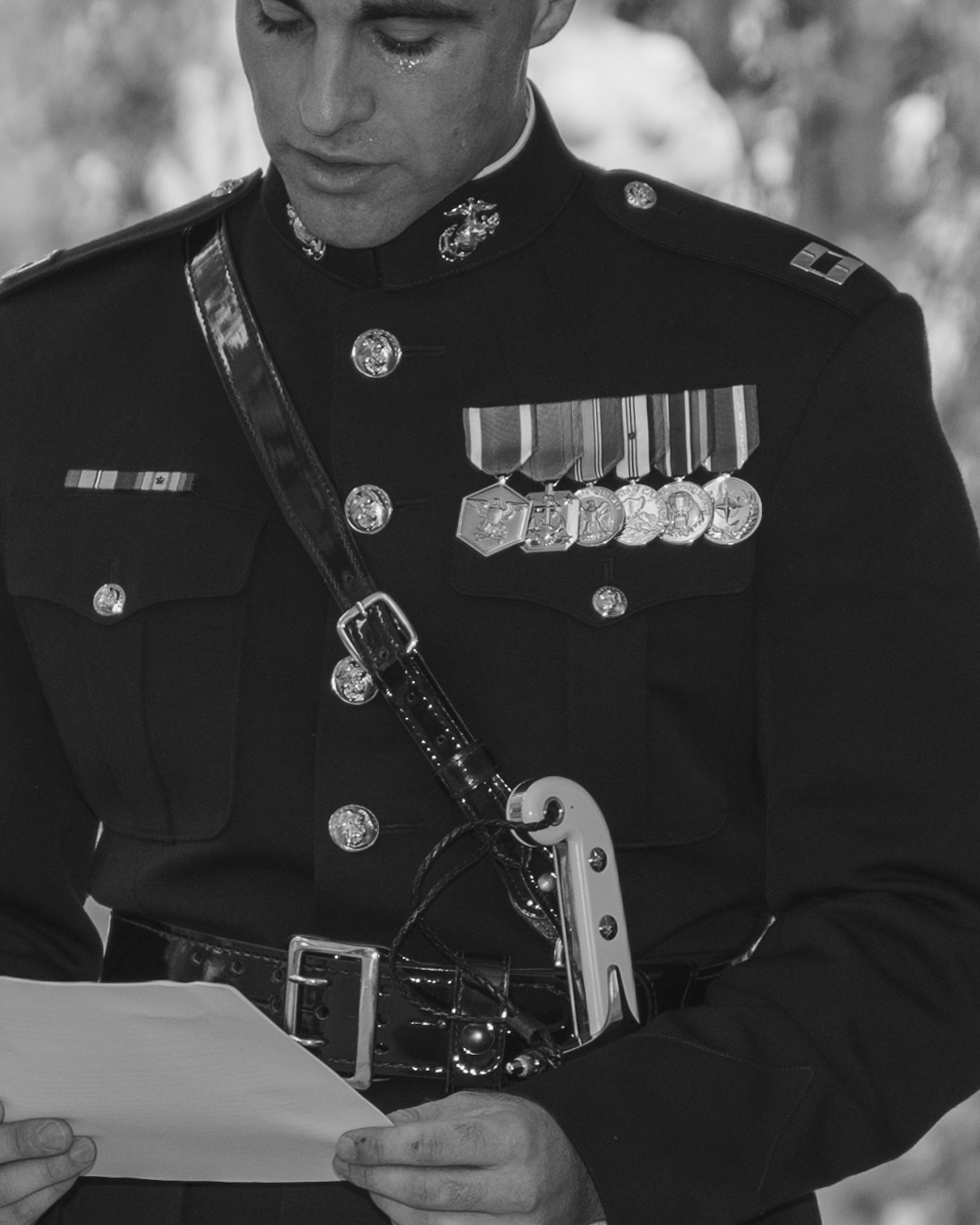 I went to Monique Lhuillier without a plan or expectations and really just wanted to see the incredible floral gowns up close. The third gown I tried on was the Jardin, and I fell in love with it immediately. Paige, an incredibly talented artist in Austin, handpainted my nails with the same butterfly and flower design as the dress. Patrick chose his Marine Corps dress blues and ceremonial sword. Our planner Cillia brought unique floral body art that we incorporated into my look as well.