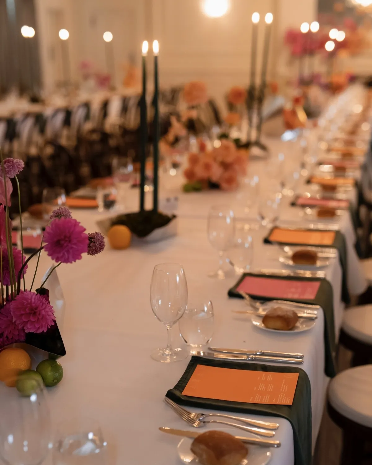 We worked with a fabulous event stylist and planner - Laice from Lb.Styling. The main brief focused on creating an elevated, mysterious and playful event. She had a hard task – the Pinterest board I created for the wedding was all over the place! Interiors, acrylic sculptures, art installations, homeware, fashion, and she did an amazing job of bringing them all together to create something cohesive. After a series of lengthy lockdowns, we were certainly excited to throw a big party. We drew inspo from the Great Gatsby and wanted to surprise our guests with entertainment throughout the night. Two synchronized swimmers entertained our guests during cocktail hour performing to 'Crazy in Love' by Jay Z and 'Young & Beautiful' by Lana del Ray - both of which were featured in the Baz Luhrman Great Gatsby soundtrack. We also had a saxophone player who weaved through the guests and led them from the ceremony space to the cocktail hour venue and again to the reception space once we were ready. Our color palette for the ceremony was white. Moving into cocktail hour and then the reception venue, we injected more color. We set the tables for dinner with forest green velvet napkins and custom-made 1-meter tall forest green candles. The florals, menus, and place settings were fuchsia and orange.
