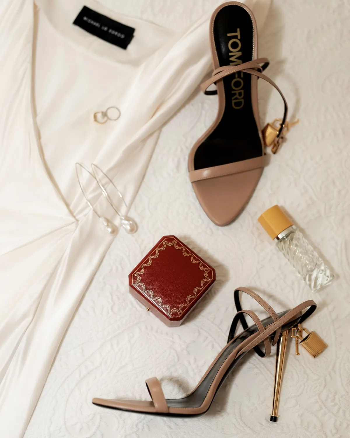 For jewelry, I kept it simple as I didn’t want to take away from the dress. The earrings I wore were from Pierre Winter. I like that these were a modern twist on a traditional bridal look. I wore Tom Ford nude lock sandals. I couldn't bring myself to buy white shoes as I wasn't sure I'd ever wear them again! They're a 10cm heel but my husband is 6'4 so I needed a bit of a boost! For my second gown, I sold the original Rachel Gilbert dinner dress and purchased a white Michael lo Sordo silk dress from Net-a-Porter (on sale!). I styled this with an ostrich feather boa, a crystal hairpin saying "taken," and simple crystal drop earrings.