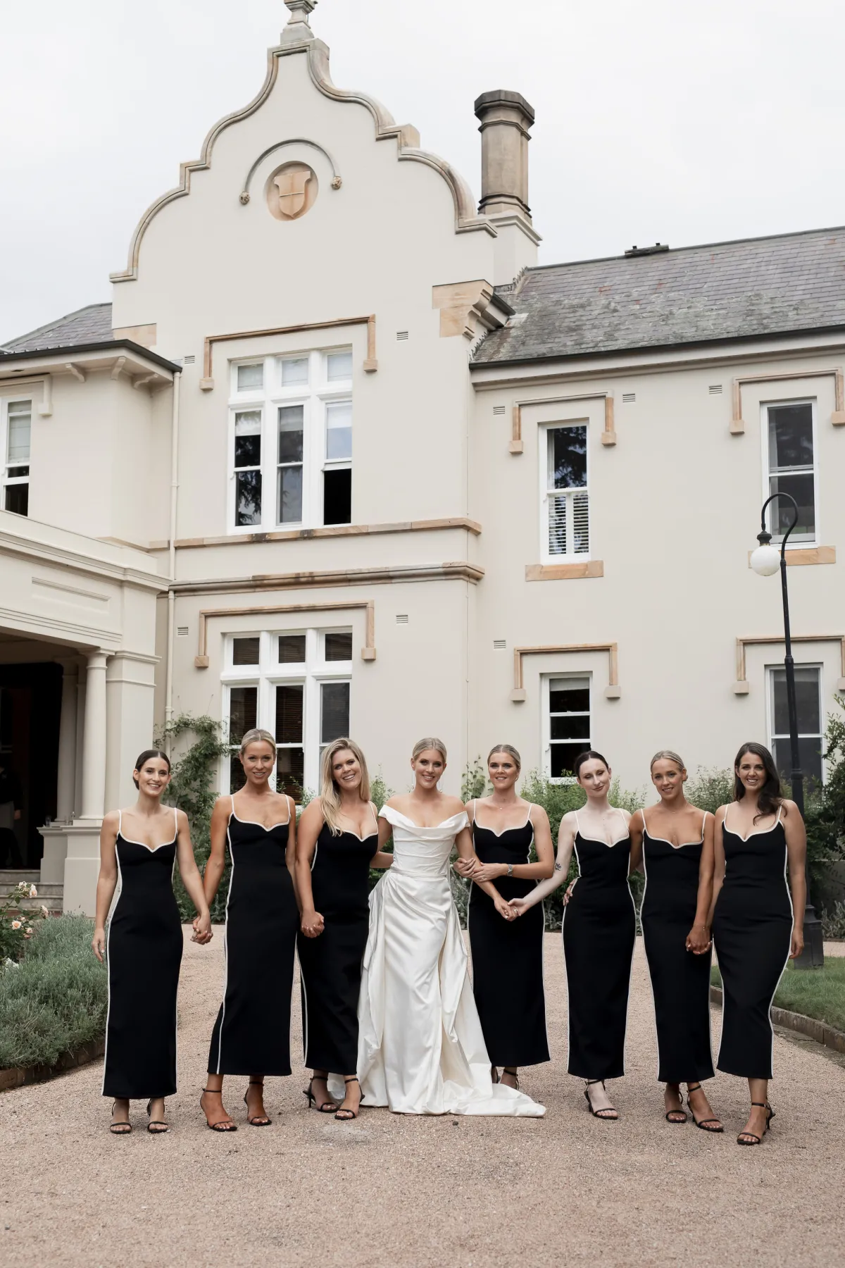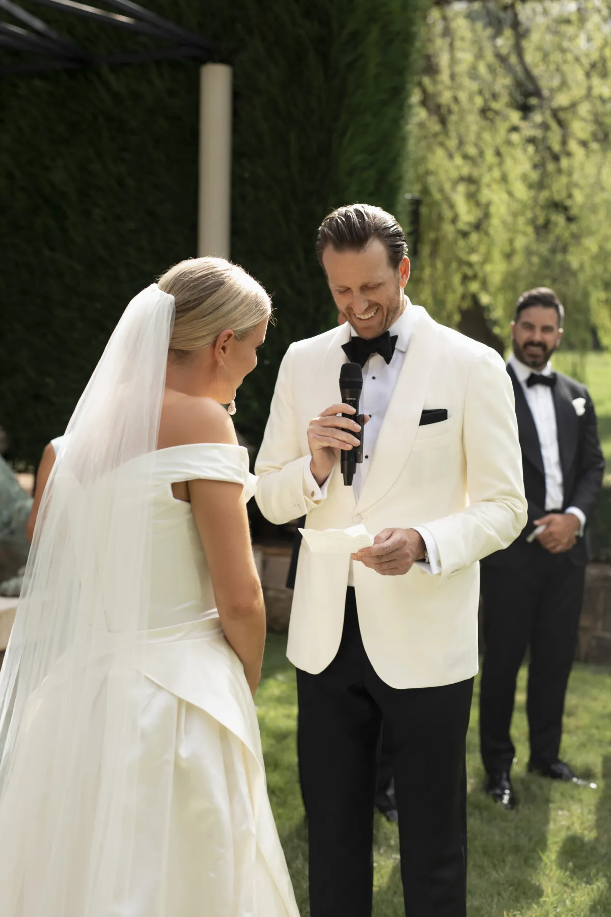 Our venue, Hopewood House, is the home of my favorite Australian artist, Tim Storrier. His paintings and sculptures are placed throughout the grounds and oscillate between the surreal and the real. It was important to us that the styling of the ceremony and reception spaces highlighted and matched his artworks as they are truly breathtaking to see in real life. We wanted to add to that “art gallery” feel and not distract from it. The gardens are whimsical and have that classic English garden feel to them, albeit interspersed with modern art sculptures. We’ve had a lot of rain in Sydney so the grass was beautifully lush and maybe a little wet! The venue is an hour and a half south of Sydney. My parents have a country home 10 minutes away from Hopewood; we knew we wanted to find a venue nearby as we had planned a recovery pool party for our guests the following day. Laice also styled this event for us and we went with a Slim Aaron’s vibe - a 70s Palm Springs color palette and sensibility.