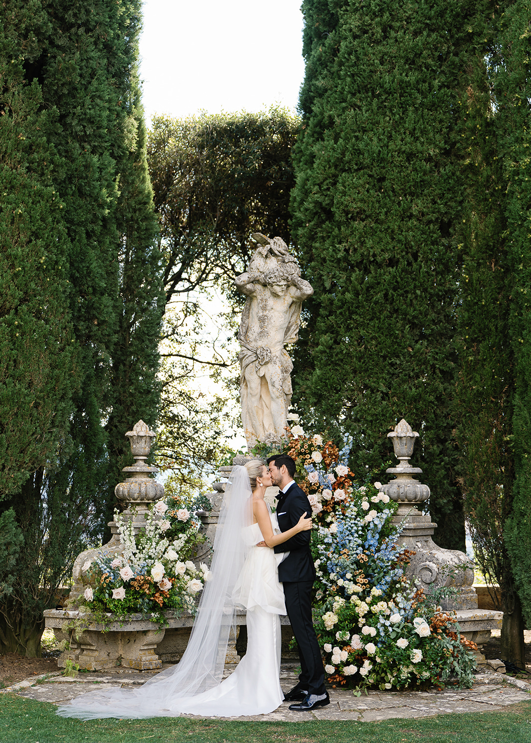Thinking about our budget and also sustainability, we wanted to have flowers that were local and easy to source. We worked with the amazing, internationally renowned Siloh Florals and they came up with a great flower concept for us after we told them what we liked. We had hues of green, blue, pastel, and burned orange and I absolutely loved the combination. Our main focus for the florals was our ceremony piece which intertwined with the garden statue at La Foce. I didn't want to have a bouquet as I wanted the dress to speak for itself!