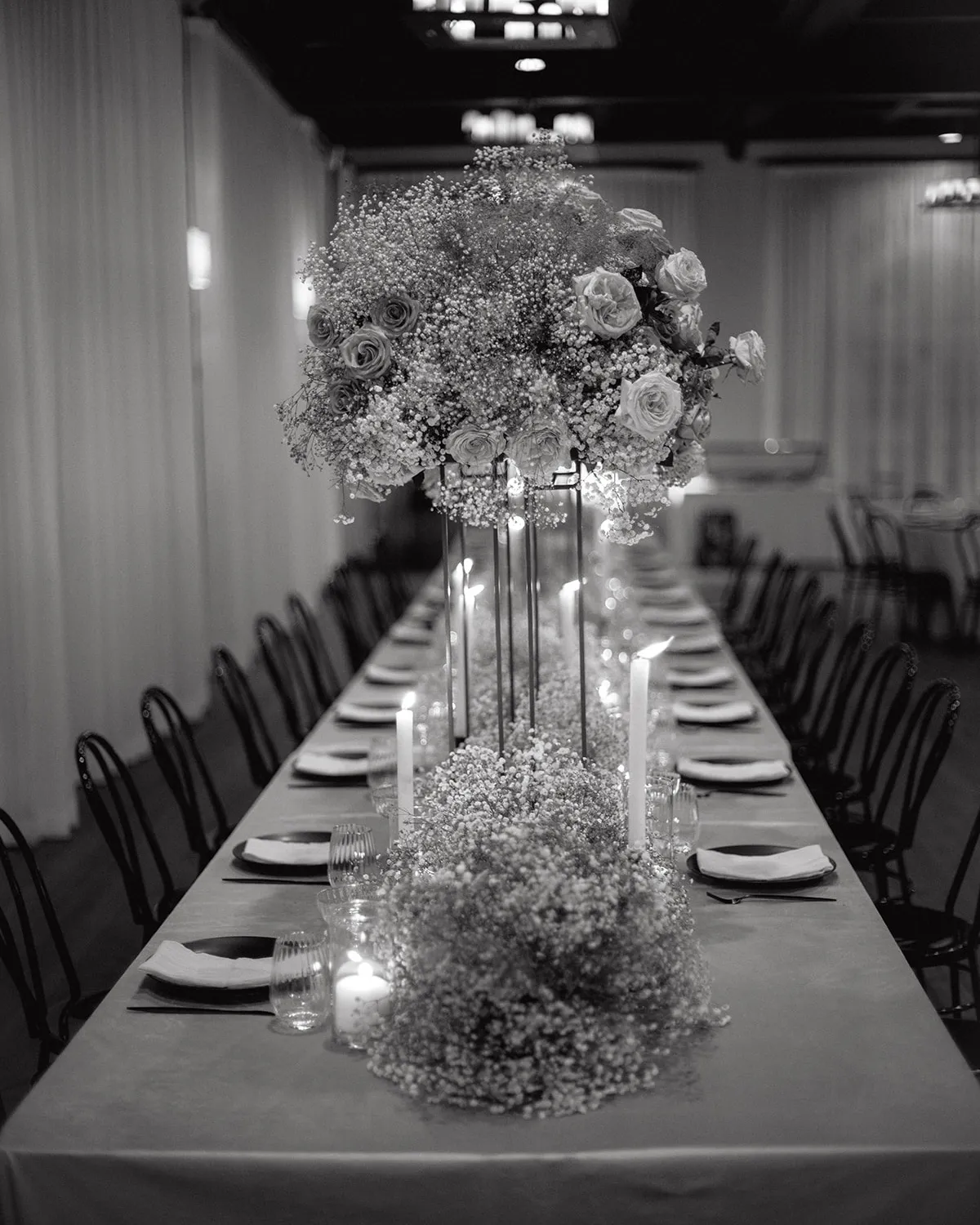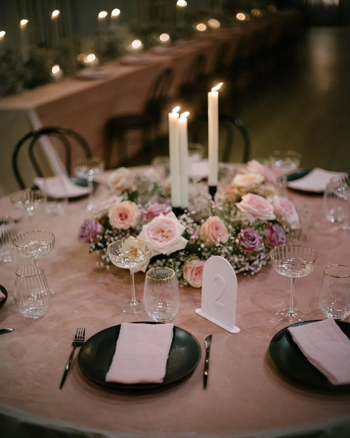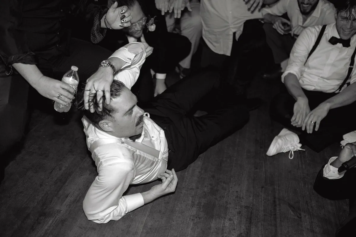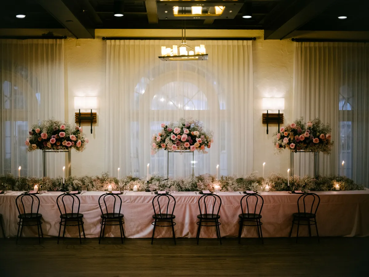 We wanted a fun and casual party weekend with all of our closest friends and family. I had this vision of creating a dream-like atmosphere using monochromatic colors and soft florals. I took inspiration from places I didn’t expect, like ruffled crinoline and sheer corsets from a Giorgio Armani Prive collection and the pastels and pink hues in Sofia Coppola’s 2001 film, Marie Antoinette. I made a lot of unorthodox design decisions, like creating custom dyed babies breath clouds and using oversized velvet fabric to cover the tables, but it came together like a beautiful dream. Our floral designer Monika blew us away with her creations. It looked like something out of a Wes Anderson film.
