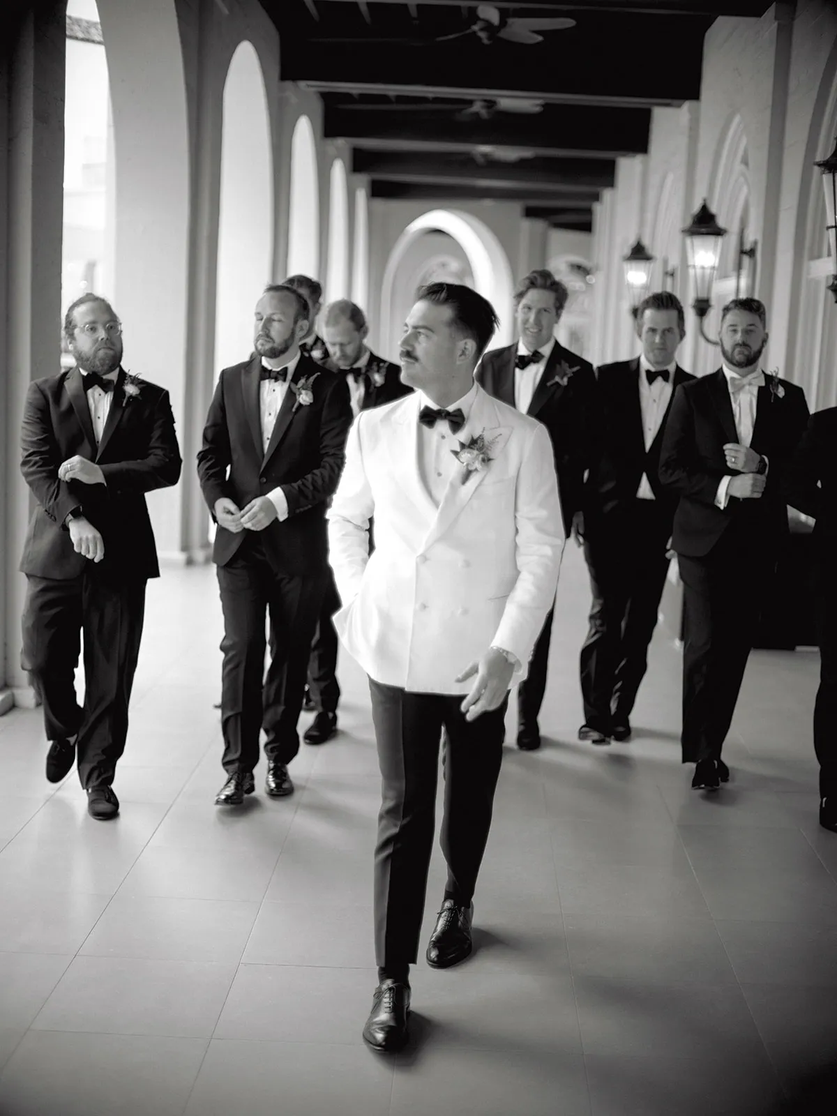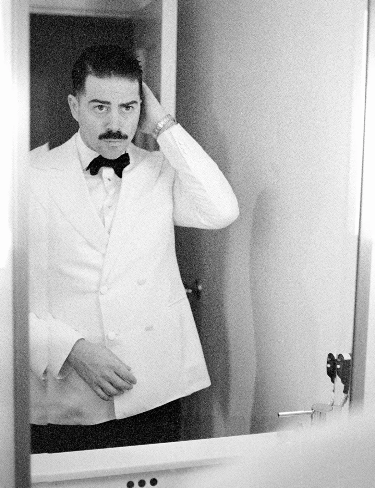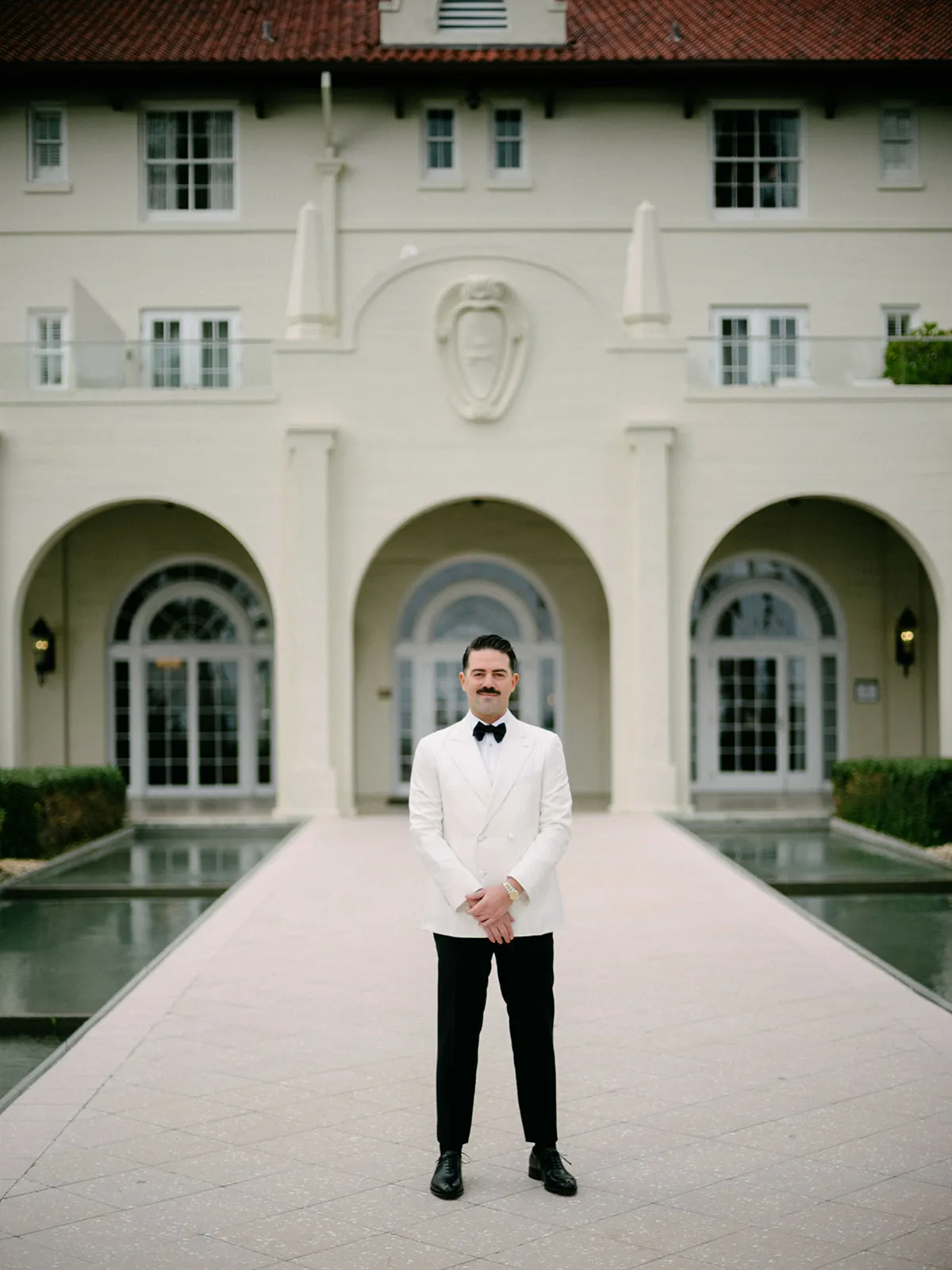 Alex had his suit custom made by an amazing New York Men’s atelier called JMueser. He worked with the designer to create a beautiful double breasted ivory suit jacket made of raw Italian silk. His pants were cut to a classical straight leg, the bow tie was voluminous black satin, and his shoes were plain toe Oxfords by Ferragamo.