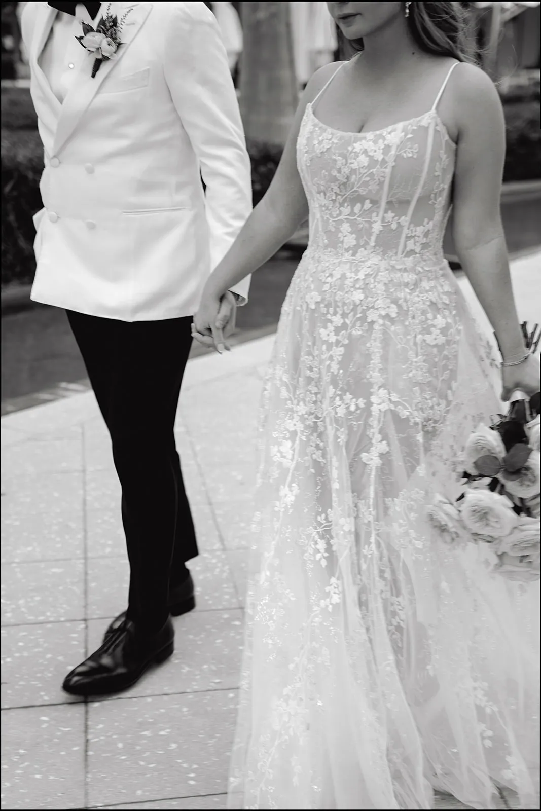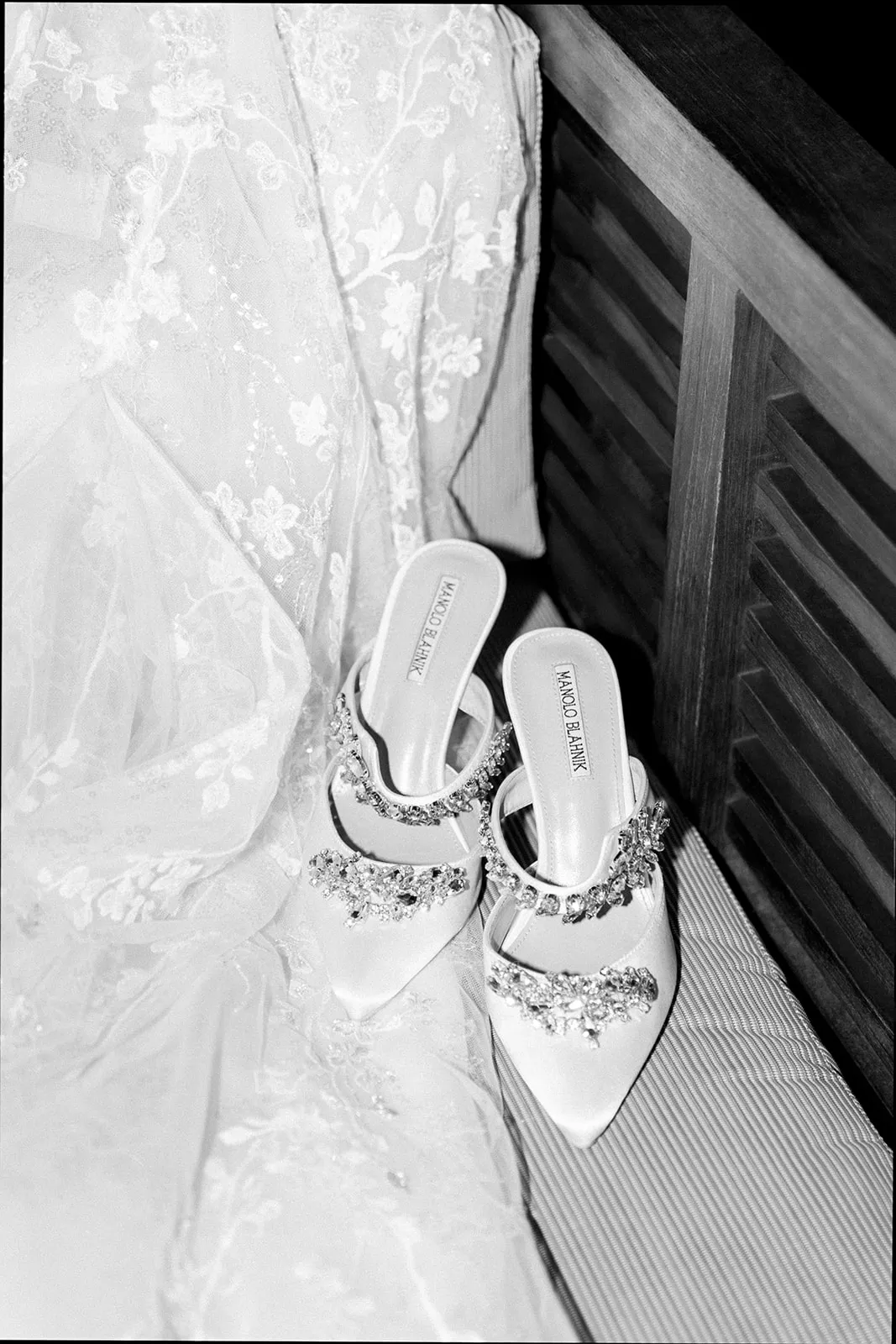 My dress was Galia Lahav. Originally, I wanted a simple silk bias cut silhouette, but then I came across this sheer lace dress and it was so beautiful I had to try it on just for fun. I ended up loving it so much I bought it moments later. Originally, it was long sleeves with a draped neckline and an extreme slit up to the hip. It was too much fabric on my small frame so I showed my seamstress a photo of my one of my favorite vintage Giambattista Valli gowns to use as a guide for the silhouette I wanted, she altered it to feature a sleeveless sheer corset top with thin straps and closed up the slit. I wore white satin Manolo Blahnik heels, and I borrowed my mother in laws custom made gold link bracelet that her parents gave to her as a child. It was so special to me.