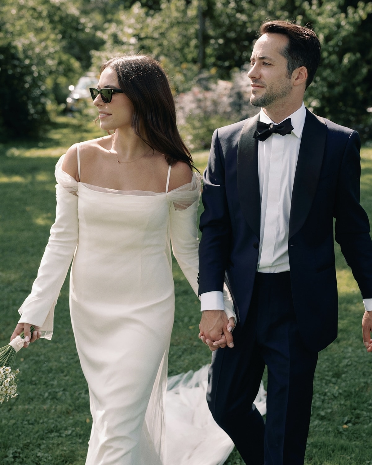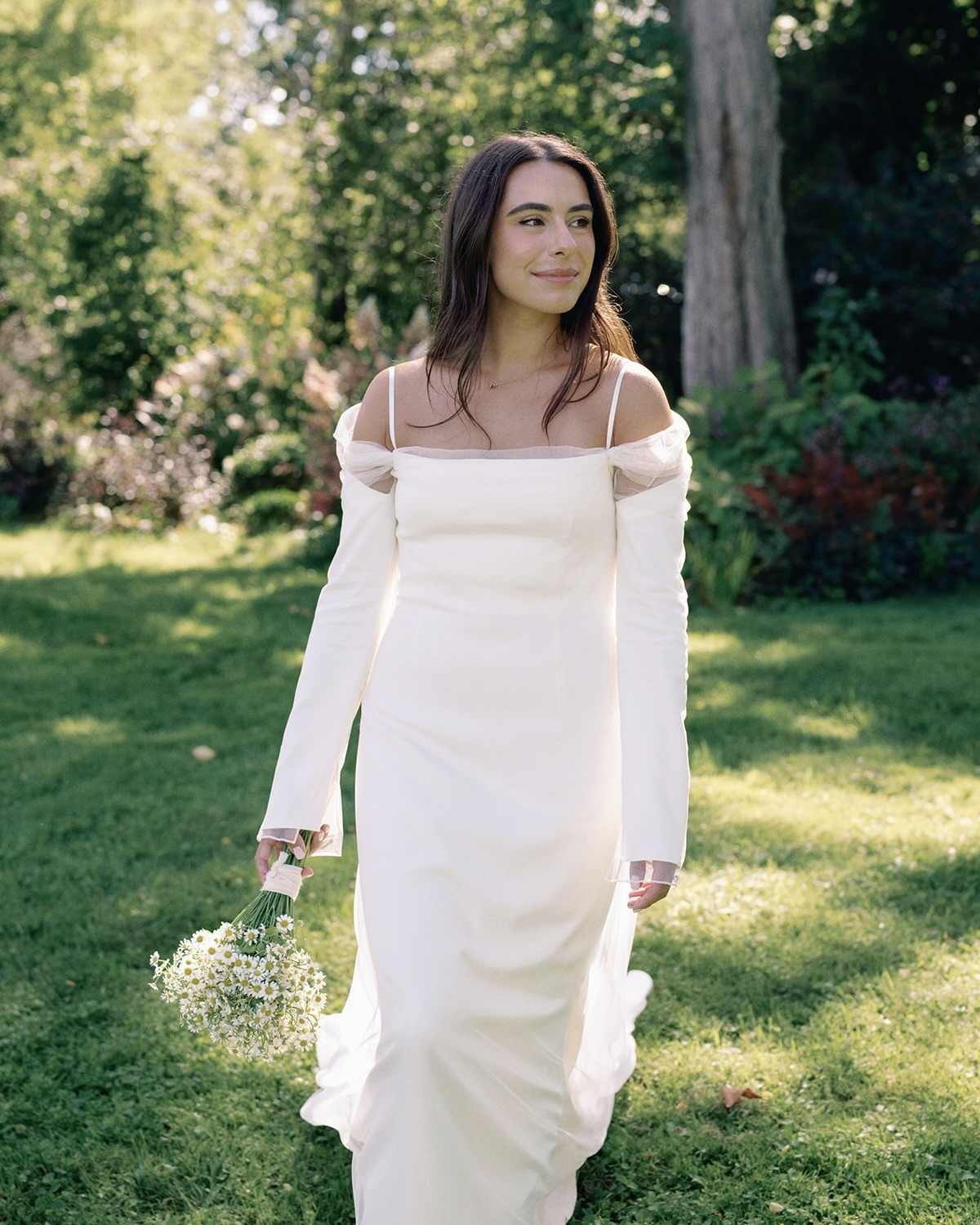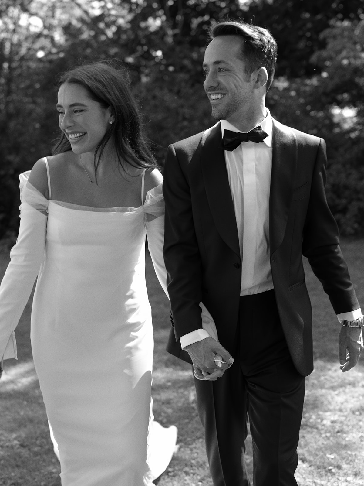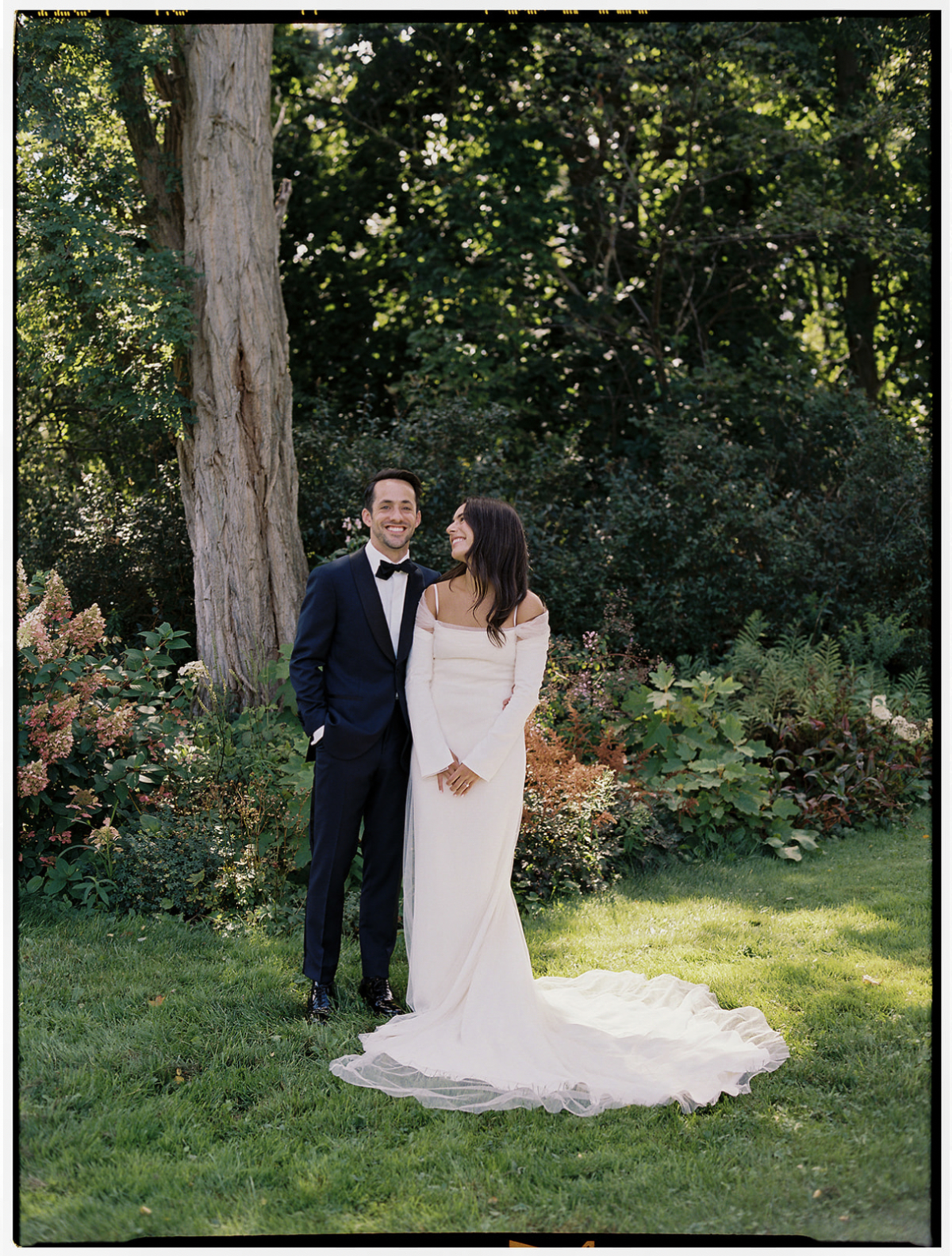 I love fashion, and I often found myself dreaming about what I would one day wear for my wedding, but when the time came to search for a dress I found the experience of deciding to be incredibly overwhelming! My first stop was Danielle Frankel, whose dresses are unbelievably stunning, but I didn't think I'd end up wearing one. I was pleasantly surprised when I left the first appointment narrowed down between two dresses. After visiting a couple of other designers, nothing compared to the two gowns I had my eye on. When I returned to Danielle Frankel for a second appointment, I landed on the Leona gown. It was most important to me that I felt physically comfortable and the most like myself in whatever I wore, and the Leona was perfect. It was an off-the-shoulder gown, with a square neckline and a tulle overlay that was gathered at the top of each sleeve. I loved how simple it was with the tulle adding a little something extra. Truthfully, I never felt that connected to being a "bride", and a veil felt a little too bridal for me, so I opted to go without one. When the day came, I felt like I had chosen the dress I was meant to wear, which was the goal all along! I kept the jewelry simple with diamond studs I borrowed from Will's sister and a dainty gold necklace with a ruby pendant that was passed down to me by my grandma. Will wore a deep navy tux from Suit Supply, and looked so handsome. For the rehearsal dinner, I knew I didn't want to wear white. I came across this fuchsia, silk, halter-neck gown by Azeeza on Poshmark and fell in love with it! Our rehearsal dinner was in Will's parent's backyard and I liked the idea of the fuschia dress against the green grass. I paired the gown with olive green Staud mules, and simple hoop pearl earrings by Jennifer Behr. Will wore an off-white checked blazer with off-white pants from Suit Supply and white sneakers.