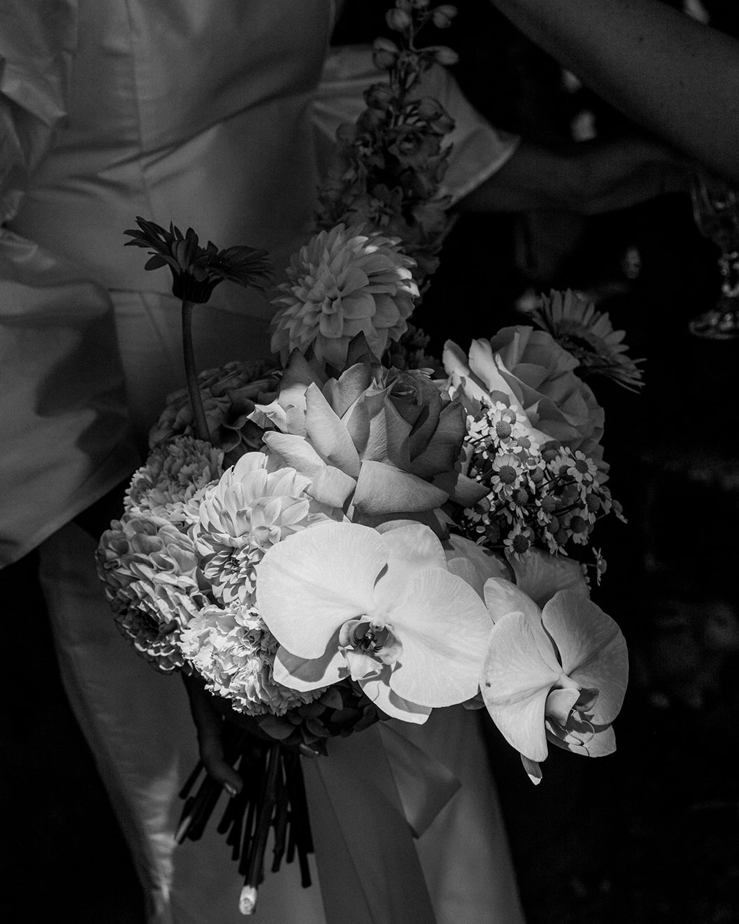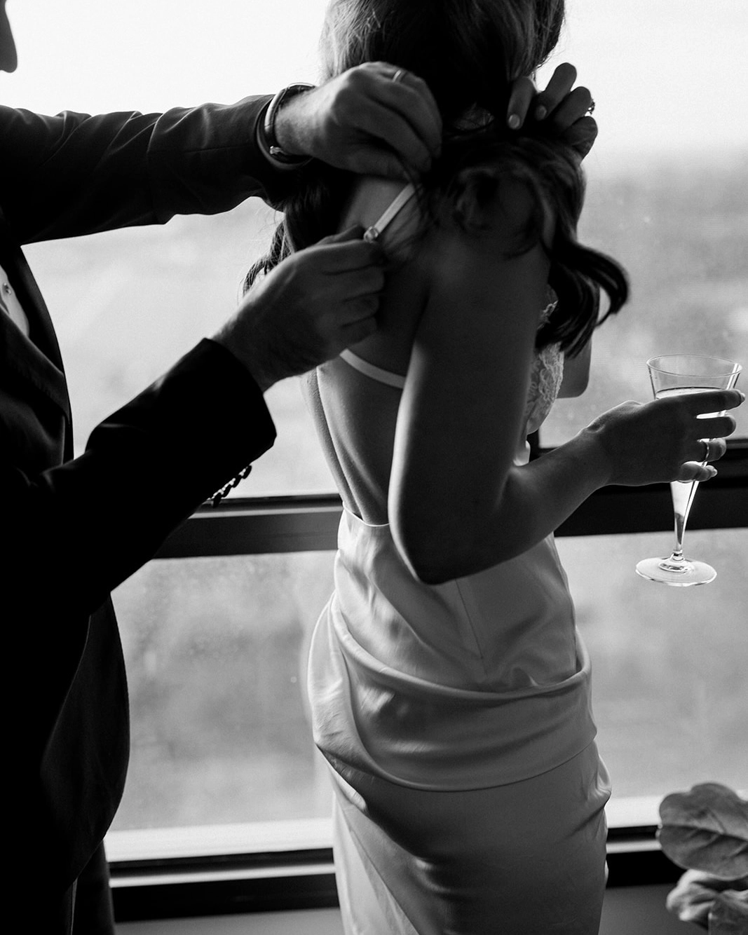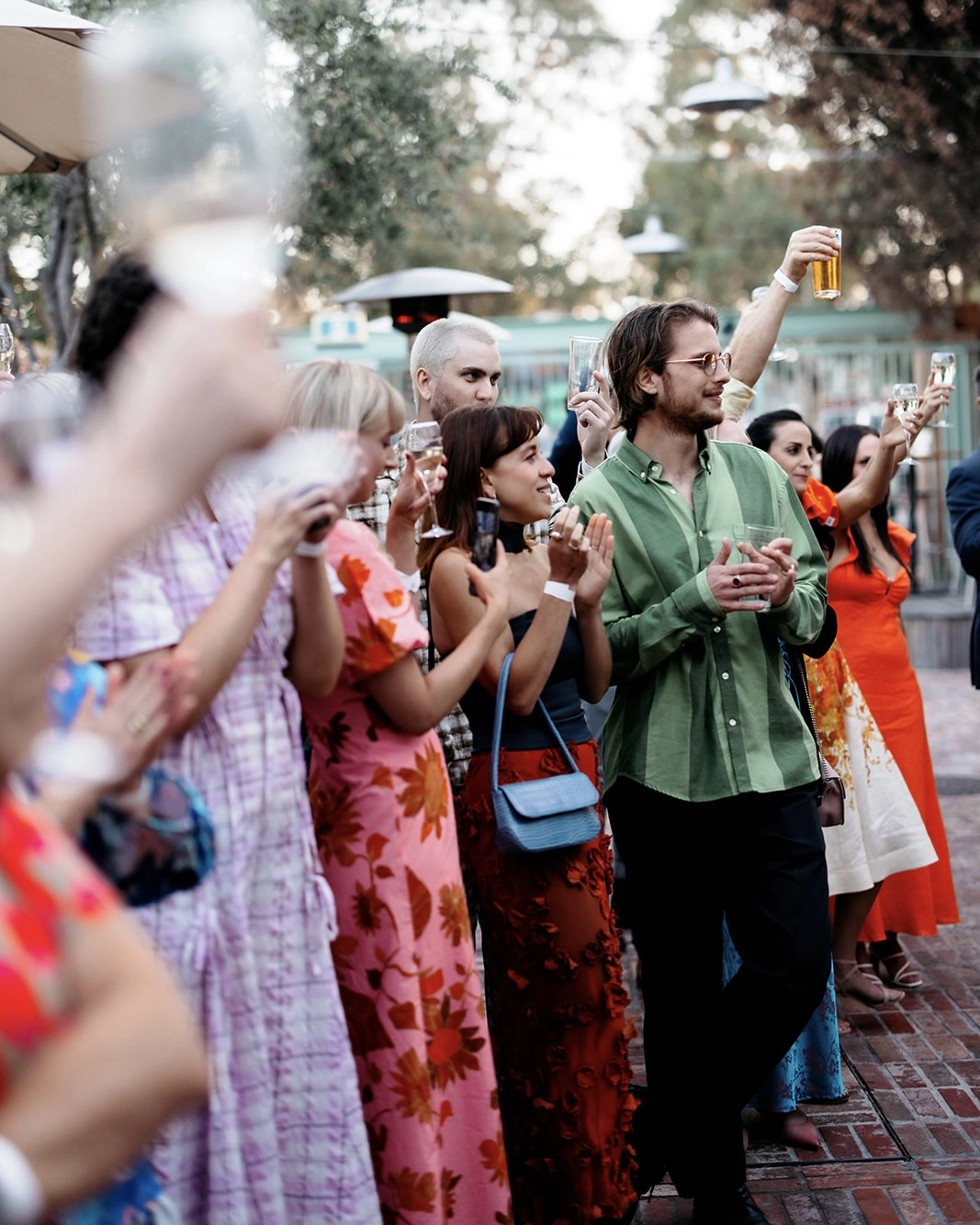 My second outfit was a dress by Jacquemus and was fluid and sculpted to my body. This was a more relaxed step change from my ceremony outfit and catered towards a warm summer night of dancing. I kept this as a surprise from everyone, even my two best friends. The moment I tried it on, I knew it was perfect. However - the highlight of the outfit was definitely the shoes. I wasn't necessarily searching for ‘something blue’ but when I saw the Amina Muaddi Rosie slingback heels I knew they were just perfect. The statement pop of colour and the way the crystal bows caught the light was a detail that turned out better than I could have ever imagined. Topped off with a pair of Pearl and blue resin drop earrings by completed works. Mike is a bit more classic and timeless in his style and was fitted for a tuxedo at MJ Baele. He had owned a few suits from them in the past and has always loved their quality and fit. This was an easy decision for him and he was super happy.