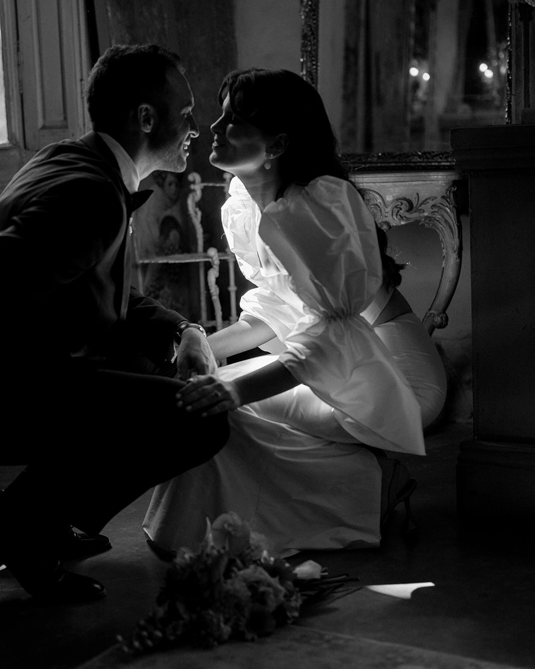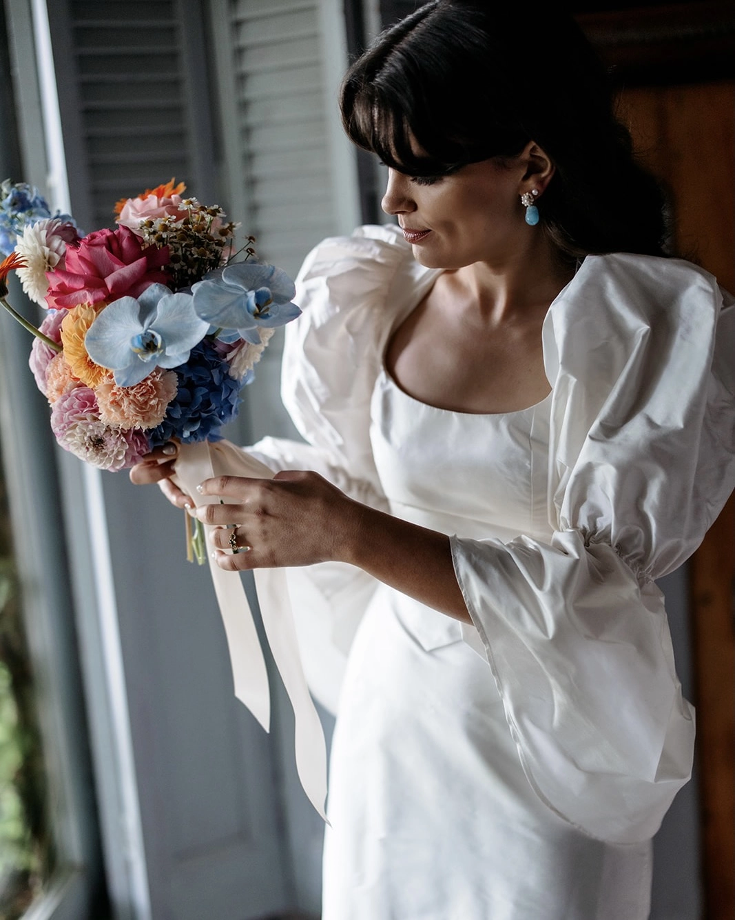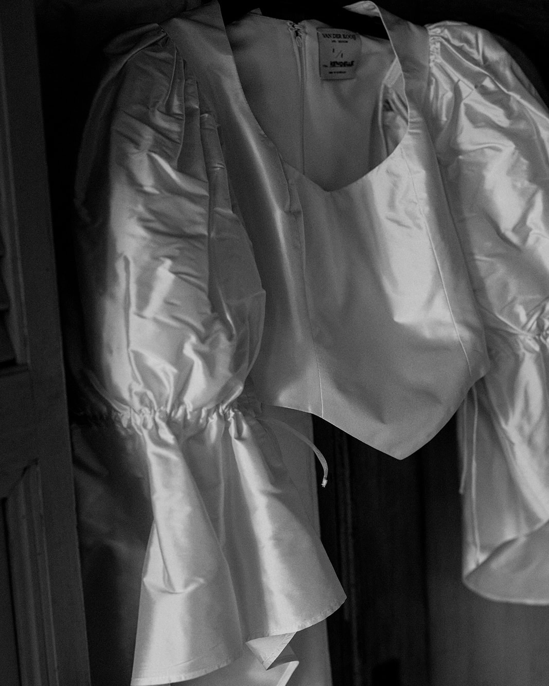 I work in fashion and have a deep appreciation for colour, texture and beautiful fabrications, so I naturally had a lot of ideas and mood boards going on in the beginning. I wanted to find something that was fashion-forward and directional, and wasn’t interested in anything too traditional. My two closest friends were a big support in helping to refine my choices. I loved the idea of upcycling a vintage dress as this is a huge passion of mine, but I hadn’t come across anything quite right during my search. Van Der Kooij was a local designer that I had followed for a little while and I was drawn to her beautiful statement silk dupion sleeves. My instincts were right. The second I tried the sleeves on I fell in love and it just felt like me. I remember leaving and calling my friend so elated that I had found the outfit. Natasha worked with me to customise the details and she was such a dream to work with. The two piece was made to order and toiled to my body measurements, which made the process even more special and intimate. I love to create, so I crafted my handbag by sourcing a vintage bag from Depop in the shape I was looking for as the base. I covered it in a floral embossed jacquard fabric I had lying around. Then finished the handles with some of the off cuts of the silk Dupion fabric from Natasha.
